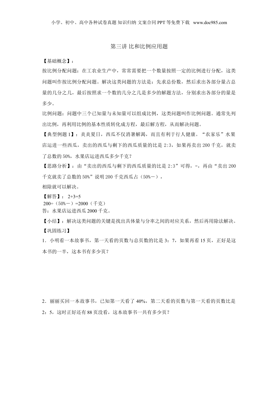 小学、初中、高中各种试卷真题知识归纳文案合同PPT等免费下载www.doc985.com第三讲比和比例应用题【基础概念】:按比例分配问题:在工农业生产中,常常需要把一个数量按照一定的比例进行分配,这类问题叫作按比例分配问题。解决这类问题的方法是:先求总份数,然后求出各部分量占总量的几分之几,最后按照求一个数的几分之几是多少的解题方法,分别求出各部分的量是多少。比例问题:问题中三个已知量与未知量可以组成比例,这类问题叫作比例问题。通常先列出比例,再利用比例的基本性质转化成方程,最后解方程,从而解决问题。【典型例题1】:炎炎夏日,西瓜不仅消暑解渴,而且有利于行人健康。“农家乐”水果店运进一些西瓜,卖出的西瓜与剩下的西瓜质量的比是2:3,如果再卖出200千克,就卖了总数的50%,水果店运进西瓜多少千克?【思路分析】:由“卖出的西瓜与剩下的西瓜质量的比是2:3”可得,=,再由“卖出200千克就卖了总数的50%”说明200千克西瓜占(50%-),相除就可以解决。【解答】:2+3=5200÷(50%-)=2000(千克)答:水果店运进西瓜2000千克。【小结】:解决这类问题的关键是找出具体量与分率之间的对应关系,然后再用除法解决。【巩固练习】1.小明看一本故事书,第一天看的页数与总页数的比是3:7,如果再看15页,正好是这本书的一半,这本书有多少页?2.丽丽买回一本故事书,已知第一天看了40%,第二天看的页数与第一天看的页数比是2:5,这时正好还有88页没看,这本故事书一共有多少页?小学、初中、高中各种试卷真题知识归纳文案合同PPT等免费下载www.doc985.com【典型例题2】:学校会议室用方砖铺地,用8平方分米的方砖铺,需要350块,如果改用10平方分米的方砖铺,需要多少块?(用比例知识解答)【思路分析】:会议室地面的面积一定,不论用多大的砖铺,地面面积都不会变化,并且每块砖的面积越大,需要的块数越少,因此,每块砖的面积与需要的块数成反比例关系,即可设需要x块,10x=350×8。【解答】:解:设需要x块。10x=350×8X=240答:需要240块。【小结】:解决此类问题的关键是找到问题中的量成什么关系,然后列出方程再解决。【巩固练习】3.李老师家用方砖铺书房地面,用边长2分米的方砖铺,需要350块;如果改用10平方分米的方砖铺,需要多少块?4.学校买来一批书,如果每包20本,要捆18包,如果每包30本,要捆多少包?5.我校食堂买来900千克大米,6天吃了180千克,照这样计算,剩下的还能吃几天?答案及解析1.【解析】第一天看的页数与总页数的比是3:7,也就是第一天看了总页数的,如果再看小学、初中、高中各种试卷真题知识归纳文案合同PPT等免费下载www.doc985.com15页,正好是这本书的,那么15页占这本书总页数的(-),求这本书有多少页,列式为15÷(-),即可解决问题。【答案】15÷(-)=15×14=210(页)答:这本书有210页。2.【解析】把全书的总页数看作单位“1”,第一天看了40%,第二天看的页数与第一天看的页数比是2:5,则第二天看的页数是第一天看的页数的,也就是全书的40%×,还剩下的88页就占全书的(1-40%-40%×),由此用除法可求得这本故事书一共有多少页。【答案】88÷(1-40%-40%×)=88÷(1-0.4-0.16)=88÷0.44=200(页)答:这本故事书一共有200页。3.【解析】书房的地面面积不变,因此用的块数与砖的面积成反比例关系,所以列出比例,解方程即可。【答案】:解:设需要多少块。10x=2×2×350X=140答:需要140块。4.【解析】学校买来的书的总数不变,每包的本数×要捆的包数=买来的书的总数,因此每包的本数与要捆的包数成反比例关系,因此列出方程即可解决。【答案】:解:设要捆x包。30x=20×18x=12答:要捆x包。5.【解析】由于每天吃的大米数量不变,每天吃的大米数量=大米的总量:吃的天数。【答案】:解:设剩下的还能吃x天,(900-180):x=180:6180x=6×720X=24答:剩下的还能吃24天。小学、初中、高中各种试卷真题知识归纳文案合同PPT等免费下载www.doc985.com