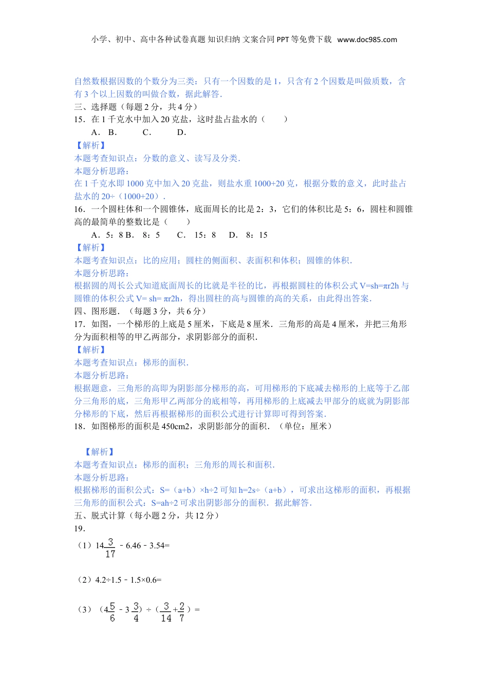 小学、初中、高中各种试卷真题知识归纳文案合同PPT等免费下载www.doc985.com名校小升初数学模拟试卷完成时间90分钟满分100姓名:分数:一、填空题:(每空1分,共16分)1.我国在2005年人口普查是十二亿六千零九万,它写作_________,把它四舍五入到亿位约是_________.【解析】本题考查知识点:整数的读法和写法;整数的改写和近似数.本题分析思路:(1)整数的写法:从高位到低位,一级一级地写,哪一个数位上一个单位也没有,就在那个数位上写0;据此写出;(2)把它四舍五入到亿位,要把亿位的下一位数字进行四舍五入,同时带上“亿”字.2.6立方分米7立方厘米=_________立方厘米2时15分=_________时.【解析】本题考查知识点:体积、容积进率及单位换算;时、分、秒及其关系、单位换算与计算.本题分析思路:把6立方分米7立方厘米换算成立方厘米数,先把6立方分米换算成立方厘米数,用6乘进率1000,得数再加上7;把2时15分换算成时数,先把15分换算成时数,用15除以进率60,得数再加上2.3.把2:1化成最简整数比是_________,比值是_________.【解析】本题考查知识点:所有求比值和化简比.本题分析思路:(1)根据比的基本性质作答,即比的前项和后项同时乘一个数或除以一个数(0除外)比值不变;(2)用比的前项除以后项即可.4.52和130的最大公约数是_________,24、28和42的最小公倍数是_________.【解析】本题考查知识点:求几个数的最大公因数的方法;求几个数的最小公倍数的方法.本题分析思路:分别把两组数分解质因数,用它们公有的质因数相乘得它们的最大公因数,它们公有的质因数和独有的质因数相乘的它们的最小公倍数.5.一幅地图,图上10厘米表示实际距离30千米,这幅地图的比例尺是_________.【解析】本题考查知识点:比例尺本题分析思路:利用“图上距离与实际距离的比即为比例尺”即可求得这幅地图的比例尺.6.在、6.25%、65%、0.625和0.62这五个数中,最大的数是_________,最小的数是_________.【解析】本题考查知识点:比例尺本题分析思路:利用“图上距离与实际距离的比即为比例尺”即可求得这幅地图的比例尺.7.2里面有_________个,0.87里面有_________个0.01.【解析】本题考查知识点:分数的意义、读写及分类;小数的读写、意义及分类.小学、初中、高中各种试卷真题知识归纳文案合同PPT等免费下载www.doc985.com本题分析思路:(1)把化成假分数,看分子是几就含有几个;(2)0.87里面有多少个0.01,用0.87÷0.01即可解答.8.一个圆锥体,底面周长是12.56厘米,高2.4厘米,它的体积是_________立方厘米.【解析】本题考查知识点:比例尺本题分析思路:利用“图上距离与实际距离的比即为比例尺”即可求得这幅地图的比例尺.9.除数是,被除数与商的差是14,被除数是_________.【解析】本题考查知识点:分数的四则混合运算;加法和减法的关系.本题分析思路:依据一个不为0的数除以一个小于1且大于0的数,商大于被除数,以及除数是5/7<1,可设被除数是x,那么商就是x+14,依据被除数=除数×商可列方程:x=5/7×(x+14),依据等式的性质即可求解.10.一个长方体,如果高增加2厘米就成了正方体,而且表面积要增加56平方厘米,原来这个长方体的体积是_________.【解析】本题考查知识点:长方体和正方体的表面积;长方体和正方体的体积.本题分析思路:根据题意可知,一个长方体如果高增加2厘米,就变成了一个正方体;说明长和宽相等且比高大2厘米,因此增加的56平方厘米是4个同样的长方形的面积和;由此可以求长方体的长=(56÷4)÷2=7厘米,由于长比高多2厘米,那么高=7﹣2=5厘米,由此解答.二、判断(每题1分共4分)对的打∨,错的打×11.X=0.8是方程3X﹣1.6=0.8的解._________.(判断对错)【解析】本题考查知识点:方程的解和解方程.本题分析思路:把x=0.8代入方程,看左边和右边是否相等,如果相等则x=0.8是方程的解,不相等就不是方程的解.12.时间一定,路程和速度成正比例._________.(判断对错)【解析】本题考查知识点:辨识成正比例的量与成反比例的量.本题分析思路:由“速度×时间=路程”可得“(定值)”,从而...
