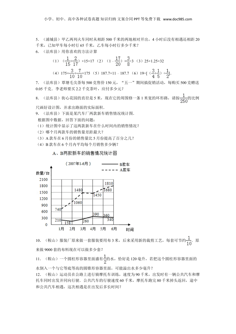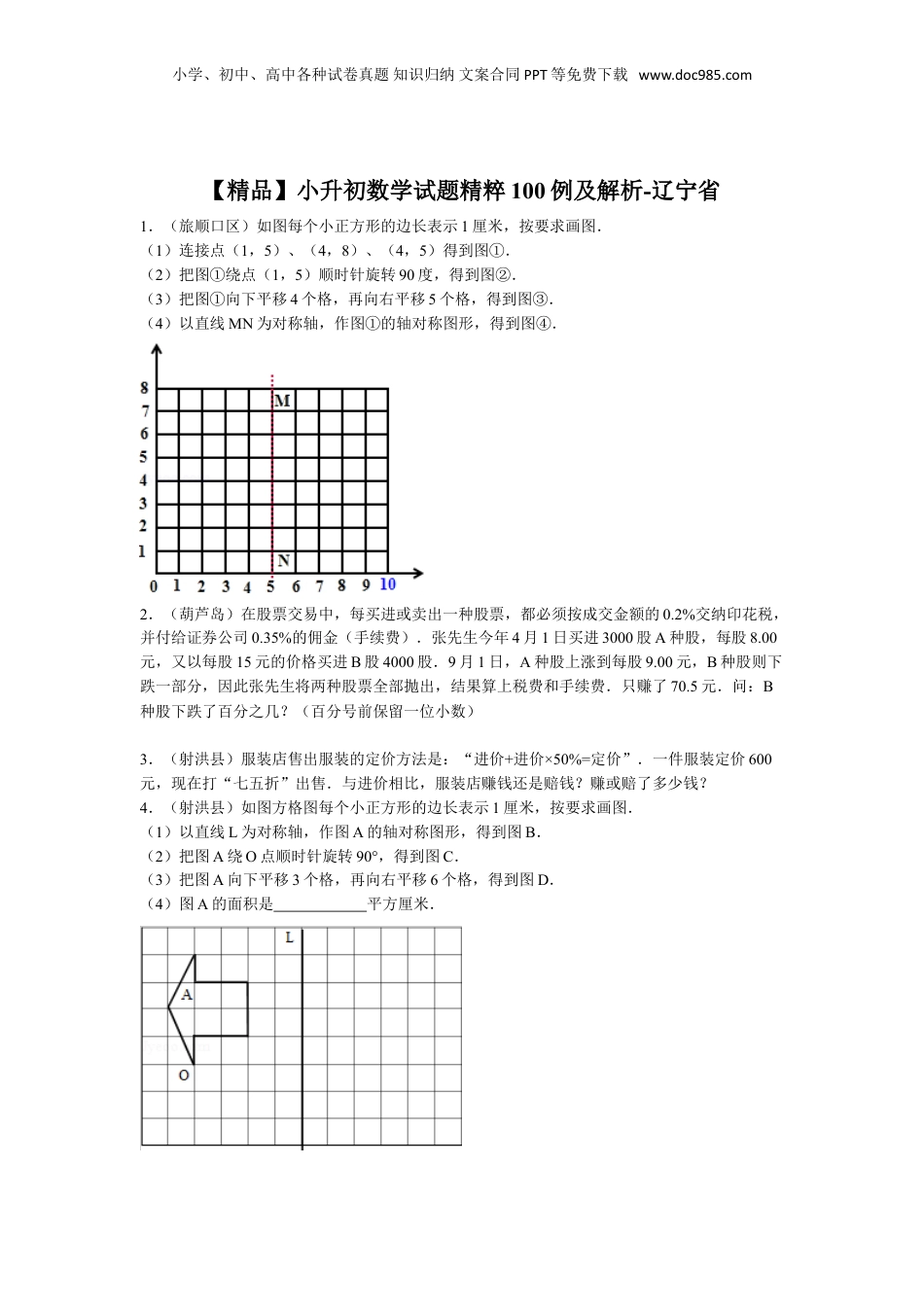 小学、初中、高中各种试卷真题知识归纳文案合同PPT等免费下载www.doc985.com【精品】小升初数学试题精粹100例及解析-辽宁省1.(旅顺口区)如图每个小正方形的边长表示1厘米,按要求画图.(1)连接点(1,5)、(4,8)、(4,5)得到图①.(2)把图①绕点(1,5)顺时针旋转90度,得到图②.(3)把图①向下平移4个格,再向右平移5个格,得到图③.(4)以直线MN为对称轴,作图①的轴对称图形,得到图④.2.(葫芦岛)在股票交易中,每买进或卖出一种股票,都必须按成交金额的0.2%交纳印花税,并付给证券公司0.35%的佣金(手续费).张先生今年4月1日买进3000股A种股,每股8.00元,又以每股15元的价格买进B股4000股.9月1日,A种股上涨到每股9.00元,B种股则下跌一部分,因此张先生将两种股票全部抛出,结果算上税费和手续费.只赚了70.5元.问:B种股下跌了百分之几?(百分号前保留一位小数)3.(射洪县)服装店售出服装的定价方法是:“进价+进价×50%=定价”.一件服装定价600元,现在打“七五折”出售.与进价相比,服装店赚钱还是赔钱?赚或赔了多少钱?4.(射洪县)如图方格图每个小正方形的边长表示1厘米,按要求画图.(1)以直线L为对称轴,作图A的轴对称图形,得到图B.(2)把图A绕O点顺时针旋转90°,得到图C.(3)把图A向下平移3个格,再向右平移6个格,得到图D.(4)图A的面积是平方厘米.小学、初中、高中各种试卷真题知识归纳文案合同PPT等免费下载www.doc985.com5.(浦城县)甲乙两列火车同时从相距500千米的两地相对开出,4小时后没有相遇还相距20千米,已知甲车每小时行65千米,乙车每小时行多少千米?6.(法库县)用你喜欢的方法计算(1)(+)×15×17(2)(1﹣)×÷3(3)25×1.25×32(4)175×+×175(5)187.7×11187.7﹣(6)19÷[(+)÷].7.(法库县)覃塘毛尖茶每500克售价150元,“五一”期间搞促销活动,每购买500克赠送0.05千克.李老师要买2.2千克茶叶,应付多少元?8.(法库县)街心花园的直径是5米,现在它的周围修一条1米宽的环形路,请按的比例尺画好设计图,并求出路面的实际面积.9.(法库县)下面是某汽车厂两款新车销售情况统计图.根据图中数据,回答下面的问题:(1)统计图中显示了这两款新车在什么时间内的销售情况?(2)哪个月两款车的销售量差距最大?(3)A款车在6月份的销售量比5月份提高了百分之几?(4)B款车在6个月内平均每个月销售多少辆?10.(鞍山)服装厂原来做一套服装要用布3米,后来采用新的裁剪工艺,每套可节约.原来做9000套的布料现在可以做多少套?11.(鞍山)一个圆柱形容器里面盛有的水,恰好是120毫升,若把这个圆柱形容器里面的水倒入一个与它等底等高的圆锥形容器里面,可能溢出水多少毫升?12.(鞍山)运动员在公路上进行骑摩托车训练,速度为90千米,出发时有一辆公共汽车和摩托车同时出发并同向行驶.公共汽车的行驶速度60千米,摩托车跑完80千米掉头返回,途中和公共汽车相遇,这次相遇是在出发后多长时间?小学、初中、高中各种试卷真题知识归纳文案合同PPT等免费下载www.doc985.com13.(清原县)在图书室借阅图书的期限为10天,10天后超过的天数要按每册0.5元收取延时服务费.小明借了一本故事书,如果每天看5页,16天才能全部看完.请你帮他算一算,他至少每天多看几页才能准时归还而不交延时服务费?14.(清原县)一间教室长8米,宽6米,高3米,要粉刷这间教室的四壁及天棚,如果每平方米要涂料0.5千克,这间教室需要涂料多少千克?(门窗及黑板面积为26平方米).15.(清原县)某市场运来香蕉、苹果、橘子和梨四种水果,其中橘子、苹果共30吨,香蕉、橘子和梨共45吨.橘子正好占总数的13分之2.一共运来水果多少吨?16.(清原县)画画、算算、填填.(1)在右边画一个边长3厘米的正方形.(2)在正方形中画一个最大的圆.(在图上要画出你是怎样找到圆心的?)(3)如果在这个正方形中,把圆剪掉,余下部分的面积是多少?(列式计算)(4)余下部分有条对称轴.17.(连山区)笑笑读一本书,第一天读了全书的,第二天读了全书的20%,第三天她从第91页读起,请你算算这本...