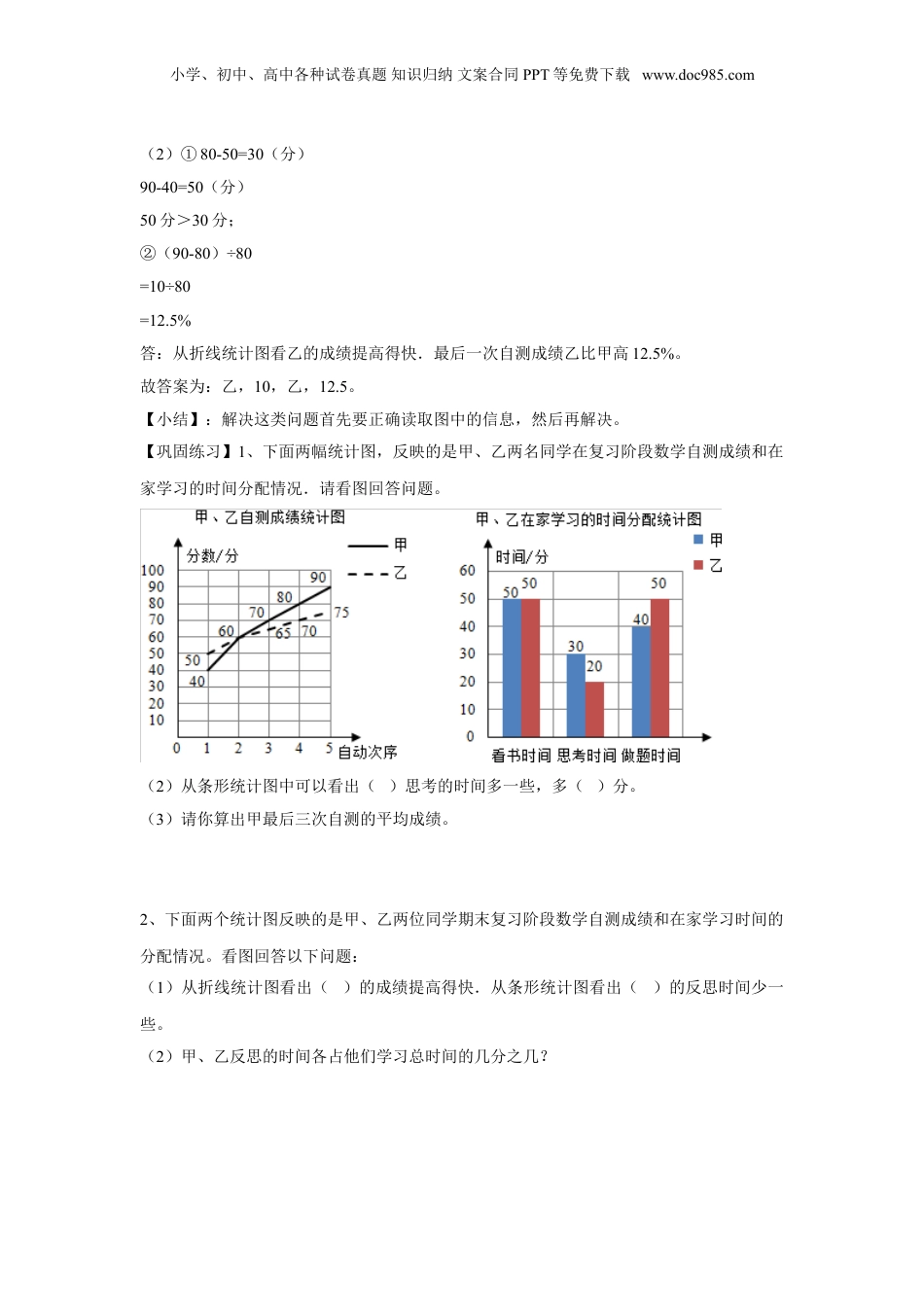 小学、初中、高中各种试卷真题知识归纳文案合同PPT等免费下载www.doc985.com第六讲简单的统计应用题【基础概念】:在工农业生产与生活中一些问题需要对数据进行收集、整理、分析,从而使问题得到解决,这就是简单的统计应用题;它包括统计表、统计图、平均数。具体内容是:统计表:分为单式统计表与复式统计表;统计图:(1)条形统计图:从图中能清楚地看出各数量的多少,便于比较;(2)折线统计图:能清楚地看出数量的增减变化,也能看出数量的多少;(3)扇形统计图:能清楚地看出各部分之间的关系;平均数:基本公式:平均数=总数量÷总份数【典型例题1】:下面有两个统计图,图1反映的是实验小学六(1)班甲、乙两名同学的数学自测成绩和图2在家学习时间分配情况。(1)从条形统计图看,()每天思考的时间多一些,多()分。(2)从折线统计图看()的成绩提高得快.最后一次自测成绩乙比甲高()%。【思路分析】:(1)由条形统计图可以看出,甲每天思考时间为20分,乙为30分,乙比甲多30-20=10(分)。(2)由折线统计图可以看出,甲从50分提高到80分,提高了80-50=30(分),乙从40分提高到90分,提高了90-40=50(分),乙提高的快;最后一次成绩甲是80分,乙是90分,求乙比甲高百分之几,就是求乙比甲高的成绩占甲的百分之几,用是求乙比甲高的成绩除以甲的成绩。解答::(1)30-20=10(分)答:从条形统计图看,乙每天思考的时间多一些,多10分。小学、初中、高中各种试卷真题知识归纳文案合同PPT等免费下载www.doc985.com(2)①80-50=30(分)90-40=50(分)50分>30分;②(90-80)÷80=10÷80=12.5%答:从折线统计图看乙的成绩提高得快.最后一次自测成绩乙比甲高12.5%。故答案为:乙,10,乙,12.5。【小结】:解决这类问题首先要正确读取图中的信息,然后再解决。【巩固练习】1、下面两幅统计图,反映的是甲、乙两名同学在复习阶段数学自测成绩和在家学习的时间分配情况.请看图回答问题。(1)从折线统计图中可以看出()的成绩提高得快。(2)从条形统计图中可以看出()思考的时间多一些,多()分。(3)请你算出甲最后三次自测的平均成绩。2、下面两个统计图反映的是甲、乙两位同学期末复习阶段数学自测成绩和在家学习时间的分配情况。看图回答以下问题:(1)从折线统计图看出()的成绩提高得快.从条形统计图看出()的反思时间少一些。(2)甲、乙反思的时间各占他们学习总时间的几分之几?小学、初中、高中各种试卷真题知识归纳文案合同PPT等免费下载www.doc985.com(3)你喜欢谁的学习方式?为什么?【典型例题2】:如图是五(3)班学生最喜欢吃的水果统计图。(1)喜欢吃香蕉的学生人数占全班人数的()%。,(2)喜欢吃西瓜和苹果的学生人数一共占全班人数的()%,(3)喜欢吃桃子的学生人数占全班人数的()%,(4)喜欢吃香蕉的学生有8人,喜欢吃西瓜的同学有()人。【思路分析】:(1)根据扇形统计图即可看出喜欢吃香蕉的学生人数占全班人数的百分比。(2)喜欢吃西瓜和苹果的学生人数占全班的百分率之和就是喜欢吃西瓜和苹果的学生人数一共占全班人数的百分比。(3)把这个班的总人数看作单位“1”,用1减去喜欢吃香蕉、西瓜、苹果、其它人数所占的百分比就是喜欢吃桃子的学生人数占全班人数的百分比。(4)根据百分数除法的意义,用喜欢吃香蕉的人数除以所占的百分率就是全班总人数,再根据百分数乘法的意义,用总人数乘喜欢吃西瓜的同学所占的百分率就是喜欢吃西瓜的同学人数。解答:(1)喜欢吃香蕉的学生人数占全班人数的20%。(2)15%+12.5%=27.5%答:喜欢吃西瓜和苹果的学生人数一共占全班人数的27.5%。(3)1-20%-15%-12.5%-22.5%=30%小学、初中、高中各种试卷真题知识归纳文案合同PPT等免费下载www.doc985.com答:喜欢吃桃子的学生人数占全班人数的30%。(4)8÷20%×15%=6人答:喜欢吃西瓜的同学6人。故答案为:20,27.5,30,6。【小结】:解决此类问题要全面读取扇形统计图中的信息,再根据所获取的信息进行有关计算等。【巩固练习】3.下边是学校红领巾广播站每星期播出各类节目的时间统计。(1)“校园快讯”每星期播出48分钟...