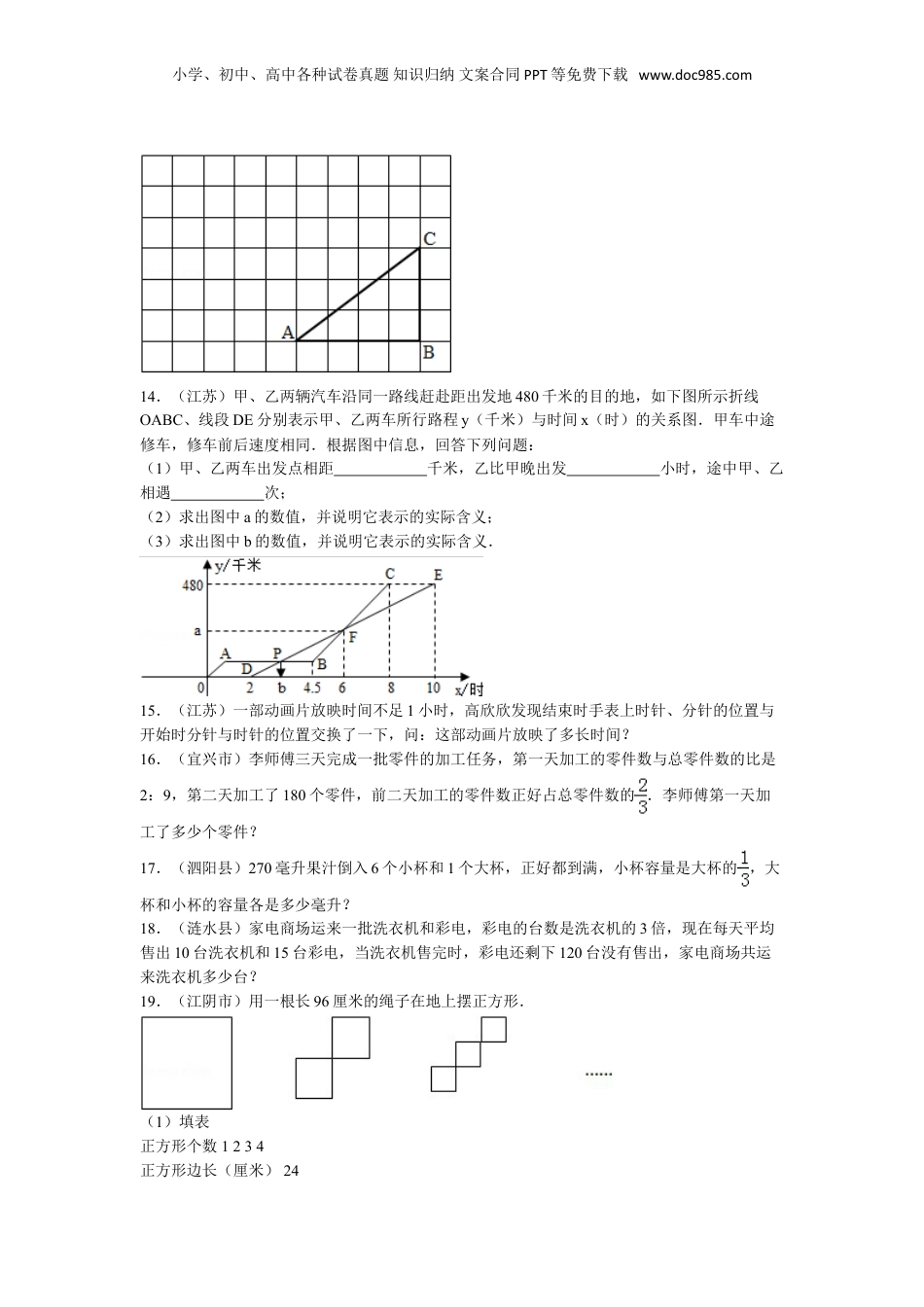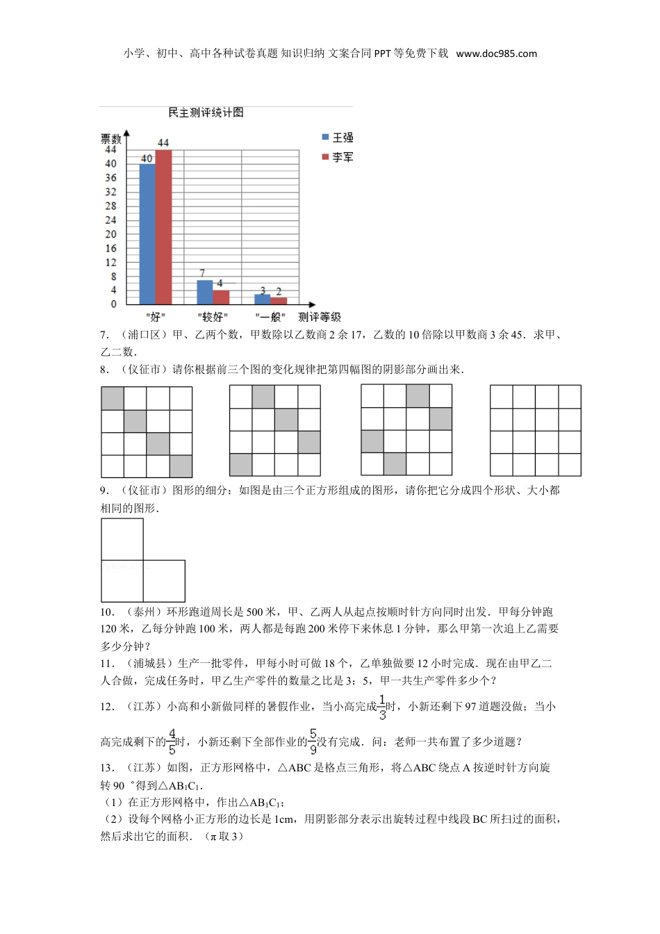 小学、初中、高中各种试卷真题知识归纳文案合同PPT等免费下载www.doc985.com【精品】小升初数学试题精粹100例及解析-江苏省1.(东台市)如图,在直线L上找一点C,连接AB、AC、BC,使三角形ABC是一个等腰三角形.这样的C点共有个.2.(楚州区)张华三天看完一本书,第一天看了这本书的,第二天看了余下的60%少10页,第三天将余下的50页看完,这本书一共有多少页?3.(楚州区)小方桌的边长是1米,把它的四边撑开就成了一张圆桌(如图)求圆桌的面积.4.(楚州区)快、慢两车同时从甲乙两地相对而行,经过5小时在离中点40千米处两车相遇,相遇后两车仍以原速行驶,快车又用4小时到达乙地.甲乙两地的路程是多少千米?5.(吴中区)有一个六位数,它的二倍、三倍、四倍、五倍、六倍还是六位数,并且它们的数字和原来的六位数的数字完全相同只是排列的顺序不一样,求这个六位数.6.(泰州)某校七年级(1)班为了在王强和李军同学中选班长,进行了一次“演讲”与“民主测评”活动,A,B,C,D,E五位老师为评委对王强,李军的“演讲”打分;该班50名同学分别对王强和李军按“好”,“较好“,“一般“三个等级进行民主测评.统计结果如下图,表.计分规则:①“演讲”得分按“去掉一个最高分和一个最低分后计算平均分”;②“民主测评”分=“好”票数×2分+“较好”票数×1分+“一般”票数×0分;③综合分=“演讲”得分×40%+“民主测评”得分×60%.解答下列问题:(1)演讲得分,王强得分,李军得分.(2)民主测评得分,王强得分,李军得分.(3)以综合得分高的当选班长,王强和李军谁能当班长?为什么?演讲得分表(单位:分)评委姓名ABCDE王强9092949782李军8982879691小学、初中、高中各种试卷真题知识归纳文案合同PPT等免费下载www.doc985.com7.(浦口区)甲、乙两个数,甲数除以乙数商2余17,乙数的10倍除以甲数商3余45.求甲、乙二数.8.(仪征市)请你根据前三个图的变化规律把第四幅图的阴影部分画出来.9.(仪征市)图形的细分:如图是由三个正方形组成的图形,请你把它分成四个形状、大小都相同的图形.10.(泰州)环形跑道周长是500米,甲、乙两人从起点按顺时针方向同时出发.甲每分钟跑120米,乙每分钟跑100米,两人都是每跑200米停下来休息1分钟,那么甲第一次追上乙需要多少分钟?11.(浦城县)生产一批零件,甲每小时可做18个,乙单独做要12小时完成.现在由甲乙二人合做,完成任务时,甲乙生产零件的数量之比是3:5,甲一共生产零件多少个?12.(江苏)小高和小新做同样的暑假作业,当小高完成时,小新还剩下97道题没做;当小高完成剩下的时,小新还剩下全部作业的没有完成.问:老师一共布置了多少道题?13.(江苏)如图,正方形网格中,△ABC是格点三角形,将△ABC绕点A按逆时针方向旋转90゜得到△AB1C1.(1)在正方形网格中,作出△AB1C1;(2)设每个网格小正方形的边长是1cm,用阴影部分表示出旋转过程中线段BC所扫过的面积,然后求出它的面积.(π取3)小学、初中、高中各种试卷真题知识归纳文案合同PPT等免费下载www.doc985.com14.(江苏)甲、乙两辆汽车沿同一路线赶赴距出发地480千米的目的地,如下图所示折线OABC、线段DE分别表示甲、乙两车所行路程y(千米)与时间x(时)的关系图.甲车中途修车,修车前后速度相同.根据图中信息,回答下列问题:(1)甲、乙两车出发点相距千米,乙比甲晚出发小时,途中甲、乙相遇次;(2)求出图中a的数值,并说明它表示的实际含义;(3)求出图中b的数值,并说明它表示的实际含义.15.(江苏)一部动画片放映时间不足1小时,高欣欣发现结束时手表上时针、分针的位置与开始时分针与时针的位置交换了一下,问:这部动画片放映了多长时间?16.(宜兴市)李师傅三天完成一批零件的加工任务,第一天加工的零件数与总零件数的比是2:9,第二天加工了180个零件,前二天加工的零件数正好占总零件数的.李师傅第一天加工了多少个零件?17.(泗阳县)270毫升果汁倒入6个小杯和1个大杯,正好都到满,小杯容量是大杯的,大杯和小杯的容量各是多少毫升?18.(涟水县)家电商场运来一批洗衣机和彩电,彩电的...
