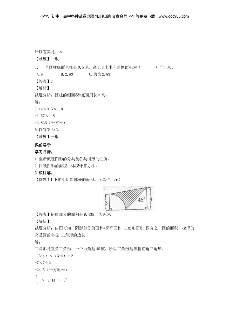 小学、初中、高中各种试卷真题知识归纳文案合同PPT等免费下载www.doc985.com专题练习图形与几何第一课时开心回顾1.()没有端点,()有一个端点,()有两个端点。【答案】直线,射线,线段【解析】解:直线没有端点,射线有一个端点,线段有两个端点。故答案为:直线,射线,线段。【难度】容易2.从一点引出两条射线,就得到一个()。角的大小与角的两条边()的大小有关,与边的()无关。【答案】角,叉开,长短【解析】[来源:学科网]试题分析:根据角的定义进行解答。解:从一点引出两条射线,就得到一个角。角的大小与角的两条边叉开的大小有关,与边的长短无关。故答案为:角,叉开,长短。【难度】容易3.平面内不相交的两条直线是平行线。()。【答案】×[来源:学&科&网Z&X&X&K]【解析】试题分析:平面内两条直线的关系有平行、相交、重合三种情况。解:平面内两条直线的关系有平行、相交、重合三种情况,不相交还可以是重合,所以说法错误。故答案为:×。【难度】一般4.面积相等的两个三角形一定能拼成一个平行四边形。()。【答案】×【解析】试题分析:三角形的面积计算公式是S=×底×高,所以三角形的面积相等形状不一定相同。据此判断。解:三角形的面积计算公式是S=×底×高,即只要底×高的值相等,两个三角形的面积就相同。也就是说两个面积相等的三角形,其形状,角度及边长可能完全不同,所以不一定能组成平行四边形。小学、初中、高中各种试卷真题知识归纳文案合同PPT等免费下载www.doc985.com所以答案是:×。【难度】一般5.一个圆柱底面直径是0.5米,高1.8米求它的侧面积为()平方米。A.9B.2.83C.约为2.83【答案】C【解析】试题分析:圆柱的侧面积=底面周长×高。解:3.14×0.5×1.8=1.57×1.8=2.826(平方米)所以答案为C。【难度】一般课前导学学习目标:1.重新梳理图形的分类及各类图形的性质。2.回顾图形的面积、体积计算方法。知识讲解:【例题1】下图中阴影部分的面积。(单位:cm)【答案】阴影部分的面积是9.435平方厘米【解析】试题分析:由图可知,阴影部分的面积=梯形面积-三角形面积-四分之一圆的面积,梯形的高是圆的半径+三角形的边长。解:三角形是直角三角形,一个内角是45度,所以三角形是等腰直角三角形。(3+4)×(3+4)÷2=7×7÷2=24.5(平方厘米)×3.14×32小学、初中、高中各种试卷真题知识归纳文案合同PPT等免费下载www.doc985.com=×3.14×9=7.065(平方厘米)×4×4=8(平方厘米)24.5-7.065-8=9.435(平方厘米)答:阴影部分的面积是9.435平方厘米。所以答案为:阴影部分的面积是9.435平方厘米。【难度】一般[来源:学科网]【例题2】一个三角形内角度数比是1:2:3,这是()三角形。【答案】直角【解析】试题分析:根据三角形内角度数比,求出三角形各内角的度数,即可判断。解:1800×=3001800×=6001800×=900三角形的三个内角分别是300、600、900,所以三角形是直角三角形。[来源:学&科&网Z&X&X&K]所以答案为:直角三角形。【难度】一般新知总结:1.三角形按角分类、三边关系及内角和平行四边形与四边形的关系,圆是曲线图形。2.长方形的面积是研究其他图形面积的基础。3.利用割补、转化的方法来计算图形的相关周长、面积、体积。作业设计1.一个圆环铁片的外半径是12cm,内半径是8cm,环形铁片的面积是()cm2。【答案】251.2cm2【解析】试题分析:由题意可知,环形铁片的面积=大圆面积-小圆面积,根据圆的计算公式便可计算求解。解:3.14×122—3.14×82小学、初中、高中各种试卷真题知识归纳文案合同PPT等免费下载www.doc985.com=452.16-200.96=251.2(cm2)答:环形铁片的面积是251.2cm2。所以答案是251.2cm2。【难度】一般2.已知下图中,圆的周长是50.24cm,圆的面积与长方形的面积相等,求图中阴影部分的面积是多少?【答案】阴影部分的面积是150.72cm2【解析】试题分析:由图可知,阴影部分的面积=长方形的面积-圆的面积。根据圆的周长计算出圆的半径,根据圆的半径分别求出原的面积和阴影部分的面积。解:r=50.24÷3.14÷2=16÷2=8(cm)[来源:Zxxk.Com]阴影部分的面积=长方形的面积-圆的面积圆的面积=长方...