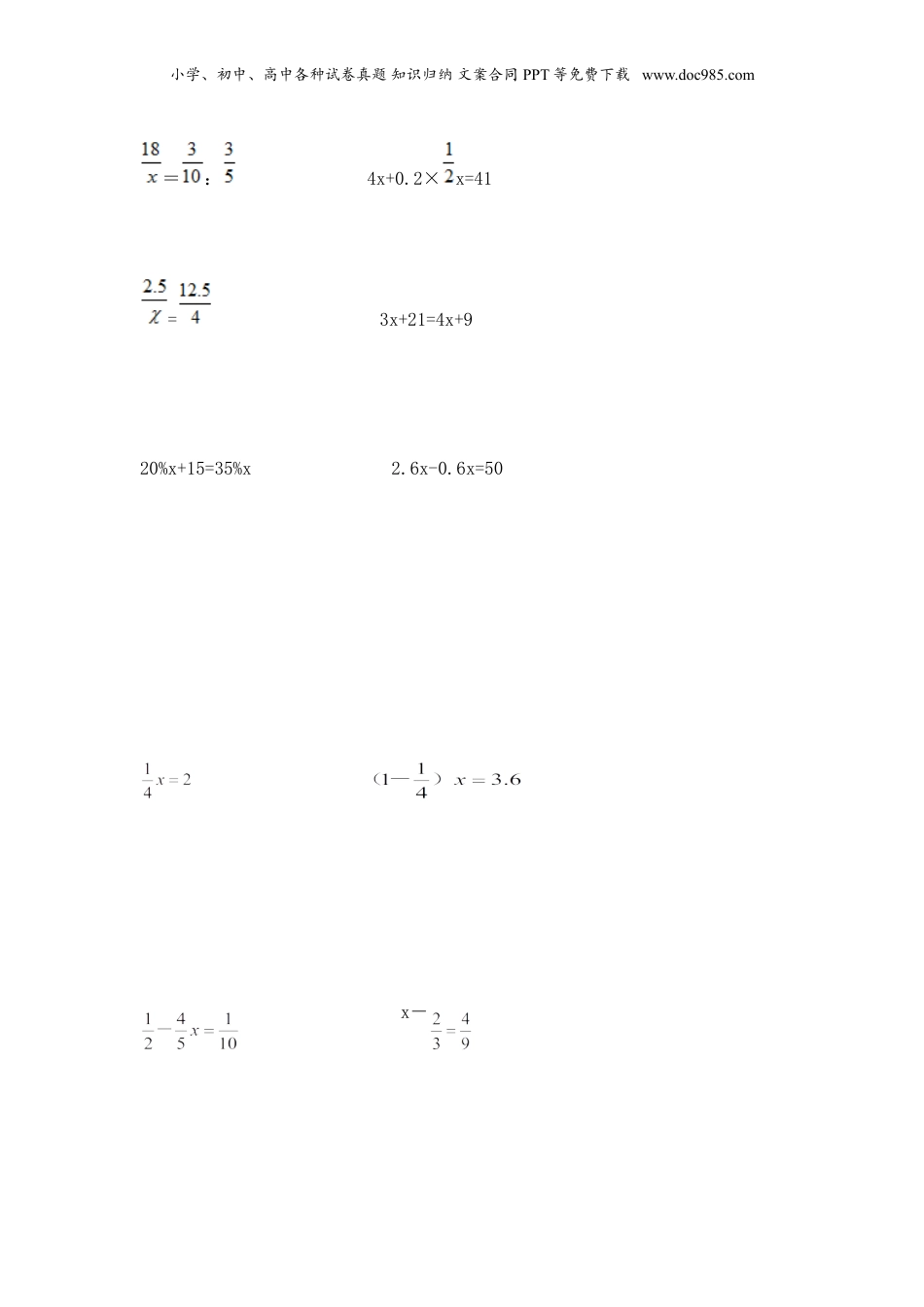小学、初中、高中各种试卷真题知识归纳文案合同PPT等免费下载www.doc985.com解方程或比例综合练习一、填空题1.当x=20时,3x+□=87.□里应填.2.已知x=5是方程ax—3=12的解,那么方程ay+4=25的解是()。3.如果3x+4=25,那么4x+3=()。4.如果3x=39,那么5x+11=。5.方程3X=7.2的解是,那么2X+3.5=。6.x的3倍加上15.8的和是20,求x,列方程是。7.看图列方程,并解答。8.已知x=4是方程ax﹣18=6的解,a的值是,6a=.9.():()=()24===0.7510.,当x等于()时,才能组成比例。小学、初中、高中各种试卷真题知识归纳文案合同PPT等免费下载www.doc985.com11.如果=,那么a=()。12.在一个比例中,两个项外的积是7.59,一个内项是3.3,另一个内项是()。13.18:6=24:()=()÷3=()%14.在一个比例中,两个外项的积是12,其中一个内项是3,则另一个内项是()。15.已知两个比值是0.8,它们组成的比例的两个外项是1.2和5,这个比例是。16.在一个比例式中,两个比的比值等于2,这个比例的两个外项分别是和这个比例是。二、解方程或比例。2.5:6=10:xx+x=11.2x-5.5=0.5=小学、初中、高中各种试卷真题知识归纳文案合同PPT等免费下载www.doc985.com=:4x+0.2×x=41[来源:学,科,网]=3x+21=4x+920%x+15=35%x2.6x-0.6x=50x-小学、初中、高中各种试卷真题知识归纳文案合同PPT等免费下载www.doc985.comx+.5x﹣40=208x+2×4=31(x﹣3)÷2=7.54x+x=80.0.9+2x=7.4[来源:学。科。网Z。X。X。K](x﹣3)÷2=7.56.5x﹣5.48x=1.020.5×(12-x)=1.5小学、初中、高中各种试卷真题知识归纳文案合同PPT等免费下载www.doc985.com50%x-30=523.6x-0.9x=1.622.8÷x=355x+2﹣1.8=3.6.6x+15×7=1412x÷2.8=8.21.4x﹣0.7x=56.0.5x+1.5x=15.685﹣9x=223x+3.24×5=39.63(x+2.1)=8.7(3x﹣4)×5=40.[来源:学科网ZXXK]=0.3:1.51:4=x:2.5;4.9+50%x=6.3;6.9﹣x=.小学、初中、高中各种试卷真题知识归纳文案合同PPT等免费下载www.doc985.com0.75x+3×0.8=7.5x:4=12:8.[来源:学&科&网Z&X&X&K]x:12=1.4:2.83x-x=x+5×4=95=∶=2.5:6=10:x【参考答案】一、1.【答案】27【解析】由题意得,原式是一个不完整的方程,这里x已知,就要把现在x的值代入方程,把□看作未知数,根据等式的基本性质解答即可.解:把x=20代入得:60+□=87小学、初中、高中各种试卷真题知识归纳文案合同PPT等免费下载www.doc985.com□+60﹣60=87﹣60□=27故答案为:272.【答案】7【解析】本题考查对字母表示数以及解方程可以根据x=5解出a的值,再代入第二个方程解出y的值。x=5,则5a-3=12a=3ay+4=25则3y+4=25y=7。易错提示:不解a而用式子找x与y的关系式。3.【答案】31【解析】先求出X的值,再代入第二个式中,求出4X+3的值。根据3X+4=25,求出X=7,再将X=7代入4X+3中,求得4X+3=4×7+3=31。易错提示:在解方程时容易算错。4.【答案】76【解析】先根据等式的性质,求出x的值是多少,再把它代入5x+11求出结果即可。解:3x=393x÷3=39÷3x=135x+11=5×13+11=65+11=76故答案为:76.5.【答案】2.4,8.3.【解析】求方程3X=7.2的解,方程两边同除以3即可;求2X+3.5的值,把X=2.4代入2X+3.5中,计算即可.解:3X=7.2,X=7.2÷3,小学、初中、高中各种试卷真题知识归纳文案合同PPT等免费下载www.doc985.comX=2.4;则2X+3.5,=2×2.4+3.5,=4.8+3.5,=8.3.故答案为:2.4,8.3.6.【答案】3x+15.8=20.【解析】将题中的表述转化为式子,x的3倍即3x,再加上15.8的和是20,根据加法意义列出方程即可。解:x的3倍加上15.8的和是20,列方程是3x+15.8=20,故答案为:3x+15.8=20.7.【答案】50【解析】解:(1)x+x+x+45+45=1803x+90=1803x=90x=30(2)设梨有x千克,则苹果有3x千克。x+3x=2004x=200x=50,答:梨有50千克。【点评】本题考查了列方程解应用题,关键是根据等量关系列方程。8.【答案】6,36.【解析】把x=4代入方程:ax﹣18=6,再依据等式的性质,方程两边同时加小学、初中、高中各种试卷真题知识归纳文案合同PPT等免费下载www.doc985.com18,然后同时除以4,求出a的值,最后把求得的a的值代入6a即可解答...