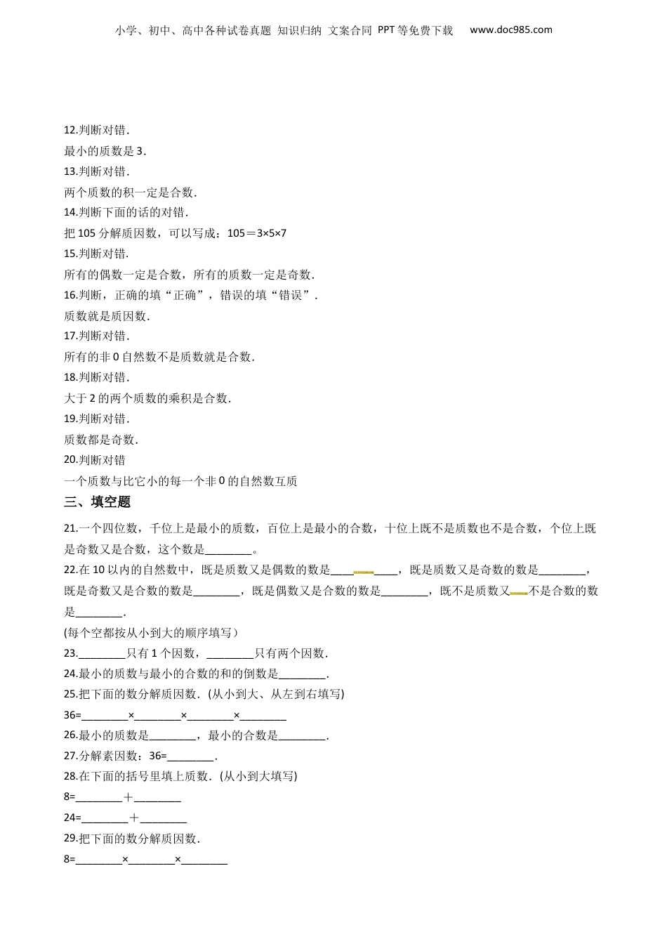 小学、初中、高中各种试卷真题知识归纳文案合同PPT等免费下载www.doc985.com六年级下册数学总复习试题-质数和合数专项练一、单选题1.两个连续的自然数(0除外)的积一定是()A.质数B.合数C.奇数D.偶数2.把30分解质因数应该写成的形式为()A.30=5×6B.30=2×3×5C.30=1×2×3×5D.2×3×5=303.下面3个数中,()是素数A.37B.57C.874.一个两位数,个位上和十位上的数都是合数,并且是互质数,这个数最大为()A.94B.98C.995.互质的两个数()A.都是质数B.都是合数C.可能是质数也可能是合数6.把54分解质因数,正确的是()A.54=2×9×3B.54=2×27C.54=2×3×3×3D.54=3×187.2是:()A.最小的偶数B.最小的质数C.最小的合数8.15分解质因数是()A.15×15B.15=3×5C.3×5=159.两个质数相乘的积一定是()A.奇数B.偶数C.合数10.一个正方形的边长是一个质数,这个正方形的周长一定是()。A.合数B.奇数C.质数二、判断题11.判断对错10是1、2、5、10的倍数,所以,1、2、5和10都是10的约数.小学、初中、高中各种试卷真题知识归纳文案合同PPT等免费下载www.doc985.com12.判断对错.最小的质数是3.13.判断对错.两个质数的积一定是合数.14.判断下面的话的对错.把105分解质因数,可以写成:105=3×5×715.判断对错.所有的偶数一定是合数,所有的质数一定是奇数.16.判断,正确的填“正确”,错误的填“错误”.质数就是质因数.17.判断对错.所有的非0自然数不是质数就是合数.18.判断对错.大于2的两个质数的乘积是合数.19.判断对错.质数都是奇数.20.判断对错一个质数与比它小的每一个非0的自然数互质三、填空题21.一个四位数,千位上是最小的质数,百位上是最小的合数,十位上既不是质数也不是合数,个位上既是奇数又是合数,这个数是________。22.在10以内的自然数中,既是质数又是偶数的数是________,既是质数又是奇数的数是________,既是奇数又是合数的数是________,既是偶数又是合数的数是________,既不是质数又不是合数的数是________.(每个空都按从小到大的顺序填写)23.________只有1个因数,________只有两个因数.24.最小的质数与最小的合数的和的倒数是________.25.把下面的数分解质因数.(从小到大、从左到右填写)36=________×________×________×________26.最小的质数是________,最小的合数是________.27.分解素因数:36=________.28.在下面的括号里填上质数.(从小到大填写)8=________+________24=________+________29.把下面的数分解质因数.8=________×________×________小学、初中、高中各种试卷真题知识归纳文案合同PPT等免费下载www.doc985.com30.1-20各数中:质数有:________、________、________、________、________、________、________、________.合数有:________、________、________、________、________、________、________、________、________、________、________.(从小到大依次填写)31.176的分数单位是________,再添上________个这样的分数单位就是最小的合数.32.将36分解质因数并写成标准式:________.33.两个质数的和是19,积是34,它们的差是________.34.在括号里填上合适的素数.(从小到大填写)70=________×________×________35.按要求写出两个数,使它们的最大公因数是1.(1)两个数都是质数.________(2)两个数都是合数.________(3)一个是质数,另一个是合数.________36.在横线上填入适当的质数16=________+________=________+________37.________是最小的奇数,________是最小的偶数,最小的质数是________.最小合数是________.38.20以内相差1的两个合数有________和________、________和________、________和________、________和________四组.(从小到大填写)39.在自然数中,既不是质数也不是合数的是________.40.一个数既是偶数也是质数,这个数是________。四、解答题41.把12分解质因数42.把100以内的素数按从小到大的顺序填在下面的表格里.小学、初中、高中各种试卷真题知识归纳文案合同PPT等免费下载www.doc985.com43.在下表中填出两个数的最大公因数.44.猜一猜它们各是多少?我们两个和是6...