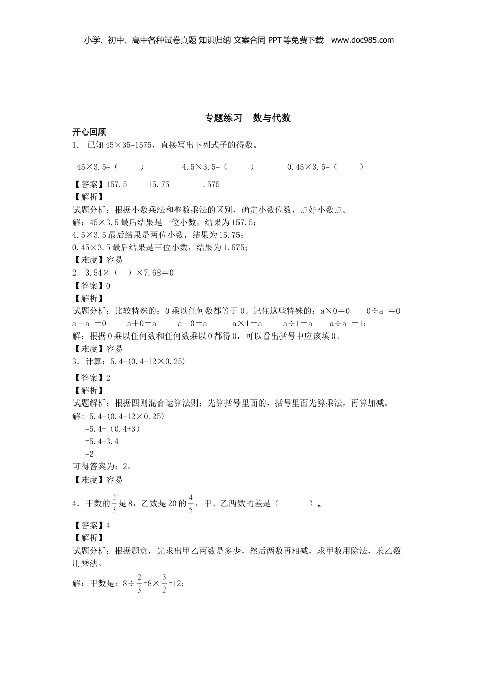 小学、初中、高中各种试卷真题知识归纳文案合同PPT等免费下载www.doc985.com专题练习数与代数开心回顾1.已知45×35=1575,直接写出下列式子的得数。45×3.5=()4.5×3.5=()0.45×3.5=()【答案】157.515.751.575【解析】试题分析:根据小数乘法和整数乘法的区别,确定小数位数,点好小数点。解:45×3.5最后结果是一位小数,结果为157.5;4.5×3.5最后结果是两位小数,结果为15.75;0.45×3.5最后结果是三位小数,结果为1.575;【难度】容易2.3.54×()×7.68=0【答案】0【解析】试题分析:比较特殊的:0乘以任何数都等于0。记住这些特殊的:a×0=00÷a=0a-a=0a+0=aa-0=aa×1=aa÷1=aa÷a=1;解:根据0乘以任何数和任何数乘以0都得0,可以看出括号中应该填0。【难度】容易3.计算:5.4-(0.4+12×0.25)【答案】2【解析】试题解析:根据四则混合运算法则:先算括号里面的,括号里面先算乘法,再算加减。解:5.4-(0.4+12×0.25)=5.4-(0.4+3)=5.4-3.4=2可得答案为:2。【难度】容易4.甲数的是8,乙数是20的,甲、乙两数的差是()。【答案】4【解析】试题分析:根据题意,先求出甲乙两数是多少,然后两数再相减,求甲数用除法,求乙数用乘法。解:甲数是:8÷=8×=12;小学、初中、高中各种试卷真题知识归纳文案合同PPT等免费下载www.doc985.com乙数是:20×=16;16-12=4;故答案是:4。【难度】一般5.25×120=()×5×2×()【答案】560【解析】试题分析:将25×120分解成四个数的乘积,就是把25和120分别分解成两个数的乘积,题目已给出5和2两个数,所以把25分解成5×5,把120分解成2×60,计算很简便了。解:25×120=5×5×2×60故答案为:560【难度】一般课前导学学习目标:1.理解四则混合运算的定义;2.掌握整数、分数、小数四则混合运算的法则;知识讲解:【例题1】已知a是一个纯小数,b大于1,在下面五个算式中答案一定大于1的算式是()A、a÷bB、a×bC、b÷aD、b-a【答案】C【解析】试题分析:纯小数的定义:整数部分是零的小数叫做纯小数。根据纯小数定义可知a﹤1,已知b﹥1.解:由题意可知,a﹤1,b﹥1A选项中a÷b一定小于1B选项中a×b可能大于1也可能小于1C选项中b÷a一定大于1D选项中b-a可能大于1也可能小于1故选C【难度】一般【例题2】计算:1058+(1.69-0.8)÷2.5[来源:学科网]【答案】1058.356【解析】试题分析:根据四则混合运算法则:先算括号里面的,然后再算除法,最后算加法。(1.69-0.8)÷2.5是小数的减法和除法,特别是除法,数值比较难算,一定要细心别算错。小学、初中、高中各种试卷真题知识归纳文案合同PPT等免费下载www.doc985.com解:1058+(1.69-0.8)÷2.5=1058+0.89÷2.5=1058+0.356=1058.356【难度】一般知识总结:1.掌握整数四则混合运算的法则:从左到右,先乘除后加减,有括号先算括号里面的(先算中括号里面的,后算小括号里面的)。2.分数、小数的四则运算的法则同整数的法则一样。3.在运算过程中,出现除不尽的情况,除得的商超过两位小数时,一般要求保留两位小数或者用分数表示。作业设计1.73÷(26+38)的算式用文字表达是()。[来源:学,科,网Z,X,X,K]A.73除以26加上38B.73除以26的商加上38C.73除以26加上38的和【答案】C【解析】解:A选项的说法应列式为:73÷26+38;B选项的说法应列式为:73÷26+38;C选项的说法应列式为:73÷(26+38);故答案为:C。【难度】较易2.计算:7.69×[1÷(0.9-0.8)]【答案】76.9【解析】试题分析:根据四则混合运算的法则,乘除后加减,有括号先算括号里面的(先算中括号里面的,后算小括号里面的)。本题先算中括号里面的小括号的0.9-0.8=0.1,再算1÷0.1=10,最后算7.69×10。解:7.69×[1÷(0.9-0.8)]=7.69×(1÷0.1)=7.69×10=76.9【难度】较易3.下列各式中,得数最大的算式是()A.10.325×0.018B.10.325÷0.018C.0.018÷10.325【答案】B【解析】试题分析:如果把每个选项的得数算出来,很麻烦,通过估算小数的整数位和小数部分的大小来判断较简单。小学、初中、高中各种试卷真题知识归纳文案合同PPT等免费下载www.doc985.com解:A选项中10.325×0.018,如果把0.018看出1...