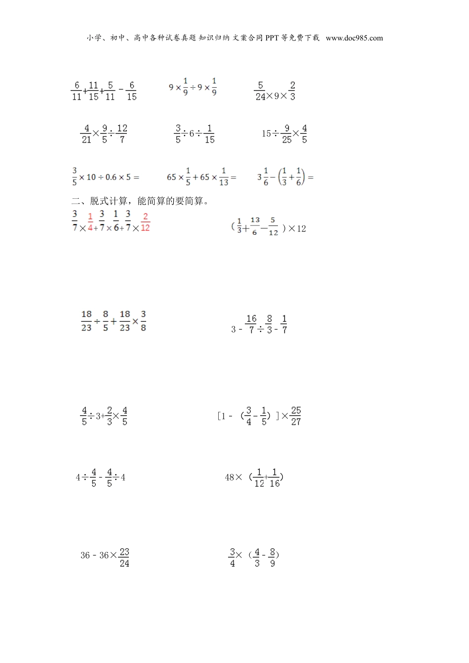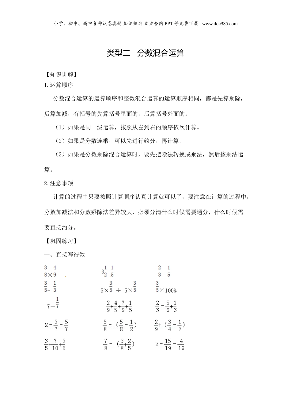 小学、初中、高中各种试卷真题知识归纳文案合同PPT等免费下载www.doc985.com类型二分数混合运算【知识讲解】1.运算顺序分数混合运算的运算顺序和整数混合运算的运算顺序相同,都是先算乘除,后算加减,有括号的先算括号里面的,后算括号外面的。(1)如果是同一级运算,按照从左到右的顺序依次计算。(2)如果是分数连乘,可以先进行约分,再计算。(3)如果是分数乘除混合运算时,要先把除法转换成乘法,然后按乘法运算。2.注意事项计算的过程中只要按照计算顺序认真计算就可以了,要注意在计算的过程中,分数加减法和分数乘除法差异较大,必须分清什么时候需要通分,什么时候需要直接约分。【巩固练习】一、直接写得数×--+5×÷5××100%7-小学、初中、高中各种试卷真题知识归纳文案合同PPT等免费下载www.doc985.com×9××÷÷6÷15÷×二、脱式计算,能简算的要简算。×++×+-)×123﹣÷﹣÷3+×[1﹣(﹣)]×4÷﹣÷448×(+)36﹣36××(﹣)小学、初中、高中各种试卷真题知识归纳文案合同PPT等免费下载www.doc985.com1÷[()÷4]×××15÷÷÷×.[来源:Z_xx_k.Com]×9××÷÷6÷15÷×小学、初中、高中各种试卷真题知识归纳文案合同PPT等免费下载www.doc985.com+÷[×(+)]÷(﹣×)÷+÷55×(﹣×)÷÷7+×(+﹣)÷÷()[4﹣(﹣)]×(﹣)×(+)(﹣)×小学、初中、高中各种试卷真题知识归纳文案合同PPT等免费下载www.doc985.com×[-(-)]÷[×(-)][1-(+)×6]÷×[(1+2)÷-2](111+999)三、列式计算。1.18比它的少多少?2.15的减去是多少?小学、初中、高中各种试卷真题知识归纳文案合同PPT等免费下载www.doc985.com3.用与的积,再与的倒数相乘,结果是多少?4.7减去4的差加上除16的商,结果是多少?5.除以1的商加上64的,和是多少?6.减去与的积除以3,商是多少?7.加上除的商,所得的和的是多少?参考答案:一、【答案】3.3211小学、初中、高中各种试卷真题知识归纳文案合同PPT等免费下载www.doc985.com50182二、【答案】×++×=×(++)=×=×=+-)×12=×12+×12-×12=4+26-5=25====3﹣÷﹣=3﹣﹣=3﹣(+)小学、初中、高中各种试卷真题知识归纳文案合同PPT等免费下载www.doc985.com=3﹣1=2÷3+×=×+×=×(+)=×1=[1﹣(﹣)]×=[1﹣]×=×=4÷﹣÷4=5﹣=448×(+)=48×+48×=4+3=736﹣36×=36×(1﹣)=36×=×(﹣)小学、初中、高中各种试卷真题知识归纳文案合同PPT等免费下载www.doc985.com=×﹣×=1﹣=;1÷[()÷4]=1÷[÷4]=1÷=8;××==3;[来源:学科网ZXXK]×15÷=×15×==;÷÷×=××==.×9×=×=;×÷小学、初中、高中各种试卷真题知识归纳文案合同PPT等免费下载www.doc985.com=÷=;÷6÷=÷=;15÷×=×=.+====5;÷[×(+)]=÷(×)=[来源:学.科.网]==.÷(﹣×)=÷(﹣)=÷小学、初中、高中各种试卷真题知识归纳文案合同PPT等免费下载www.doc985.com=;÷+÷=×+×=(+)×=11×=;55×=(54+1)×=54×+1×=53+=53;(﹣×)÷=(﹣)÷=÷=3;÷7+×=×+×=(+)×=1×=;(+﹣)÷=(+﹣)×24小学、初中、高中各种试卷真题知识归纳文案合同PPT等免费下载www.doc985.com=×24+×24﹣×24=12+16﹣9=28﹣9=19;÷()=÷=;[4﹣(﹣)]×=[4﹣]×=×=.(﹣)×(+)=×=;[来源:学,科,网](﹣)×=×=.×[-(-)]=×(-+)=×(1-)=×=小学、初中、高中各种试卷真题知识归纳文案合同PPT等免费下载www.doc985.com÷[×(-)]=÷(×-×)=÷(-)=÷=[1-(+)×6]÷=[1-×6]÷=÷=×40=24×[(1+2)÷-2]=×[÷-2]=×[5-2]=×=1=[+(+1)-(+1)]=(++1--1)小学、初中、高中各种试卷真题知识归纳文案合同PPT等免费下载www.doc985.com=(+-)=1=×[1-]=×==×××××…×=×=。(111+999)=1110÷[56×-56×]=1110÷[24-21]=370三、【答案】1.18×﹣18=30﹣18=12答:少12.2.15×﹣=5﹣小学、初中、高中各种试卷真题知识归纳文案合同PPT等免费下载www.doc985.com=4答:15的减去是4.3.××=×=答:结果是.4.(7﹣4)+16÷=2+45=2+45=48答:结果是48.5.÷1+64×=+40=40.答:和是40.6.[﹣(×)]÷3=()÷3=×=答:商是.7.(+)×小学、初中、高中各种试卷真题知识归纳文案合同PPT等免费下载www.doc985.com=(+)×=1×=[来源:Z*xx*k.Com]答:所得的和的是。