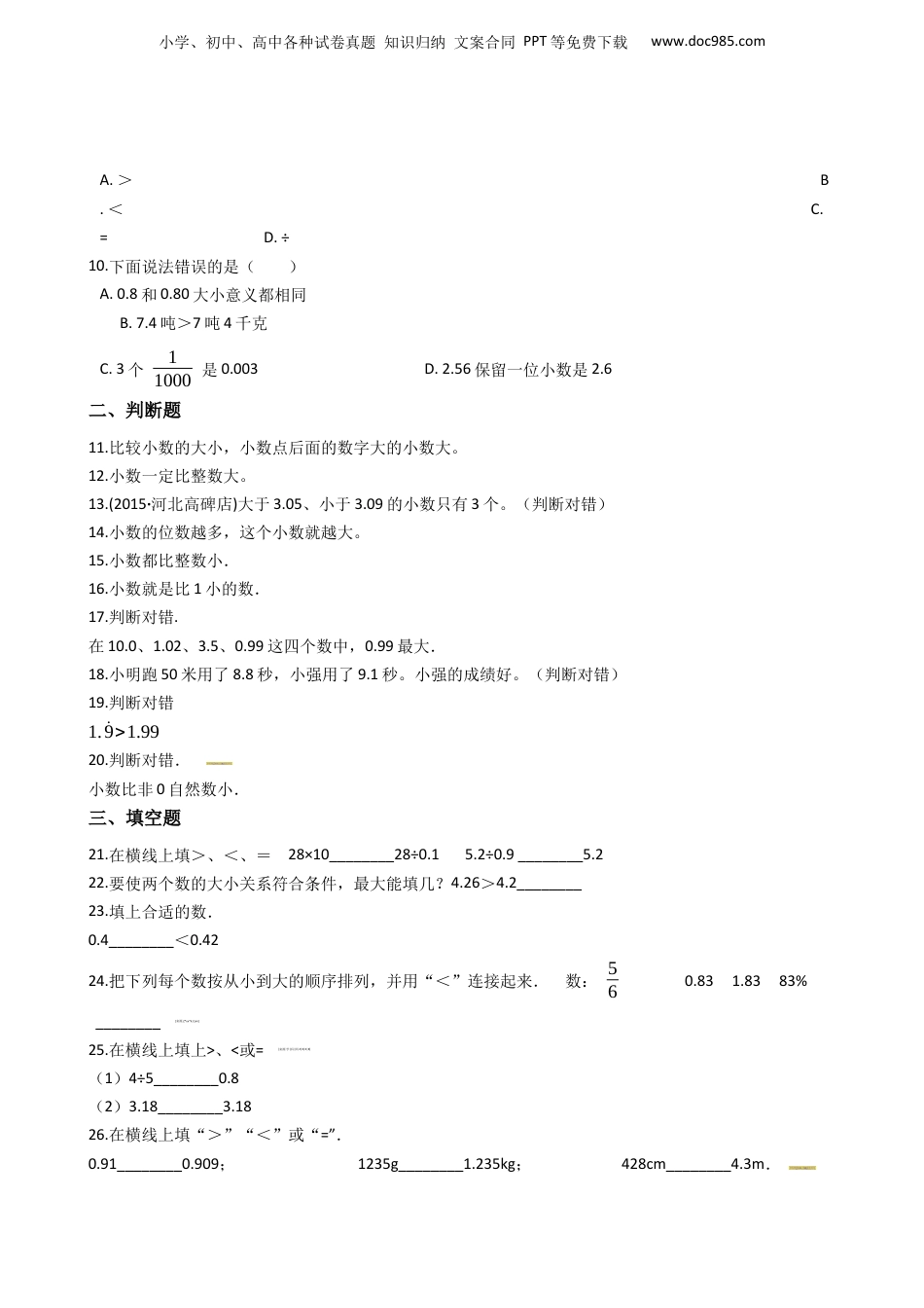 小学、初中、高中各种试卷真题知识归纳文案合同PPT等免费下载www.doc985.com六年级下册数学总复习试题-小数大小的比较专项练一、单选题1.“0.5○0.8”,比较大小,在○里应填的符号是()A.>B.<C.=D.÷2.“0.09○0.10”,比较大小,在○里应填的符号是()A.>B.<C.=D.×3.“7分米○7.1分米”,比较大小,在○里应填的符号是()A.>B.<C.=D.×4.估一估哪些算式的得数比1大?()A.1.6-0.5B.1.6-0.8C.4.5-3.65.“1.4328○1.4327”,比较大小,在○里应填的符号是()A.>B.<C.=D.×6.如果甲×2.8=乙×3.9(甲数不等于0),则甲()乙.A.大于B.小于C.等于7.“3米5分米○3.5分米”,比较大小,在○里应填的符号是()A.>B.<C.=D.×8.下面四种玩具,价格最高的玩具是()A.B.C.D.9.“0.65○0.56”,比较大小,在○里应填的符号是()小学、初中、高中各种试卷真题知识归纳文案合同PPT等免费下载www.doc985.comA.>B.<C.=D.÷10.下面说法错误的是()A.0.8和0.80大小意义都相同B.7.4吨>7吨4千克C.3个11000是0.003D.2.56保留一位小数是2.6二、判断题11.比较小数的大小,小数点后面的数字大的小数大。12.小数一定比整数大。13.(2015·河北高碑店)大于3.05、小于3.09的小数只有3个。(判断对错)14.小数的位数越多,这个小数就越大。15.小数都比整数小.16.小数就是比1小的数.17.判断对错.在10.0、1.02、3.5、0.99这四个数中,0.99最大.18.小明跑50米用了8.8秒,小强用了9.1秒。小强的成绩好。(判断对错)19.判断对错1.˙9>1.9920.判断对错.小数比非0自然数小.三、填空题21.在横线上填>、<、=28×10________28÷0.15.2÷0.9________5.222.要使两个数的大小关系符合条件,最大能填几?4.26>4.2________23.填上合适的数.0.4________<0.4224.把下列每个数按从小到大的顺序排列,并用“<”连接起来.数:560.831.8383%________[来源:Z*xx*k.Com]25.在横线上填上>、<或=[来源:学|科|网Z|X|X|K](1)4÷5________0.8(2)3.18________3.1826.在横线上填“>”“<”或“=”.0.91________0.909;1235g________1.235kg;428cm________4.3m.小学、初中、高中各种试卷真题知识归纳文案合同PPT等免费下载www.doc985.com27.写出5个比10小的小数。________、________、________、________、________。28.在8.7、8.777、8.˙7、8.˙7˙8这四个数中,最大的数是________,最小的数是________.29.把0.95、0.99·5·、0.9·5·、0.95·从小到大排列:________<________<________<________.30.把下列各数按从大到小的顺序排列起来.-183.33%-800.8333356________>________>________>________>________>________31.在横线上填上“>”“<”或“=”.3升________3200毫升5升________500毫升7000毫升________7升9升________990毫升.32.按照从小到大的顺序排列下面各数。0.80.870.0870.8078.7________33.在3.200577中,交换其中的两个数字的位置,使交换后所得的小数比原数小,那么所得的数最小是________;如果要求交换后所得的小数比原数大,那么所得的数最大是________.34.用>,<或=号填空:75%________7.575%________34227________3.1435.在横线里填上“<”“>”或“=”1.8×2________21.8×0.2________1.836.<>或=?4m3cm________4.03m5m10cm________5.01m37.填上“>”、“<”或“=”0.67________67%31.3________313%260%________2.61010________100%38.填上适当的数。0.9>________>0.810<________<1139.比较下面每组中两个小数的大小0.12________0.023.5________3.60.07________0.7小学、初中、高中各种试卷真题知识归纳文案合同PPT等免费下载www.doc985.com40.比较大小:(在横线上填上“>”“<”或者“=”)12.251________12;0.75________0.8.四、解答题41.(变式题)用1、0、7、9这四个数字和小数点写出没有重复数字的数。(1)从小到大写出大于9的小数部分是三位的小数。(2)大于700的小数部分是一位的小数。42.将45、0.78、0.89和82%按从小到大的顺序排列起来:43.把0.43、37、11÷25的商,按照从小到大的顺序排列起来.44.把1.2˙1、1.˙2˙1、1...