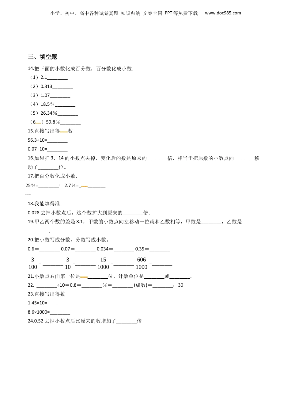 小学、初中、高中各种试卷真题知识归纳文案合同PPT等免费下载www.doc985.com六年级下册数学总复习试题-小数、分数和百分数之间的关系及其转化专项练一、单选题1.小数点右边第一位是()A.个位B.十分位C.百分位D.十位2.“274.8→0.2748”,如果小数点移到最高位数字的左边,缩小()倍。A.10B.100C.1000D.100003.“1.75→0.175”,如果小数点移到最高位数字的左边,缩小()倍。A.10B.100C.1000D.100004.2.308去掉小数点,扩大()倍。A.10B.100C.1000D.100005.下面与3.6÷0.25的商相等的算式是()。A.3.6÷25B.36÷0.25C.360÷25D.36÷256.小数点右边第二位是()A.十分位B.个位C.百分位D.千分位7.十分位在小数点右边的()A.第一位B.第二位C.第三位8.0.052去掉小数点,扩大()倍.[来源:Zxxk.Com]A.10B.100C.1000D.10000二、判断题9.判断对错.判断:0.5%化成小数是0.005.10.判断对错.36个0.001是0.36.11.小数部分的最高数位是十分位。12.我来做判断.一个小数的小数点向右移动两位,这个小数扩大到它的200倍。13.判断对错.小数与整数一样,每相邻两个单位间的进率都是10.[来源:学§科§网]小学、初中、高中各种试卷真题知识归纳文案合同PPT等免费下载www.doc985.com三、填空题14.把下面的小数化成百分数,百分数化成小数.(1)2.1________(2)0.313________(3)1.07________(4)18.5%________(5)26.34%________(6)59.8%________15.直接写出得数56.3÷10=________0.07÷10=________16.如果把3.14的小数点去掉,变化后的数是原来的________倍,相当于把原数的小数点向________移动了________位。17.把百分数化成小数.25%=________[来源:Z.xx.k.Com]2.7%=________18.我能填得准.0.028去掉小数点后,这个数扩大到原来的________倍.19.甲乙两个数的差是8.1,甲数的小数点向左移动一位就和乙数相等,甲数是________,乙数是________.20.把小数写成分数,分数写成小数。0.6=________0.07=________0.034=________0.35=________3100=________310=________151000=________6061000=________21.小数点右面第一位是________位,计数单位是________或________.22.________÷10=0.8=________%=________(成数)=________:3023.直接写出得数1.45×10=________8.6×1000=________24.0.52去掉小数点后比原来的数增加了________倍小学、初中、高中各种试卷真题知识归纳文案合同PPT等免费下载www.doc985.com25.看图写出相应的分数和小数。________(分数)或________________(分数)或________26.把百分数化成小数.5%=________3.24%=________27.直接写出得数40÷1000=________28.9÷1000=________28.0.5里面有________个0.1;0.13里面有________个0.01;0.502里面有________个0.001.四、解答题29.折同样的纸鹤,谁快一些?小学、初中、高中各种试卷真题知识归纳文案合同PPT等免费下载www.doc985.com30.填写下表(按小题的顺序,从上到下依次填写)小学、初中、高中各种试卷真题知识归纳文案合同PPT等免费下载www.doc985.com答案解析部分一、单选题1.【答案】B【考点】小数的数位顺序【解析】【解答】根据小数的数位顺序可知,小数点右边第一位是十分位.故答案为:B【分析】小数的小数部分的数位顺序:从小数点右边第一位起依次是:十分位、百分位、千分位……2.【答案】C【考点】小数点向左移动【解析】【解答】解:274.8的小数点移到最高位数字的左边,相当于把小数点向左移动三位,缩小1000倍.故答案为:C【分析】小数的小数点向左移动一位、两位、三位……,相当于这个数缩小10倍、100倍、1000倍……3.【答案】A【考点】小数点向左移动【解析】【解答】解:1.75的小数点移动到最高位数字的左边,相当于把小数点向左移动一位,缩小10倍.故答案为:A【分析】小数的小数点向左移动一位、两位、三位……,相当于这个数缩小10倍、100倍、1000倍……4.【答案】C【考点】小数点向右移动【解析】【解答】解:2.308去掉小数点是2308,相当于把小数点向右移动三位,扩大1000倍.故答案为:C【分析】小数的小数点向右移动一位、两位、三位……,相当于这个数扩大10倍、100倍...