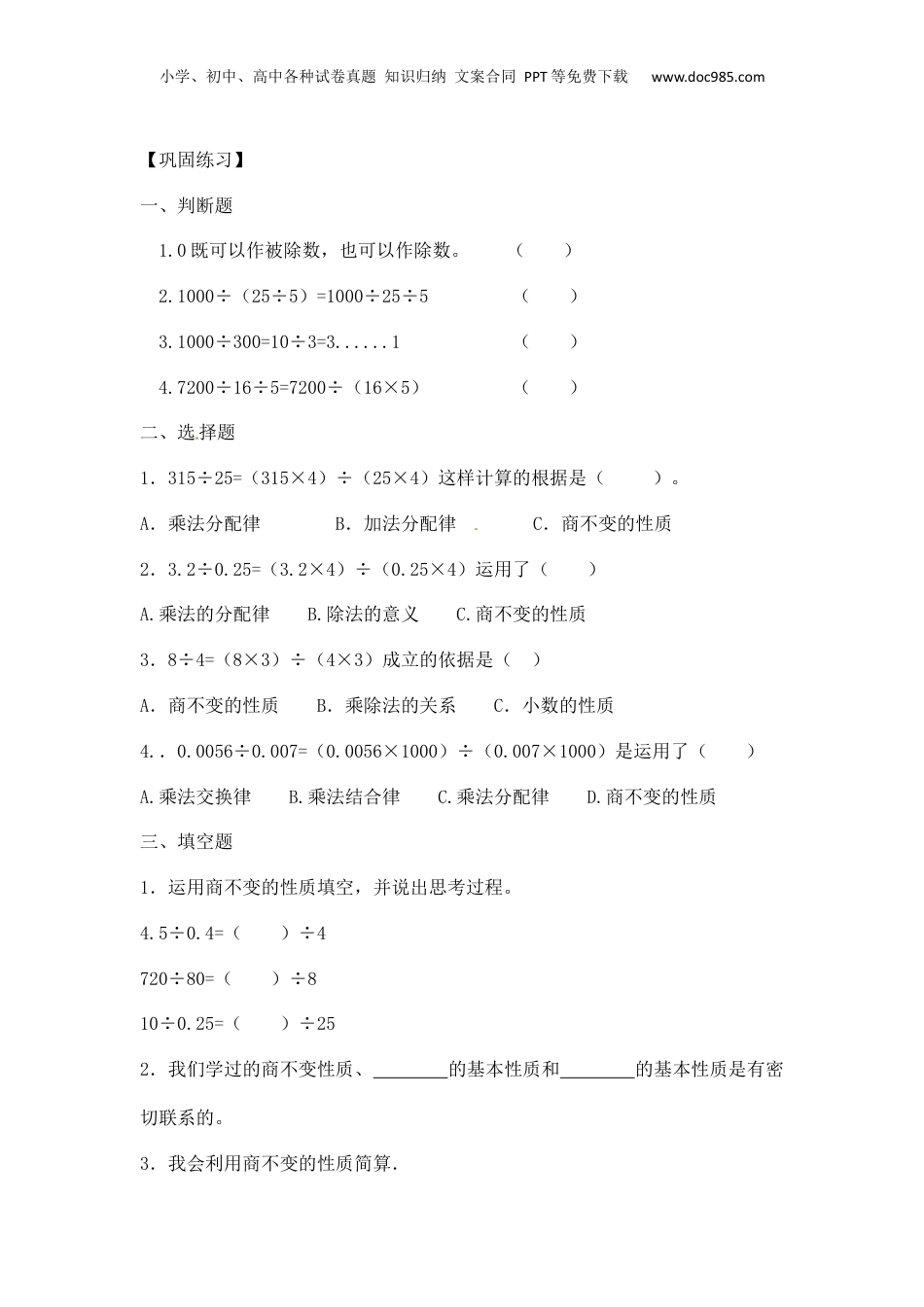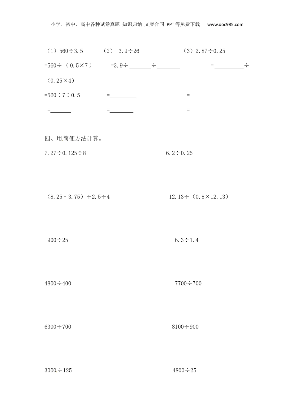 小学、初中、高中各种试卷真题知识归纳文案合同PPT等免费下载www.doc985.com专题五简便运算类型三除法简算【知识讲解】一、除法的运算性质1.—个数除以两个数的积,等于这个数依次除以这两个数。a÷(bc)=a÷b÷c2.—个数除以两个数的商,等于这个数除以商中的被除数.再乘除数。a÷(b÷c)=a÷b×c例如:727÷125÷8=727÷(125×8)=727÷1000=0.727二、简便运算中的常用方法[来源:学科网]利用商不变的性质(在除法里,被除数和除数同时乘(或除以)相同的数(0除外),商不变)变形。例如:330÷5=(330×2)÷(5×2)=660÷10=66利用商不变性质,把330与5同时乘2,把除数5变成10,然后再相除,从而使计算简便。小学、初中、高中各种试卷真题知识归纳文案合同PPT等免费下载www.doc985.com【巩固练习】一、判断题1.0既可以作被除数,也可以作除数。()2.1000÷(25÷5)=1000÷25÷5()3.1000÷300=10÷3=3......1()4.7200÷16÷5=7200÷(16×5)()二、选择题1.315÷25=(315×4)÷(25×4)这样计算的根据是()。A.乘法分配律B.加法分配律C.商不变的性质2.3.2÷0.25=(3.2×4)÷(0.25×4)运用了()A.乘法的分配律B.除法的意义C.商不变的性质3.8÷4=(8×3)÷(4×3)成立的依据是()A.商不变的性质B.乘除法的关系C.小数的性质4..0.0056÷0.007=(0.0056×1000)÷(0.007×1000)是运用了()A.乘法交换律B.乘法结合律C.乘法分配律D.商不变的性质三、填空题1.运用商不变的性质填空,并说出思考过程。4.5÷0.4=()÷4720÷80=()÷810÷0.25=()÷252.我们学过的商不变性质、的基本性质和的基本性质是有密切联系的。3.我会利用商不变的性质简算.小学、初中、高中各种试卷真题知识归纳文案合同PPT等免费下载www.doc985.com(1)560÷3.5(2)3.9÷26(3)2.87÷0.25=560÷(0.5×7)=3.9÷÷=÷(0.25×4)=560÷7÷0.5=====四、用简便方法计算。7.27÷0.125÷86.2÷0.25(8.25﹣3.75)÷2.5÷412.13÷(0.8×12.13)900÷256.3÷1.44800÷4007700÷7006300÷7008100÷9003000÷1254800÷25小学、初中、高中各种试卷真题知识归纳文案合同PPT等免费下载www.doc985.com38700÷9008000÷16004000÷125÷837700÷4÷255÷0.25÷0.470÷1.25÷0.8[来源:学§科§网Z§X§X§K]60÷0.5÷0.4800÷0.25÷8【参考答案】一、【答案】1.×2.×3.×4.√小学、初中、高中各种试卷真题知识归纳文案合同PPT等免费下载www.doc985.com二、1.【答案】C【解析】315÷25=(315×4)÷(25×4),这样计算运用了商不变的规律,即被除数、除数同时扩大相同的倍数,商不变。解:315÷25=(315×4)÷(25×4);这样计算的根据是商不变的性质。故选:C。2.【答案】C【解析】在计算3.2÷0.25时,为了使计算简便,根据商不变的规律,可把被除数和除数分别扩大4倍.解:3.2÷0.25=(3.2×4)÷(0.25×4)运用了商不变的性质.故选:C.3.【答案】A[来源:学科网]【解析】在除法算式中,被除数和除数同时扩大或缩小相同的倍数(0除外),商不变;据此解答即可.解:根据商不变的性质可知,8÷4=(8×3)÷(4×3)成立的依据是商不变的性质.故选:A.4.【答案】D【解析】在除法算式中被除数和除数同时扩大或缩小相同的倍数(0除外),商不变;据此解答即可.解:由商不变的性质可知,0.0056÷0.007=(0.0056×1000)÷(0.007×1000)是运用了商不变的性质;故选:D.三、1.【答案】45,72,1000【解析】(1)4.5÷0.4=()÷4由式子可知,除数扩大10,被除数也要扩大10倍.所以被除数是45;(2)720÷80=()÷8由式子可知,除数缩小10,被除数也要缩小10倍.所以被除数是72;(3)10÷0.25=()÷25由式子可知,除数扩大100,被除数也要扩大100倍.所以被除数是1000.小学、初中、高中各种试卷真题知识归纳文案合同PPT等免费下载www.doc985.com解:4.5÷0.4=45÷4;720÷80=72÷8;10÷0.25=1000÷25。故答案为:45,72,1000。2.【答案】比;分数.【解析】商不变的性质是:在除法算式中,被除数、除数同时扩大或缩小相同的倍数(0除外)商不变,比的基本性质是:比的前项和...