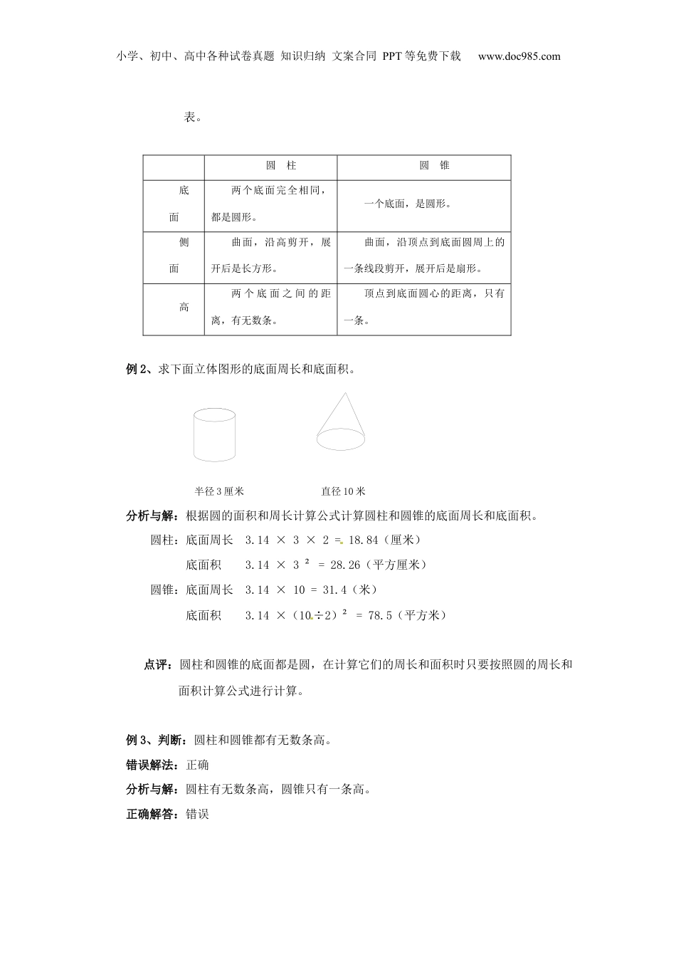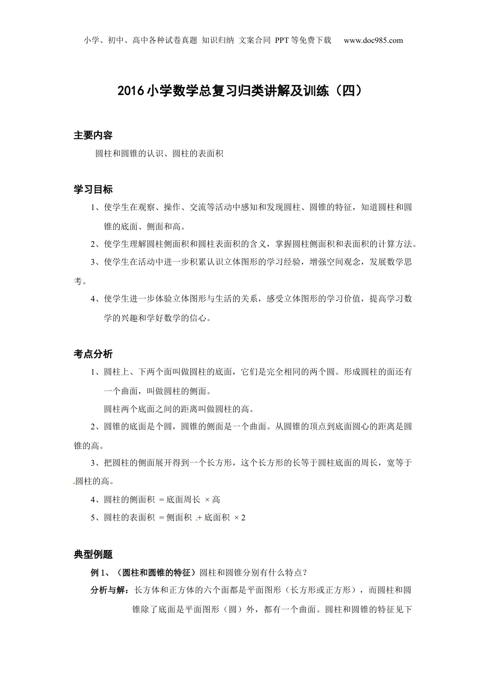 小学、初中、高中各种试卷真题知识归纳文案合同PPT等免费下载www.doc985.com2016小学数学总复习归类讲解及训练(四)主要内容圆柱和圆锥的认识、圆柱的表面积[来源:学科网ZXXK]学习目标1、使学生在观察、操作、交流等活动中感知和发现圆柱、圆锥的特征,知道圆柱和圆锥的底面、侧面和高。2、使学生理解圆柱侧面积和圆柱表面积的含义,掌握圆柱侧面积和表面积的计算方法。3、使学生在活动中进一步积累认识立体图形的学习经验,增强空间观念,发展数学思考。4、使学生进一步体验立体图形与生活的关系,感受立体图形的学习价值,提高学习数学的兴趣和学好数学的信心。[来源:学科网ZXXK]考点分析1、圆柱上、下两个面叫做圆柱的底面,它们是完全相同的两个圆。形成圆柱的面还有一个曲面,叫做圆柱的侧面。圆柱两个底面之间的距离叫做圆柱的高。2、圆锥的底面是个圆,圆锥的侧面是一个曲面。从圆锥的顶点到底面圆心的距离是圆锥的高。3、把圆柱的侧面展开得到一个长方形,这个长方形的长等于圆柱底面的周长,宽等于圆柱的高。4、圆柱的侧面积=底面周长×高5、圆柱的表面积=侧面积+底面积×2典型例题例1、(圆柱和圆锥的特征)圆柱和圆锥分别有什么特点?分析与解:长方体和正方体的六个面都是平面图形(长方形或正方形),而圆柱和圆锥除了底面是平面图形(圆)外,都有一个曲面。圆柱和圆锥的特征见下小学、初中、高中各种试卷真题知识归纳文案合同PPT等免费下载www.doc985.com表。圆柱圆锥底面两个底面完全相同,都是圆形。一个底面,是圆形。侧面曲面,沿高剪开,展开后是长方形。曲面,沿顶点到底面圆周上的一条线段剪开,展开后是扇形。高两个底面之间的距离,有无数条。顶点到底面圆心的距离,只有一条。例2、求下面立体图形的底面周长和底面积。半径3厘米直径10米分析与解:根据圆的面积和周长计算公式计算圆柱和圆锥的底面周长和底面积。圆柱:底面周长3.14×3×2=18.84(厘米)底面积3.14×3²=28.26(平方厘米)圆锥:底面周长3.14×10=31.4(米)底面积3.14×(10÷2)²=78.5(平方米)点评:圆柱和圆锥的底面都是圆,在计算它们的周长和面积时只要按照圆的周长和面积计算公式进行计算。例3、判断:圆柱和圆锥都有无数条高。错误解法:正确分析与解:圆柱有无数条高,圆锥只有一条高。正确解答:错误小学、初中、高中各种试卷真题知识归纳文案合同PPT等免费下载www.doc985.com点评:圆柱两个底面之间的距离叫做圆柱的高。两个底面之间有无数个对应的点,圆柱有无数条高。从圆锥的顶点到底面圆心的距离是圆锥的高。顶点和底面圆心都是唯一的点,所以圆锥只有一条高。例4、(圆柱的侧面积)体育一个圆柱,底面直径是5厘米,高是12厘米。求它的侧面积。分析与解:高底面周长沿着圆柱侧面的一条高剪开,将侧面展开,就得到一个长方形。这个长方形的长等于圆柱底面的周长,宽等于圆柱的高。因此,用圆柱的底面周长乘圆柱的高就得到这个长方形的面积,即圆柱的侧面积。解答:3.14×5×12=188.4(平方厘米)答:它的侧面积是188.4平方厘米。点评:圆柱的侧面是个曲面,不能直接求出它的面积。推导出侧面积的计算公式也用到了转化的思想。把这个曲面沿高剪开,然后平展开来,就能得到一个长方形,这个长方形的面积就是这个圆柱的侧面积。例5、(圆柱的表面积)做一个圆柱形油桶,底面直径是0.6米,高是1米,至少需要多少平方米铁皮?(得数保留整数)分析与解:求铁皮的面积,就是求圆柱形油桶的表面积,即两个底面积和一个侧面积的和。小学、初中、高中各种试卷真题知识归纳文案合同PPT等免费下载www.doc985.com解答:底面积:3.14×(0.6÷2)²=0.2826(平方米)侧面积:3.14×0.6×1=1.884(平方米)表面积:0.2826×2+1.884=2.4492(平方米)≈3(平方米)答:至少需要铁皮3平方米。点评:这里不能用四舍五入法取近似值。因为在实际生活中使用的材料要比计算得到的结果多一些。因此这儿保留整数,十分位上虽然是4,但也要向个位进1。例6、(辨析)一个无盖的圆柱铁皮水桶,底面直径是30厘米,高是50厘米。做这样一个水桶,至少需用铁皮6123平方厘米。分析与解:题目中是做一个无...