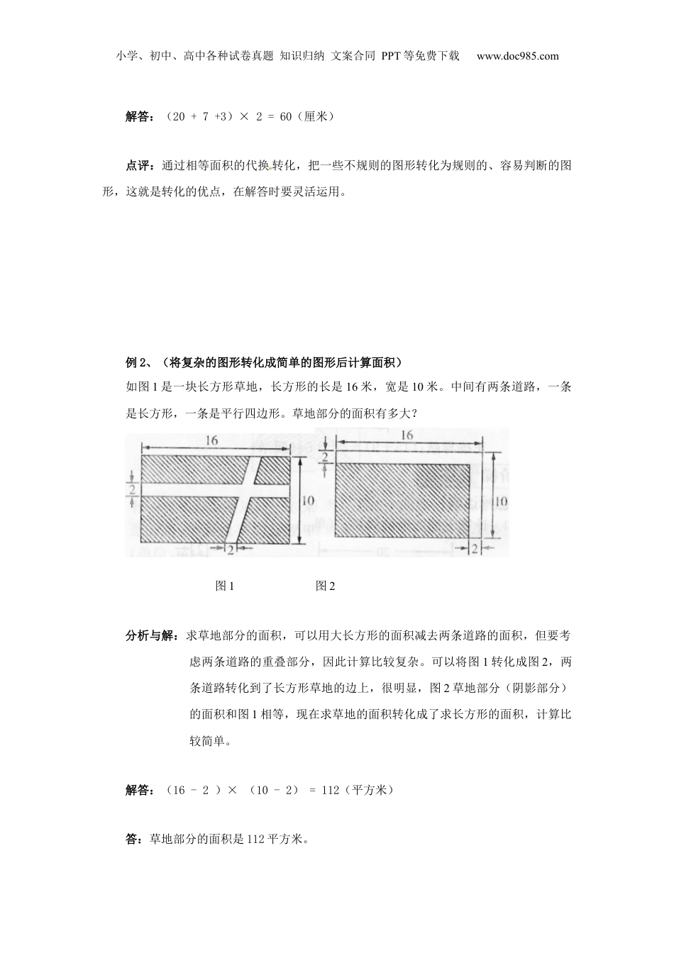 小学、初中、高中各种试卷真题知识归纳文案合同PPT等免费下载www.doc985.com小学数学总复习专题讲解及训练(十一)主要内容解决问题的策略[来源:学_科_网]学习目标1、让学生在直观的情境中想到转化,并应用图形的平移和旋转知识进行图形的等积,等周长的变形。2、在解决实际问题过程中体会转化的含义和应用的手段,感受转化在解决这个问题时的价值。3、进一步积累解决问题的经验,增强解决问题的“转化”意识,提高学好数学的信心。考点分析转化能把新颖的问题变成已经认识、已能解决的问题,从而创造性地利用已有的知识,经验。典型例题例1、(运用转化的策略巧算周长)求下面图形的周长。(单位:厘米)分析与解:求这个图形的周长,就是求围成这个图形的所有线段的长度和。图中有的线段的长度不知道,可以将其中的4条线段进行平移(如下图),平移之后形成一个长方形,长方形的周长和原来图形的周长是相等的。因此求原来图形周长的问题就转化成了求下图这个长方形的周长。小学、初中、高中各种试卷真题知识归纳文案合同PPT等免费下载www.doc985.com解答:(20+7+3)×2=60(厘米)点评:通过相等面积的代换转化,把一些不规则的图形转化为规则的、容易判断的图形,这就是转化的优点,在解答时要灵活运用。例2、(将复杂的图形转化成简单的图形后计算面积)如图1是一块长方形草地,长方形的长是16米,宽是10米。中间有两条道路,一条是长方形,一条是平行四边形。草地部分的面积有多大?图1图2分析与解:求草地部分的面积,可以用大长方形的面积减去两条道路的面积,但要考虑两条道路的重叠部分,因此计算比较复杂。可以将图1转化成图2,两条道路转化到了长方形草地的边上,很明显,图2草地部分(阴影部分)的面积和图1相等,现在求草地的面积转化成了求长方形的面积,计算比较简单。解答:(16-2)×(10-2)=112(平方米)答:草地部分的面积是112平方米。小学、初中、高中各种试卷真题知识归纳文案合同PPT等免费下载www.doc985.com例3、(辨析)下面图形的周长可以转化成长15厘米、宽9厘米的长方形来计算,即周长是(15+9)×2=48(厘米)。[来源:Z,xx,k.Com]分析与解:如下图,将长2厘米的线段移到上面,转化成了一个长方形,但还多两条3厘米的线段。正确解答:(15+9)×2+3×2=54(厘米)例4、(已知两个量之间的分率关系与它们的和,求这两个量)学校图书馆购进的科技书的册数是故事书的37,购进的科技书和故事书一共1500册。购进科技书多少册?分析与解:这类有关分数的实际问题可以用方程来解答。需要注意的是根据“购进的科技书的册数是故事书的37”故事书是单位“1”的量,要设故事书有x册,而不能直接设科技书有x册。解答:方法1:设故事书有x册,科技书有37x册。小学、初中、高中各种试卷真题知识归纳文案合同PPT等免费下载www.doc985.comX+37x=1500107x=1500x=105037x=37×1050=450答:购进科技书450册。很显然,上面解答过程比较复杂。可以这样想:把总数看作单位“1”,根据“购进的科技书的册数是故事书的37”,可以把故事书看成7份,科技书有这样的3份,一共有10份,科技书占总数的310;可以看出科技书和故事书的比是3:7,根据按比例分配问题的解法,可以知道科技书占总数的310。方法2:3÷(3+7)=3101500×310=450(册)[来源:学|科|网Z|X|X|K]答:购进科技书450册。例5、(辨析)红花的朵数比蓝花多27,蓝花的朵数就比红花少27。蓝花:红花:小学、初中、高中各种试卷真题知识归纳文案合同PPT等免费下载www.doc985.com分析与解:如图,根据“红花的朵数比蓝花多27”,蓝花是单位“1”的量,平均分成7份,红花有这样的9份。反过来,把红花看作单位“1”,红花平均分成了9份,蓝花相当于这样的7份,蓝花的朵数比红花少29。正确解答:红花的朵数比蓝花多27,蓝花的朵数就比红花少29。例6、(综合题)小明读一本书,已读的页数是未读页数的32。他再读30页,这时已读的页数是未读页数的73。这本书共多少页?分析与解:本题中已读的页数和未读的页数均发生了变化,不变的量是一本书的总页数,即已读的页数和未读页数的和没有变,把这本书的总页数看作单位“1”。...