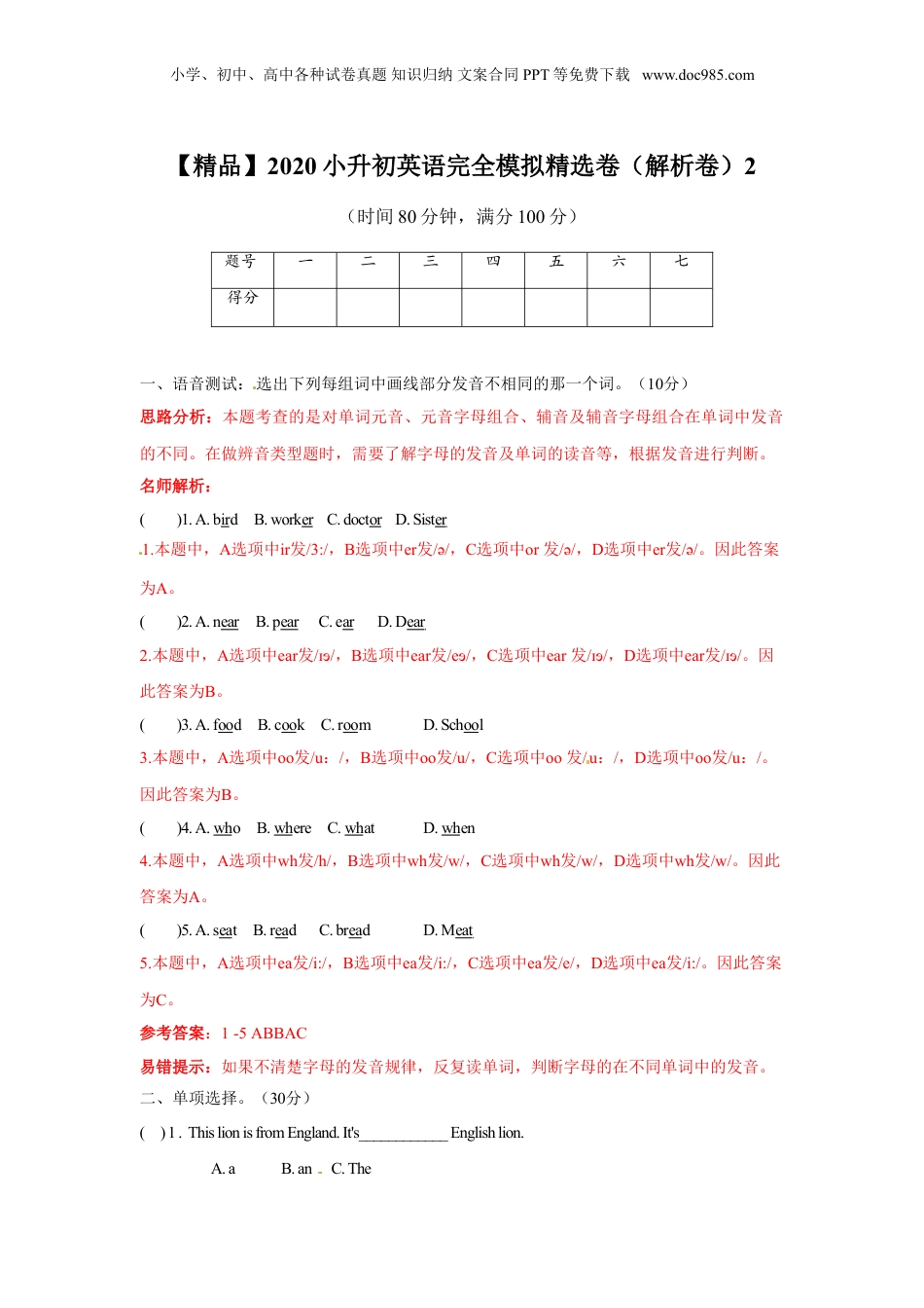 小学、初中、高中各种试卷真题知识归纳文案合同PPT等免费下载www.doc985.com【精品】2020小升初英语完全模拟精选卷(解析卷)2(时间80分钟,满分100分)一、语音测试:选出下列每组词中画线部分发音不相同的那一个词。(10分)思路分析:本题考查的是对单词元音、元音字母组合、辅音及辅音字母组合在单词中发音的不同。在做辨音类型题时,需要了解字母的发音及单词的读音等,根据发音进行判断。名师解析:()1.A.birdB.workerC.doctorD.Sister1.本题中,A选项中ir发/3:/,B选项中er发/ə/,C选项中or发/ə/,D选项中er发/ə/。因此答案为A。()2.A.nearB.pearC.earD.Dear2.本题中,A选项中ear发/ɪɘ/,B选项中ear发/eɘ/,C选项中ear发/ɪɘ/,D选项中ear发/ɪɘ/。因此答案为B。()3.A.foodB.cookC.roomD.School3.本题中,A选项中oo发/u:/,B选项中oo发/u/,C选项中oo发/u:/,D选项中oo发/u:/。因此答案为B。()4.A.whoB.whereC.whatD.when4.本题中,A选项中wh发/h/,B选项中wh发/w/,C选项中wh发/w/,D选项中wh发/w/。因此答案为A。()5.A.seatB.readC.breadD.Meat5.本题中,A选项中ea发/i:/,B选项中ea发/i:/,C选项中ea发/e/,D选项中ea发/i:/。因此答案为C。参考答案:1-5ABBAC易错提示:如果不清楚字母的发音规律,反复读单词,判断字母的在不同单词中的发音。二、单项选择。(30分)()1.ThislionisfromEngland.It's____________Englishlion.A.aB.anC.The[来源:Z_xx_k.Com]题号[来一二三四五六七得分小学、初中、高中各种试卷真题知识归纳文案合同PPT等免费下载www.doc985.com思路分析:本题考查的是冠词的基本用法。名师解析:冠词分为不定冠词(a,an)和定冠词(the)。不定冠词a用在发音以辅音开头的名词之前,而an则用在发音以元音开头的名词之前。定冠词the用来表示某个或某些特定的人或东西。本句的意思是,这头狮子来自英国,它是一只英国狮子。English是以元音音素开头的单词,故答案是B。参考答案:B易错提示:容易混淆定冠词和不定冠词的用法。()2.Thequestionisnoteasy,____________thelittleboycananswerit.A.soB.andC.But思路分析:本题考查的是so,and和but的基本用法。名师解析:so表示因此、所以之意,常用来连接两个简单句,这两个简单句有意思上的因果关系。and意为和,又,表示并列关系,常用来连接表示对等成分的单词、短语或者句子,表示意思的顺延或增补;but意为但是,表示转折关系,所连接的成分意思相反或相对。本题题意是,这个问题不简单,但是这个小男孩能够回答。参考答案:C易错提示:在做本题时容易混淆so,and和but的用法。()3.Therearemanypears________thetreeandthereisamonkey,___________it,too.A.in;onB.on;inC.in;in思路分析:本题考查的是短语inthetree和onthetree的区别。[来源:Zxxk.Com]名师解析:onthetree表示在树上,是指树上本来就有的东西,比如果实,花等。inthetree在树上,是指本身不属于树的东西藏在树里面了,比如人或动物爬到了树上。本题题意是,树上有很多梨子,还有一个猴子。梨子是本来就长在树上的,用onthetree;猴子是爬上树的,用inthetree。答案是B。参考答案:B[来源:学|科|网Z|X|X|K]易错提示:容易将onthetree和inthetree混淆。()4.-WhataboutgoingshoppingthisSaturdaymorning?-__________.A.Idon’twantto.B.Goodidea.C.Ilikeshopping.思路分析:本题考查的是对提建议的应答语的考查。名师解析:对别人提出的建议回答时常用的肯定回答:OK,Goodidea!...否定回答有:小学、初中、高中各种试卷真题知识归纳文案合同PPT等免费下载www.doc985.comSorry,Ihaveto...No,thanks...答案是B。参考答案:B易错提示:容易将whatabout开头的提建议问句当做特殊疑问句来回答。()5.Heisthirsty.Hewantssome_______.A.biscuitsB.noodlesC.coke[来源:学科网ZXXK]思路分析:本题考查的是可数名词和不可数名词的区别。名师解析:名词分为可数名词和不可数名词,表示人或事物的名词和集体名词等一般都是可数的,有单复数形式;物质名词或抽象名词一般都是不可数的它们没有单复数之分。在本题中some的后面既可以接可数名词的复数...
