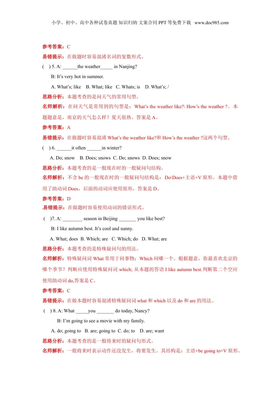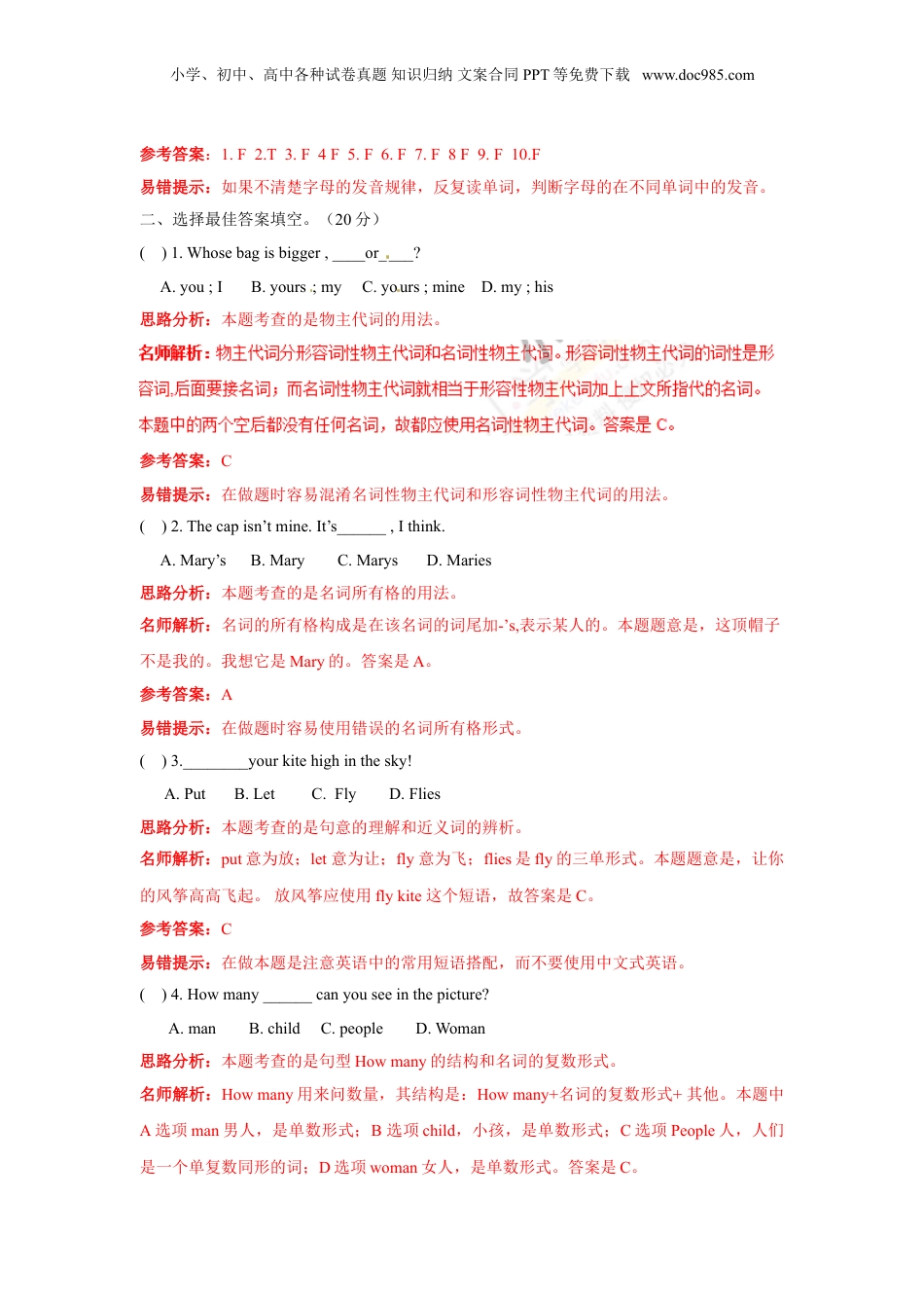 小学、初中、高中各种试卷真题知识归纳文案合同PPT等免费下载www.doc985.com【精品】2020小升初英语完全模拟精选卷(原卷)8(时间80分钟,满分100分)一、判断下列单词画线部分发音是(T)否(F)相同。(20分)思路分析:本题考查的是对单词元音、元音字母组合、辅音及辅音字母组合在单词中发音的不同。在做辨音类型题时,需要了解字母的发音及单词的读音等,根据发音进行判断。名师解析:()1.A.MarchB.parkC.quarter1.本题,A选项中ar发/a:/,B选项中ar发/a:/,C选项中ar发/ɔ:/。因此发音不同。()2.A.wonderfulB.loveC.front2.本题,A选项中o发/ʌ/,B选项中o发/ʌ/,C选项中o发/ʌ/。因此发音相同。()3.A.mustB.studentC.study3.本题,A选项中u发/ʌ/,B选项中o发/ju:/,C选项中u发/ʌ/。因此发音不同。()4.A.schoolB.goodC.foot4.本题,A选项中oo发/u:/,B选项中oo发/u/,C选项中oo发/u/。因此发音不同。()5.A.beginB.timeC.will5.本题,A选项中i发/i/,B选项中i发/ai/,C选项中i发/i/。因此发音不同。()6.A.brownB.howC.window6.本题,A选项中ow发/au/,B选项中ow发/au/,C选项中ow发/əu/。因此发音不同。()7.A.horseB.houseC.mouse7.本题,A选项中or发/ɔ:/,B选项中ou发/au/,C选项中ou发/au/。因此发音不同。()8.A.hadB.gameC.late8.本题,A选项中a发/ə/,B选项中a发/ei/,C选项中a发/ei/。因此发音不同。()9.A.meB.heC.letter9.本题,A选项中e发/i/,B选项中e发/i/,C选项中e发/ə/。因此发音不同。()10.A.nearB.learnC.hear10.本题,A选项中ear发/iə/,B选项中ear发/ə:/,C选项中ear发/iə/。因此发音不同。题号一二三四五六七得分小学、初中、高中各种试卷真题知识归纳文案合同PPT等免费下载www.doc985.com参考答案:1.F2.T3.F4F5.F6.F7.F8F9.F10.F易错提示:如果不清楚字母的发音规律,反复读单词,判断字母的在不同单词中的发音。二、选择最佳答案填空。(20分)()1.Whosebagisbigger,____or____?A.you;IB.yours;myC.yours;mineD.my;his思路分析:本题考查的是物主代词的用法。参考答案:C易错提示:在做题时容易混淆名词性物主代词和形容词性物主代词的用法。()2.Thecapisn’tmine.It’s______,Ithink.A.Mary’sB.MaryC.MarysD.Maries思路分析:本题考查的是名词所有格的用法。名师解析:名词的所有格构成是在该名词的词尾加-’s,表示某人的。本题题意是,这顶帽子不是我的。我想它是Mary的。答案是A。参考答案:A易错提示:在做题时容易使用错误的名词所有格形式。()3.________yourkitehighinthesky!A.PutB.LetC.FlyD.Flies思路分析:本题考查的是句意的理解和近义词的辨析。[来源:学科网ZXXK]名师解析:put意为放;let意为让;fly意为飞;flies是fly的三单形式。本题题意是,让你的风筝高高飞起。放风筝应使用flykite这个短语,故答案是C。参考答案:C易错提示:在做本题是注意英语中的常用短语搭配,而不要使用中文式英语。()4.Howmany______canyouseeinthepicture?A.manB.childC.peopleD.Woman[来源:Z,xx,k.Com]思路分析:本题考查的是句型Howmany的结构和名词的复数形式。名师解析:Howmany用来问数量,其结构是:Howmany+名词的复数形式+其他。本题中A选项man男人,是单数形式;B选项child,小孩,是单数形式;C选项People人,人们是一个单复数同形的词;D选项woman女人,是单数形式。答案是C。小学、初中、高中各种试卷真题知识归纳文案合同PPT等免费下载www.doc985.com参考答案:C易错提示:在做题时容易混淆名词的复数形式。()5.A:______theweather_____inNanjing?B:It’sveryhotinsummer.A.What’s;likeB.What;likeC.Whats;isD.What’s;/思路分析:本题考查的是问天气的常用句型。名师解析:在问天气是常用到的句型是:What’stheweatherlike?\How’stheweather?。本题题意是,南京的天气怎么样?夏天很热。答案是A。参考答案:A易错提示:在做题时容易混淆What’stheweatherlike?和How’stheweather?这两个句型。()6.______itoften______inwinter?A.Do;snowB.Does;snowsC.Do;snowsD.Does;snow思路分析:本题考查的是一般现在时的一般疑问句结构。名师...