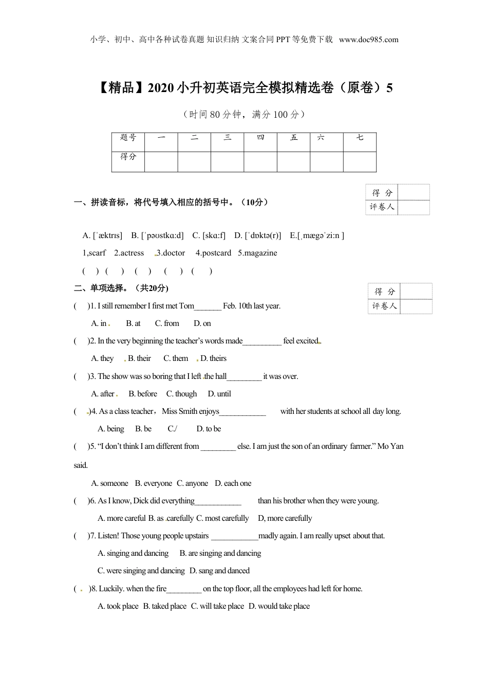 小学、初中、高中各种试卷真题知识归纳文案合同PPT等免费下载www.doc985.com【精品】2020小升初英语完全模拟精选卷(原卷)5(时间80分钟,满分100分)一、拼读音标,将代号填入相应的括号中。(10分)[来源:学科网ZXXK]A.[ˈæktrɪs]B.[ˈpəʊstkɑ:d]C.[skɑ:f]D.[ˈdɒktə(r)]E.[ˌmægəˈzi:n]1,scarf2.actress3.doctor4.postcard5.magazine()()()()()二、单项选择。(共20分)()1.IstillrememberIfirstmetTom_______Feb.10thlastyear.A.inB.atC.fromD.on()2.Intheverybeginningtheteacher’swordsmade__________feelexcited.A.theyB.theirC.themD.theirs()3.TheshowwassoboringthatIleftthehall_________itwasover.A.afterB.beforeC.thoughD.until()4.Asaclassteacher,MissSmithenjoys____________withherstudentsatschoolalldaylong.A.beingB.beC./D.tobe()5.“Idon’tthinkIamdifferentfrom_________else.Iamjustthesonofanordinaryfarmer.”MoYansaid.A.someoneB.everyoneC.anyoneD.eachone()6.AsIknow,Dickdideverything____________thanhisbrotherwhentheywereyoung.A.morecarefulB.ascarefullyC.mostcarefullyD,morecarefully()7.Listen!Thoseyoungpeopleupstairs___________madlyagain.Iamreallyupsetaboutthat.A.singinganddancingB.aresinginganddancingC.weresinginganddancingD.sanganddanced()8.Luckily.whenthefire_________onthetopfloor,alltheemployeeshadleftforhome.A.tookplaceB.takedplaceC.willtakeplaceD.wouldtakeplace题号一二三四五六[来源:Zxxk.Com]七得分得分评卷人得分评卷人小学、初中、高中各种试卷真题知识归纳文案合同PPT等免费下载www.doc985.com()9.Jacky’smotherwasn’tsurprisedtoseeherhungryson______allthefoodonthetablequickly.A.giveupB.lookupC.eatupD.getup()10.Canyoutellme____________________________?[来源:学科网]A.whatdidhehappenB.whathehappenedtoC.whathappenedtohimD.howhehappened三、完形填空。(共20分)D:Hello,Michael!MynameisDan.[来源:学科网]M:1,Dan.D:Howare2?M:3,thanks.This4myson.D:Oh,what's5name?M:HisnameisAlan.Andthisis6wife(妻子).78nameisJane.D:9herfamilyname?M:Jones.D:Thanksvery10.()1.A.OKB.FineC.Hello()2.A.IB.youC.she()3.A.I'mB.VerymuchC.Fine()4.A.isB.amC.are()5.A.yourB.herC.his()6.A.myB.yourC.her()7.A.MyB.HerC.His()8.A.firstB.familyC.last()9.A.WhatB.HowC.What's()10.A.tooB.muchC.OK四、对话配对。(共20分)()1.Whattimedoyougotoschooleveryday?()2.Whenwasheborn?得分评卷人得分评卷人小学、初中、高中各种试卷真题知识归纳文案合同PPT等免费下载www.doc985.com()3.Howdoyougotoworkeveryday?[来源:学科网]()4.Whoisthatman?[来源:学科网]()5.Canyoucometoraybirthdaypartytomorrow?E.Red.()6.Whatdoeshedo?()7.Whatisshedoing?()8.What’syourfavouritecolour?()9.AreyoufromAfrica?()10.Howoldisyourgrandfather?A.HewasbornonDecember21st.B.Sure,I’dliketo.C.Iwalktowork.D.Sheissinging.E.Red.F.Igotoschoolat8:00everyday.G.Heis65yearsold.H.Heismyfather.I.Yes,Iam.J.Heisateacher.五、按要求完成句子。(10分)1.Hissisterlikesbananasverymuch.(改为否定句)Hissister__________likebananasat__________.2.Igotoschoolbymetroeveryday.(对画线部分提问)____________________yougotoschooleveryday?3.Thepictureisverynice.(改为感叹句)__________anicepictureitis!4.Themousefoughtwiththecatmadly.(改为一般疑问句)__________themouse__________withthecatmadly?六、阅读并判断。对的写"T",错的写“F”。(10分)YesterdaywasSunday.Itwasafineday.Thesunwasshining.Theskywasblue.Mikegotupatsix.Hewateredtheflowersanddidsomeexercise.ThenhewokeHelenup.Anhourlater,theywenttotheBeihaiParkbytaxi.Theparkwasverybeautiful.Theyhad得分评卷人得分评卷人小学、初中、高中各种试卷真题知识归纳文案合同PPT等免费下载www.doc985.comlunchontheg...