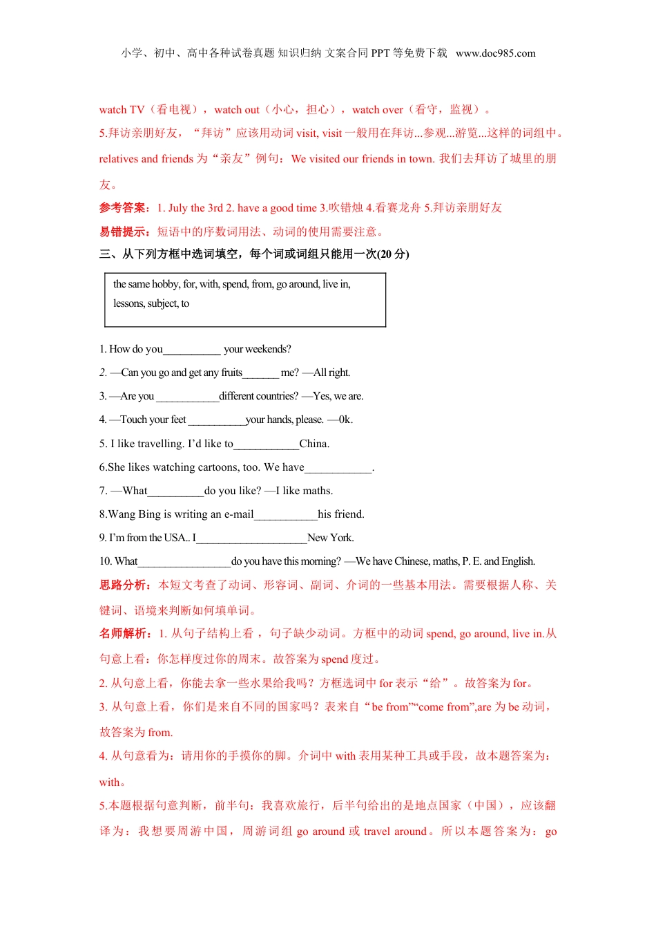 小学、初中、高中各种试卷真题知识归纳文案合同PPT等免费下载www.doc985.com【精品】2020小升初英语招生分班测试卷(解析卷)1(时间80分钟,满分100分)―、在每个小题的选项中找出一个不同类的,并将其标号填入括号内(10分)思路分析:本题考查的是对单词、词组的理解和掌握。在做归类类型题时,需要了解单词或词组的汉语意思及词性等,根据汉语意思及词性等进行归类。名师解析:()1.A.schoolB.teacherC.studentD.principal1.本题中,school意思为“学校”,teacher意思为“老师”,student意思为“学生”,principal意思为“校长”。从四个选项中看B,C,D都是学校里的人,属于学校里一部分。A选项学校是一个整体。答案为A。()2.A.bathroomB.friendC.bedroomD.livingroom2.本题中,bathroom意思为“卫生间”,friend意思为“朋友”,bedroom意思为“卧室”,livingroom意思为“客厅”。从四个选项中看A,C,D都属于地点,B选项朋友属于人。答案为B。()3.A.shelfB.chairC.sofaD.room3.本题中,shelf意思为“书架”,chair意思为“椅子”,sofa意思为“沙发”,room意思为“房间”。从四个选项中看A,B,C都属于家具,是选项D房间的一部分。答案为D。()4.A.lookB.keyC.makeD.close4.本题中,look意思为“看”,key意思为“钥匙”,make意思为“制作”,close意思为“关闭”。从四个选项中看A,C,D都属于动词,B选项是名词。所以答案为B。()5.A.longB.farC.headD.short5.本题中,long意思为“长的”,far意思为“远的”,head意思为“头”,short意思为“短的”。从四个选项中看A,B,D都属于形容词,C选项是名词。所以答案为C。()6.A.rainyB.coolC.hotD.weather6.本题中,rainy意思为“多雨的”,cool意思为“凉爽的”,hot意思为“热的”,weather意思为“天气”。从四个选项中看A,B,C都属于天气的一种。所以答案为D。题号一二三四五六七得分小学、初中、高中各种试卷真题知识归纳文案合同PPT等免费下载www.doc985.com()7.A.buyB.sendC.nameD.have7.本题中,buy意思为“买”,send意思为“送,发出”,name意思为“名字”,have意思为“有”。从四个选项中看A,B,D都属于动词,C选项是名词。所以答案为C。()8.A.classroomB.bathroomC.livingroomD.bedroom8.本题中,classroom意思为“教室”,bathroom意思为“卫生间”,livingroom意思为“客厅,起居室”,bedroom意思为“卧室”。从四个选项中看B,C,D都属于家里房间中一种。A选项教室则是属于学校的其中一间,所以答案为A。()9.A.openB.lookC.sitD.nice9.本题中,open意思为“打开”,look意思为“看”,sit意思为“坐”,nice意思为“好的”。从四个选项中看A,B,C都属于动词,D选项是形容词。所以答案为D。()10.A.favouriteB.doC.bigD.hot10.本题中,favourite意思为“最喜爱的”,do意思为“做”,big意思为“大的”,hot意思为“热的”。从四个选项中看A,C,D都属于形容词,B选项是动词。所以答案为B。参考答案:1.A2.B3.D4.B5.C6.D7.C8.A9.D10.B易错提示:将单词的汉语意思及词性识记混淆。二、中英文互译。(10分)7月3日____________玩得开心____________blowoutthecandles________________watchthedragonboatraces___________________visitrelativesandfriends______________________思路分析:本题主要考查一些常用的动词短语的拼写及翻译。名师解析:1.在写日期时,需要注意月份属于专有名词,首字母要大写。日要用序数词的缩写形式,序数词前要加定冠词the.例如:5月1日:Maythe1st.2.本题考察的是对短语“haveagoodtime”的掌握,不可将“玩”和“开心”拆开,翻译为“play”和“happy”。3.blowout,吹熄,吹灭。这里需要注意的是,加名词要放在blowout之后,而加代词要放在blowout中间。4.看赛龙舟,“看”应该用动词watch,watch一般用于看电视,比赛,打斗等。常用短语:小学、初中、高中各种试卷真题知识归纳文案合同PPT等免费下载www.doc985.comwatchTV(看电视),watchout(小心,担心),watchover(看守,监视)。5.拜访亲朋好友,“拜访”应该用动词visit,visit一般用在拜访...