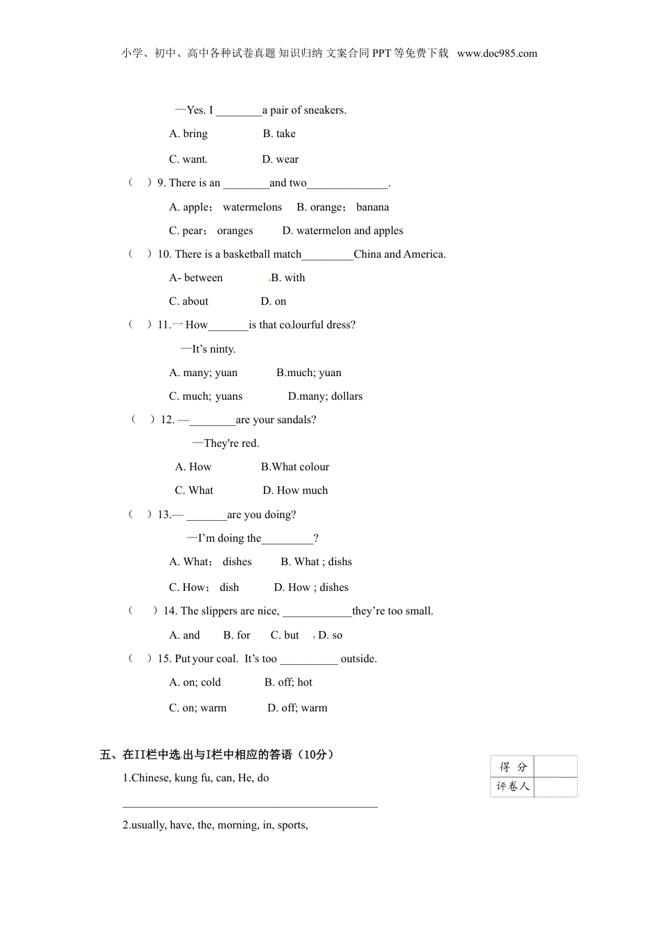 小学、初中、高中各种试卷真题知识归纳文案合同PPT等免费下载www.doc985.com【精品】2020小升初英语招生分班测试卷(原卷)3(时间80分钟,满分100分)―、读单词找出每组中不同类的一项。(10分)()1.A.watermelonB.bananaC.milkD.apple()2.A.policemanB.grandmaC.driverD.teacher()3.A.planeB.dollC.jigsawD.bear()4.A.sweaterB.computerC.dressD.trousers()5.A.walkB.bigC.smallD.famous()6.A.sickB.feverC.headacheD.toothache()7.A.living-roomB.kitchenC.bedroomD.classroom()8.A.planeB.footC.taxiD.car()9.A.purpleB.whiteC.brownD.color()10.A.slipperB.sandalC.sneakerD.shorts二、按要求写单词,将答案写在横线上(10分)1.heavy(比较级)___________________2.fly(过去式)_____________________[来源:Z#xx#k.Com]3.same(反义词)___________________4.plus(对应词)___________________5.rainy(名词)____________________6.carefully(形容词)_______________7.more(原形)____________________8.foggy(名词)___________________9.far(比较级)____________________10.miss(第三人称单数)____________三、用所给词的正确形式填空(10分)1.She____________(take)photosofthemountainslastweek.2.Doyouwantto____________(visit)yourgrandpa?题号一二三四五六七八[来源:学科网ZXXK]得分得分评卷人得分评卷人得分评卷人小学、初中、高中各种试卷真题知识归纳文案合同PPT等免费下载www.doc985.com3.Myschool___________(start)atnine9o'clock.4.YesterdayTom____________(fall)offthebed.5.Theywereveryhappyto____________(find)thenewclothesandfood.6.He________(listen)tomusicnow.7.Janet_________(get)upat7:30a.m.everyday,sosheisalwayslateforschool.8.Ithinkthe__________(four)lessonisthemostdifficultinthisbook.9.Lookatthesign.Thelibraryis___________(close)from1:00p.m.to2:00p.m.10.Jasonisusedto__________(watch)TVthewholenight.四、根据句子意思,选择正确的答案(30分)()1.Thecaris_________full_______move.A.too...tooB.to…tooC.too….toD.to…..to()2.Jim,pleasecome__________.A.thereB.tohereC.tohomeD.here()3.It’stimeto__________games.Wealllike__________games..A.playing,playingB.play,playC.playing,playD.play,playing()4.Let________________.Hemustgotoschool.A.hegoB.himgoC.hetogoD.himtogo()5.I’dlike_____________acupoftea.A.toeatB.todrinkC.eatD..drink()6.___________arethebigshoesontheshelf?A.WhatB.WhyC.WhenD.Howmuch()7.Thecoatisprettyandwarm.I’ll_______________it.A.takeB.boughtC.wantD.took()8.—CanIhelpyou?得分评卷人小学、初中、高中各种试卷真题知识归纳文案合同PPT等免费下载www.doc985.com—Yes.I________apairofsneakers.A.bringB.takeC.wantD.wear()9.Thereisan________andtwo______________.A.apple;watermelonsB.orange;bananaC.pear;orangesD.watermelonandapples()10.Thereisabasketballmatch_________ChinaandAmerica.A-betweenB.withC.aboutD.on()11.一How_______isthatcolourfuldress?—It’sninty.A.many;yuanB.much;yuanC.much;yuansD.many;dollars()12.—________areyoursandals?—They'rered.A.HowB.WhatcolourC.WhatD.Howmuch()13.—_______areyoudoing?—I’mdoingthe_________?A.What;dishesB.What;dishsC.How;dishD.How;dishes[来源:学科网]()14.Theslippersarenice,____________they’retoosmall.A.andB.forC.butD.so()15.Putyourcoal.It’stoo__________outside.A.on;coldB.off;hotC.on;warmD.off;warm五、在II栏中选出与I栏中相应的答语(10分)1.Chinese,kungfu,can,He,do____________________________________________2.usually,have,the,morning,in,sports,得分评卷人小学、初中、高中各种试卷真题知识归纳文案合同PPT等免费下载www.doc985.com____________________________________________3.hom...