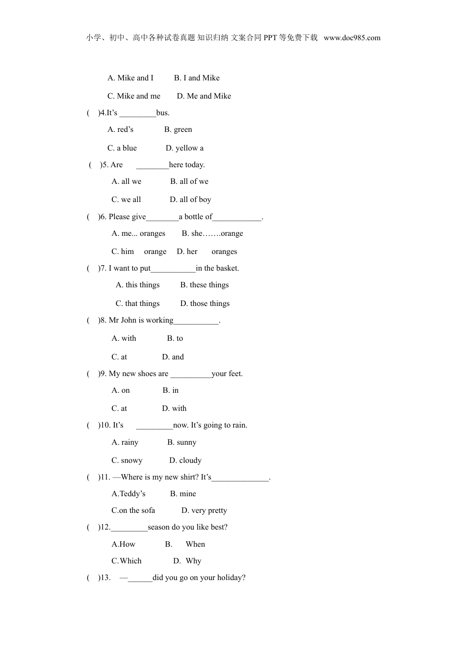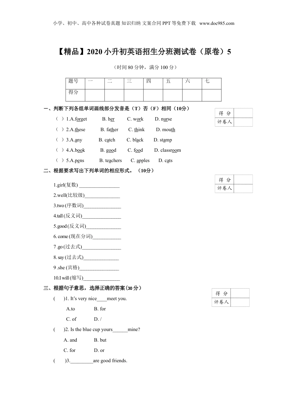 小学、初中、高中各种试卷真题知识归纳文案合同PPT等免费下载www.doc985.com【精品】2020小升初英语招生分班测试卷(原卷)5(时间80分钟,满分100分)―、判断下列各组单词画线部分发音是(T)否(F)相同(10分)()1.A.forgetB.herC.workD.nurse()2.A.theseB.fatherC.thinkD.mouth()3.A.anyB.catchC.blackD.stamp()4.A.bookB.goodC.foodD.classroom()5.A.pensB.teachersC.applesD.cats二、根据要求写出下列单词的相应形式。(10分)1.girl(复数)________________2.well(比较级)______________3.two(序数词)________________4.tall(反义词)________________5.good(反义词)_______________6.come(现在分词)____________7.go(过去式)________________8.say(过去式)_______________9.she(宾格)_________________10.Iwill(缩写)________________三、根据句子意思,选择正确的答案(30分)()1.It’sverynice____meetyou.A.toB.forC.ofD./()2.Isthebluecupyours______mine?A.andB.butC.forD.or()3._________aregoodfriends.题号一二三四五六七得分得分评卷人得分评卷人得分评卷人小学、初中、高中各种试卷真题知识归纳文案合同PPT等免费下载www.doc985.comA.MikeandIB.IandMikeC.MikeandmeD.MeandMike()4.It’s_________bus.A.red’sB.greenC.ablueD.yellowa()5.Are________heretoday.A.allweB.allofweC.weallD.allofboy()6.Pleasegive________abottleof____________.A.me...orangesB.she…….orangeC.himorangeD.heroranges()7.Iwanttoput___________inthebasket.A.thisthingsB.thesethingsC.thatthingsD.thosethings()8.MrJohnisworking___________.A.withB.toC.atD.and()9.Mynewshoesare__________yourfeet.A.onB.inC.atD.with()10.It’s_________now.It’sgoingtorain.A.rainyB.sunnyC.snowyD.cloudy()11.—Whereismynewshirt?It’s______________.A.Teddy’sB.mineC.onthesofaD.verypretty()12._________seasondoyoulikebest?A.HowB.WhenC.WhichD.Why()13.—______didyougoonyourholiday?小学、初中、高中各种试卷真题知识归纳文案合同PPT等免费下载www.doc985.com—I_____toLhasa.A.Where;wentB.WhatwentC.How;goD.How,went()14.It’scoldtoday,so___________yourcoat.A.putonB.takeoffC.washD.hangup()15.Thankyou_______helpingus.A.forB.becauseC.andD.at四、根据汉语提示完成句子(10分)1.My__________(生日)isin___________(二月).A:What’sthe_____________(日期)?2.B:__________________(九月一日).A:Whatareyoudoing?3.B:I’m__________________________(写电子邮件).4.Lookatthe___________(老虎).It’s____________(跑).A:What’sMikedoing?5.B:Heis______________(观看昆虫).五、情景匹配(10分)()1.当你想知道对方吃过午饭没有时,你应该问:A.Whendidyouhavelunch?B.Wheredidyouhavelunch?C.Haveyouhadyourlunch?()2.当你想询问去医院的路怎么走时,你应该问:A.Wheredidyougotothehospital?B.Howdoyougotothehospital?C.Whichisthewaytothehospital?()3.医护人员询问病人病情时应该问:A.What’syourtrouble?B.Howareyoufeeling?C.Howareyou?()4.当你想问“吉姆假期打算干什么?"时,你应该问:A.What'sJimdoingforvacation?B.Whatareyougoingtodo?C.WhereisJimgoingonvacation?得分评卷人得分评卷人小学、初中、高中各种试卷真题知识归纳文案合同PPT等免费下载www.doc985.com()5.营业员想问顾客需要买点什么时应该问:A,WhatcanIdoforyou?B.Whatdoyoulikebest?C.Wouldyoulikeacupoftea?六、连词成句(10分)1.me,again,try,let(.)____________________________________________2.basketball,let's,play,and,go(.)___________________________________3.move,can’t,now,I(.)___________________________________________4.I’ve,a,skirt,new,got(.)________________________________________5.excuse,are,a,you,me,teacher(?)________________________________七、阅读理解,根据短文回答问题(20分)(A)Mr.Whitelooksoutofhiswindow.Thereisaboy...