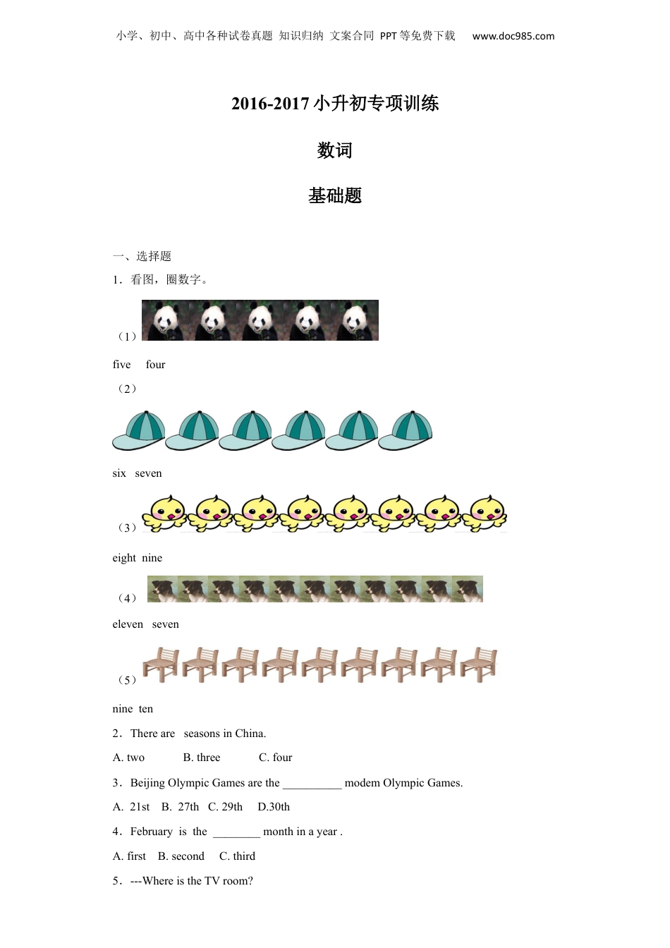 小学、初中、高中各种试卷真题知识归纳文案合同PPT等免费下载www.doc985.com2016-2017小升初专项训练数词基础题一、选择题1.看图,圈数字。(1)fivefour(2)sixseven(3)eightnine(4)elevenseven(5)nineten2.ThereareseasonsinChina.A.twoB.threeC.four3.BeijingOlympicGamesarethe__________modemOlympicGames.A.21stB.27thC.29thD.30th4.Februaryisthe________monthinayear.A.firstB.secondC.third5.---WhereistheTVroom?小学、初中、高中各种试卷真题知识归纳文案合同PPT等免费下载www.doc985.com---It’sonthe_____floor.A.oneB.firstC.two6.Howoldareyou?I'm.[来源:Z+xx+k.Com]A.eightB.8o'clockC.clock's87.选出不同类的一项。()(1).A.lookB.thirtyC.stop()(2).A.ninetyB.monkeyC.sixty()(3).A.atB.itC.they()(4).A.sunglassesB.toyC.seventy()(5).A.littleB.eightyC.forty8.—Doyouknow________studentsinourschool?—Yes.It’sabout________.A.anumberof;twohundredB.thenumberof;twohundredC.anumberof;twohundredsD.thenumberof;twohundreds9.It'sJanuary_______.A.12B.twelveC.12th10.Thisis________difficult.A.twoB.tooC.to11.---WhereistheTVroom?---It’sonthe_____floor.A.oneB.firstC.two12.Mondayisthe__________dayoftheweek.A.firstB.secondC.third13.Touchyoureyeswithyourfingers_____________.A.tentimesB.tentimeC.fortentimes14.What’sthedatetoday?It’sApril_______.A.twelveB.12st.C.12th15.Augustisthemonthoftheyear.A.eightB.eighthC.twelfth16.-Whichfloor?-The________floor,Room5A.A.fiveB.fifthC.fiveth小学、初中、高中各种试卷真题知识归纳文案合同PPT等免费下载www.doc985.com17.Therearealways______trafficlights.A.oneB.twoC.three18.—Whatisthirtyandtwelve?—It’s___________.A.fourty-oneB.forty-twoC.forty-oneD.fortytwo19.Thereare__________cowsonthefarm.A.twelfthB.twelveC.second20.TherearevisitorscomingtovisitBeijingeveryyear.A.millionB.hundredofC.thousandsof21.Ihavepencils.A.tenB.elevenC.twelve22.Januaryisthe________monthoftheyear.A.oneB.onceC.first23.Whenisyourbirthday?It’s______.A.June9B.Junethe9C.June9th.24.-Howlongistheroad?-It'sten______metreslong.A.thousandsB.thousandC.Hundred25.()Thereare_____animalsinChineseZodiac(生肖).A.twelveB.elevenC.twenty26.()Theshopisabout______awayfromhere.A.twohundredmetersB.twohundredsmetersC.twohundredmeterD.twohundredsmeter27.Theshopisabout______awayfromhere.A.twohundredmetersB.twohundredsmetersC.twohundredmeterD.twohundredsmeter28.Thereare______studentsinourclass.Thatis19boysand21girls.小学、初中、高中各种试卷真题知识归纳文案合同PPT等免费下载www.doc985.comA.fortyB.fortyC.fourteen29.Therearedaysinaweek.A.sixB.elevenC.seven30.选出下列单词中不同类的一项。()(1).A.wentB.tookC.visit()(2).A.withB.forC.plant()(3).A.cheeseB.crayonC.pencil()(4).A.sheB.herC.his()(5).A.fifteenB.twentyC.children二、填空题31.在括号里填写合适的英文数字。⑴seven+()=twelve()—four=nine⑵⑶three×five=()()÷seven=two⑷⑸()+ten=eleven()—one=twenty⑹⑺two×()=hundred()÷two=five⑻32.让我算一算。(将答案的字母标号填在等号的右边)(1).six+seven=(2).nine+five=(3).seven+eight=(4).nine+seven=(5).two+seventeen=(6).thirteen+seven=(7).six+eleven=(8).three+fifteen=(9).three+eight=(10.eight+four=[来源:Z#xx#k.Com]A.elevenB.twelveC.thirteenD.fourteenE.fifteenF.sixteenG.seventeen小学、初中、高中各种试卷真题知识归纳文案合同PPT等免费下载www.doc985.comH.eighteenI.nineteenJ.twenty33.根据题意,选择正确的一项。(1).17+16=________________(2).25+44=_________________(3).65+15=____...