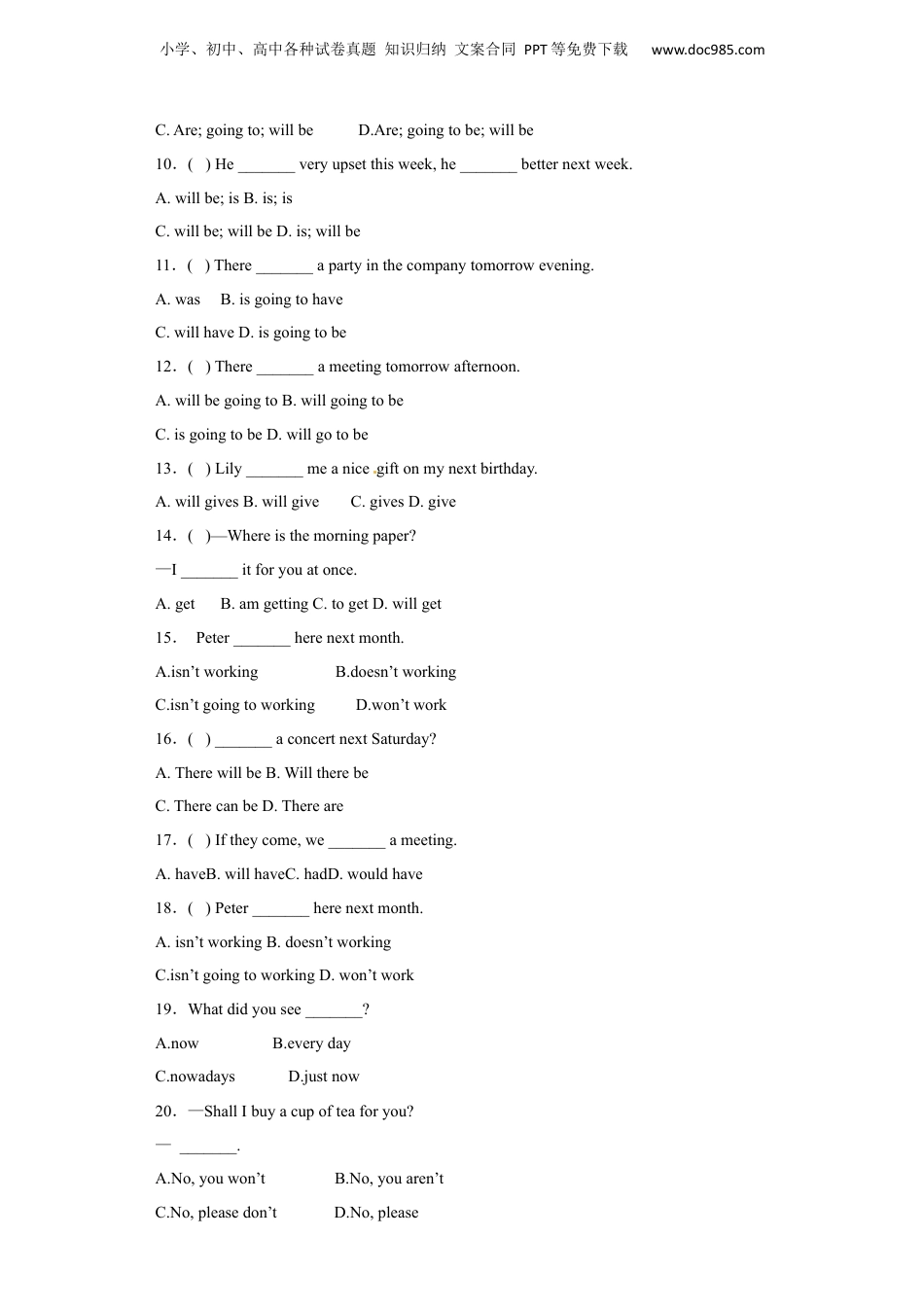 小学、初中、高中各种试卷真题知识归纳文案合同PPT等免费下载www.doc985.com2016-2017小升初专项训练一般将来时基础题一、选择题1.There_______apartyinthecompanytomorrowevening.A.wasB.isgoingtohaveC.willhaveD.isgoingtobe2.He_______veryupsetthisweek,he_______betternextweek.A.willbe;isB.is;isC.willbe;willbeD.is;willbe3.Iftheycome,we_______ameeting.A.haveB.willhaveC.hadD.wouldhave4.—_______youonholidaysoon?—-No,I_______onholidaynextmonth.A.Are;goingto;willB.Are;goingtobe;willC.Are;goingto;willbeD.Are;goingtobe;willbe5.—Whereisthemorningpaper?—I_______itforyouatonce.A.getB.amgettingC.togetD.willget6._______aconcertnextSaturday?A.TherewillbeB.WilltherebeC.TherecanbeD.Thereare7.Lily_______meanicegiftonmynextbirthday.A.willgivesB.willgiveC.givesD.give8.There_______ameetingtomorrowafternoon.A.willbegoingtoB.willgoingtobeC.isgoingtobeD.willgotobe9.()---_______youonholidaysoon?---No,I_______onholidaynextmonth.A.Are;goingto;willB.Are;goingtobe;will小学、初中、高中各种试卷真题知识归纳文案合同PPT等免费下载www.doc985.comC.Are;goingto;willbeD.Are;goingtobe;willbe10.()He_______veryupsetthisweek,he_______betternextweek.A.willbe;isB.is;isC.willbe;willbeD.is;willbe11.()There_______apartyinthecompanytomorrowevening.A.wasB.isgoingtohaveC.willhaveD.isgoingtobe12.()There_______ameetingtomorrowafternoon.A.willbegoingtoB.willgoingtobeC.isgoingtobeD.willgotobe13.()Lily_______meanicegiftonmynextbirthday.A.willgivesB.willgiveC.givesD.give14.()—Whereisthemorningpaper?—I_______itforyouatonce.A.getB.amgettingC.togetD.willget15.Peter_______herenextmonth.A.isn’tworkingB.doesn’tworkingC.isn’tgoingtoworkingD.won’twork16.()_______aconcertnextSaturday?A.TherewillbeB.WilltherebeC.TherecanbeD.Thereare17.()Iftheycome,we_______ameeting.A.haveB.willhaveC.hadD.wouldhave18.()Peter_______herenextmonth.A.isn’tworkingB.doesn’tworkingC.isn’tgoingtoworkingD.won’twork19.Whatdidyousee_______?A.nowB.everydayC.nowadaysD.justnow20.—ShallIbuyacupofteaforyou?—_______.A.No,youwon’tB.No,youaren’tC.No,pleasedon’tD.No,please小学、初中、高中各种试卷真题知识归纳文案合同PPT等免费下载www.doc985.com21.When_______Lee_______schoolthismorning?A.did;gottoB.did;gettoC.does;getD.did;got二、阅读理解22.阅读短文,判断正(T)误(F)。Amy:Whereareyougoingthissummerholiday?John:I’mgoingtoGuilin.Amy:Oh,Iwenttherewithmymomlastsummerholiday.、John:Really?Howdidyougetthere?Amy:IwenttoGuilinbytrain.Itwascrowdedonthetrain.John:I’mgoingtherebyplane.Amy;Goodidea.Whoareyougoingwith?John:I’mgoingwithmyparents.Amy:Guilinisverybeautiful.Wewereveryhappyonourtrip.Youwillhaveagoodtime.John:Thankyou.⑴JohnisgoingtoGuilinwithhisfatherandmotherthissummerholiday.⑵Amywenttherewithherparentslastyear.[来源:学科网]⑶Itwasnotcomfortabletogotherebytrain.⑷Johnisgoingtherebyplane.⑸GuilinisinnorthofChina.小学、初中、高中各种试卷真题知识归纳文案合同PPT等免费下载www.doc985.com提升题一、书面表达23.小作文。请以“myweekend”为题用一般将来时写一篇作文。(不少于5句话)_________________________________________________________________________________________________________________________________________________________________________________________________________________________________________________________________________________________________________________________________________________________________________________________...