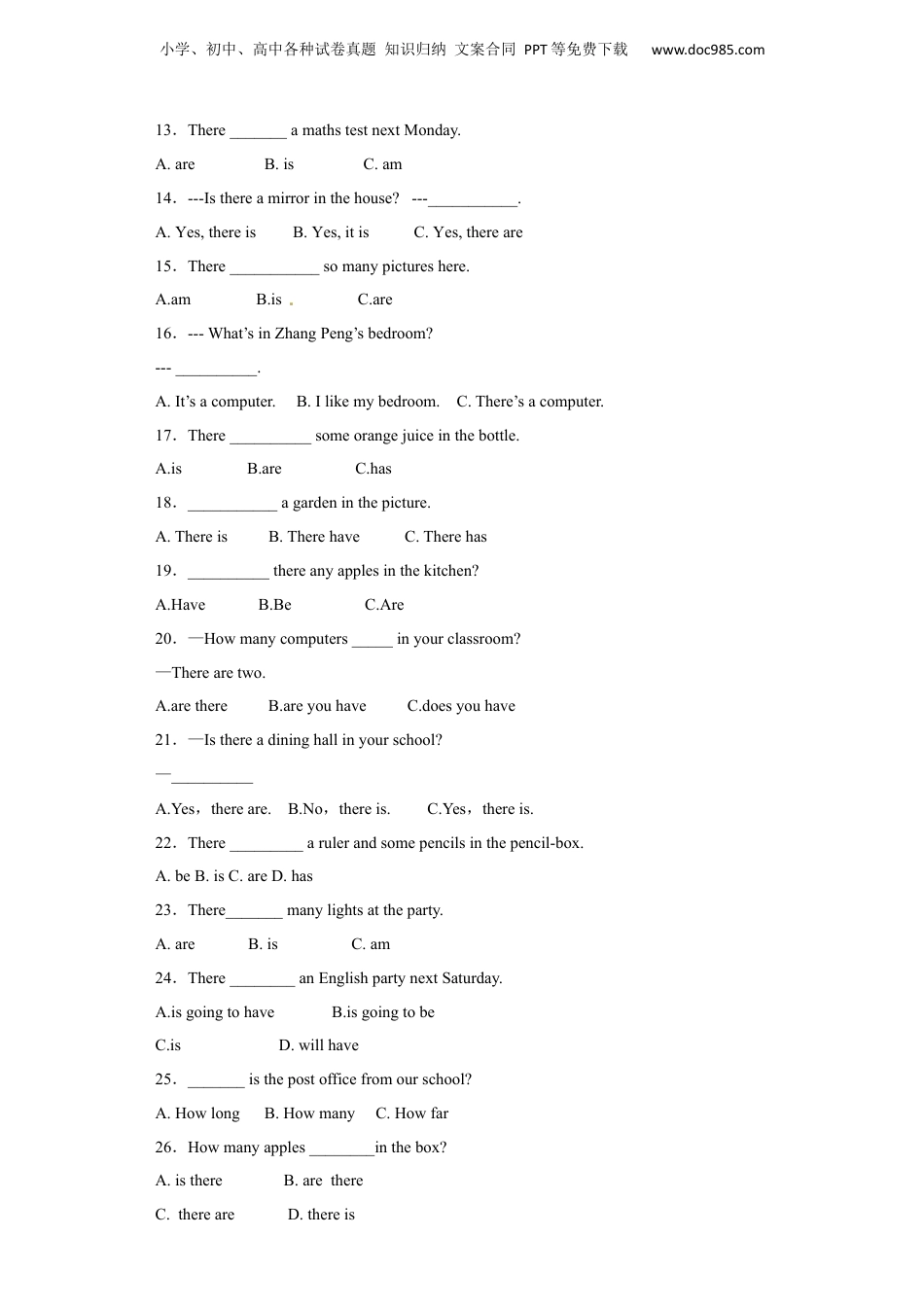 小学、初中、高中各种试卷真题知识归纳文案合同PPT等免费下载www.doc985.com2016-2017小升初专项训练Therebe结构基础题一、选择题1.There______somegrassandsometreesinthepark.A.isB.areC.be2.——Isthereaparknearhere?——_______A.Yes,itisB.No,thereisC.Yes,thereis3.There__________manytreesintheforest.A.isB.amC.are4.Thereare_____tallbuildingsinthevillage.[来源:学&科&网]A.notsomeB.noC.any5.Thereare___tallbuildingsinthevillage.A.notsomeB.noC.any6.There____ariverinthepark.Butthere’salake.A.isB.hasn’tC.isn’t7.Thereare___tallbuildingsinthevillage.A.notsomeB.noC.any8.Thereasignoverthere.It“Nolittering”.A.are,meansB.is,meansC.is,mean9.Theresomewaterinthebottle.A.areB.isC.am10.There_____toychicksandflowersonthehat.A.isB.areC.amD.does11.There________twoEnglishbooksinmybag.A.amB.isC.are12.There________ajugglerandaboyoverthere.A.amB.isC.are小学、初中、高中各种试卷真题知识归纳文案合同PPT等免费下载www.doc985.com13.There_______amathstestnextMonday.A.areB.isC.am14.---Isthereamirrorinthehouse?---___________.A.Yes,thereisB.Yes,itisC.Yes,thereare15.There___________somanypictureshere.A.amB.isC.are16.---What’sinZhangPeng’sbedroom?---__________.A.It’sacomputer.B.Ilikemybedroom.C.There’sacomputer.17.There__________someorangejuiceinthebottle.A.isB.areC.has18.___________agardeninthepicture.A.ThereisB.TherehaveC.Therehas19.__________thereanyapplesinthekitchen?A.HaveB.BeC.Are20.—Howmanycomputers_____inyourclassroom?—Therearetwo.A.arethereB.areyouhaveC.doesyouhave21.—Isthereadininghallinyourschool?—__________A.Yes,thereare.B.No,thereis.C.Yes,thereis.22.There_________arulerandsomepencilsinthepencil-box.A.beB.isC.areD.has23.There_______manylightsattheparty.A.areB.isC.am24.There________anEnglishpartynextSaturday.A.isgoingtohaveB.isgoingtobeC.isD.willhave25._______isthepostofficefromourschool?A.HowlongB.HowmanyC.Howfar26.Howmanyapples________inthebox?A.isthereB.arethereC.thereareD.thereis小学、初中、高中各种试卷真题知识归纳文案合同PPT等免费下载www.doc985.com27.Howmanyapples_______________inthebox?A.isthereB.arethereC.thereareD.thereis28.Howmanyapples_______________inthebox?A.isthereB.arethereC.thereareD.thereis29.Howmanyapples_______________inthebox?A.isthereB.arethereC.thereareD.thereis30.There______somebigtreestheremanyyearsago.A.areB.wasC.were31.There_____anappleandfourorangesinthefridge.A.amB.isC.are32.There_________much_____onthetable.A.is,breadB.is,breadsC.are,breadD.are,breads33.There______muchfoodonthetable.A.isB.areC.have34.There____nocomputersorInternetinmytime.A.wereB.wasC.is35.There______nolibraryinmyoldschool.A.wereB.wasC.is36.There_______somemilkinthebottle..A.isB.amC.are37.There_____twoglassesofcoffeeonthetable.isB.areC.am38.There_________afootballandfourbasketballsinthesportshall.A.isB.areC.aren’t39.anymilkintheglass?A.ThereisB.ArethereC.Isthere40.Arethere___________ballsintheclassroom?Yes,__________.A.some,thereareB.any,thereareC.any,therearen’t二、填空题小学、初中、高中各种试卷真题知识归纳文案合同PPT等免费下载www.doc985.com41.用“Thereare,thereis”填空。1)___________________manyroadsinthecity.2)___________________tallbuildingsinthecity.3)___________________apathinthegarden.4)___________________aschoolnearmyhome.42.用a,an,some,any填空。1)Thereis_________dressonthebed.2)Isthere_________orangepencilinthepencilbox?3)Thereare__________blu...