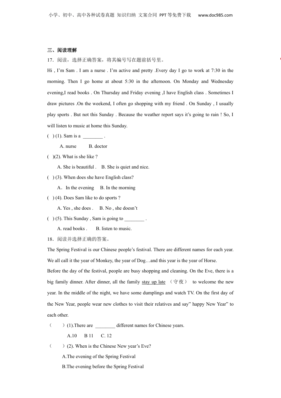 小学、初中、高中各种试卷真题知识归纳文案合同PPT等免费下载www.doc985.com2016-2017小升初专项训练小升初总复习模拟六第I卷一、选择题()1.—Canhesing?—______________.A.Yes,hecan.B.No,hecan’t.C.No,hecan.()2.Shecan’tmakewell.Sheis________.A.happyB.tiredC.sad()3.--___________pensdoyouhave?--Five.A.HowmuchB.HowmanyC.How()4.Here___________yourcap.A.areB.amC.is()5.Ihave__________presents.A.aB.anC.many()6.WesawChinese_______.A.danceB.dancesC.dancing()7.Let________gotothelibrary.A.isB.hasC.us()8.Allofthesepostcardsare_______Canada.A.fromB.forC.of()9.Thereare______shopsinthisstreet.A.lotofB.alotC.lotsof()10.Thecityisabout______awayfromhere.小学、初中、高中各种试卷真题知识归纳文案合同PPT等免费下载www.doc985.comA.twohundredmetresB.twohundredsmetresC.twohundredmetre()11.Whatareyoudoing,Daming?I’m_________anemailtomyfriend.A.sendB.sendsC.sending()12.Doyouwant__________toChinatown?A.togoB.goC.goes()13.It'sapicture______theHuangshanMountain.A.ofB.withC./()14.Beijing____aboutfourteenmillionpeople.A.haveB.havegotC.hasgot()15.NewYorkis___ofAmerica.A.ineastB.intheeastC.attheeast二、完形填空16.完形填空。NBAisthemostfamousbasketballgameintheworld.There____(1)____aChineseplayerinthisgame.HisnameisYaoMing.Heis____(2)____playerinthisgame.Inhissparetime,Yao____(3)____cars.OnlastChristmas,hedrove____(4)___oldcartovisitoneofhis____(5)___.Onhisway,he___(6)___apolicemanfollowinghim.Finally,hestoppedandsaidtothepoliceman:“_____(7)____Christmas,sir.Isthereanythingwrongwithme?”.“No,ofcoursenot”answeredthepoliceman.“Then____(8)____didyou____(9)_____me?”askedYao.“___(10)____beangry.”saidthepoliceman:“Youdidnothingwrong,Ionlywanttoaskyouforasignature(签名)!”()(1).A.beB.areC.is()(2).A.tallB.thetallestC.tallest()(3).A.1ikesdrivingB.1ikesdriveC.1ikedriving()(4).A.aB.anC.the()(5).A.friendsB.friendC.thefriend()(6).A.seesB.seedC.saw()(7).A.MarryB.MerryC.Happy()(8).A.WhyB.HowC.When()(9).A.askB.followC.stopped()(10).A.Don’tB.Youdon’tC.Youcan't小学、初中、高中各种试卷真题知识归纳文案合同PPT等免费下载www.doc985.com三、阅读理解17.阅读,选择正确答案,将其编号写在题前括号里。Hi,I’mSam.Iamanurse.I’mactiveandpretty.EverydayIgotoworkat7:30inthemorning.ThenIgohomeatabout5:30intheafternoon.OnMondayandWednesdayevening,Ireadbooks.OnThursdayandFridayevening,IhaveEnglishclass.SometimesIdrawpictures.Ontheweekend,Ioftengoshoppingwithmyfriend.OnSunday,Iusuallyplaysports.ButnotthisSunday.Becausetheweatherreportsaysit’sgoingtorain!So,IwilllistentomusicathomethisSunday.()(1).Samisa________.A.nurseB.doctor()(2).Whatisshelike?A.Sheisbeautiful.B.Sheisquietandnice.()(3).WhendoesshehaveEnglishclass?A.IntheeveningB.Inthemorning()(4).DoesSamliketodosports?A.Yes,shedoes.B.No,shedoesn’t()(5).ThisSunday,Samisgoingto________.A.readbooks.B.listentomusic.18.阅读并选择正确的答案。TheSpringFestivalisourChinesepeople’sfestival.Therearedifferentnamesforeachyear.WeallcallittheyearofMonkey,theyearofDog…andthisyearistheyearofHorse.Beforethedayofthefestival,peoplearebusyshoppingandcleaning.OntheEve,thereisabigfamilydinner.Afterdinner,allthefamilystayuplate(守夜)towelcomethenewyear.Inthemiddleofthenight,wehavesomedumplingsandwatchTV.OnthefirstdayoftheNewYear,peoplewearnewclothestovisittheirrelativesandsay”happyNewYear”toeachother.()(1).Thereare________differentnamesforChineseyears.A.10B11C.12()(2).Whenist...