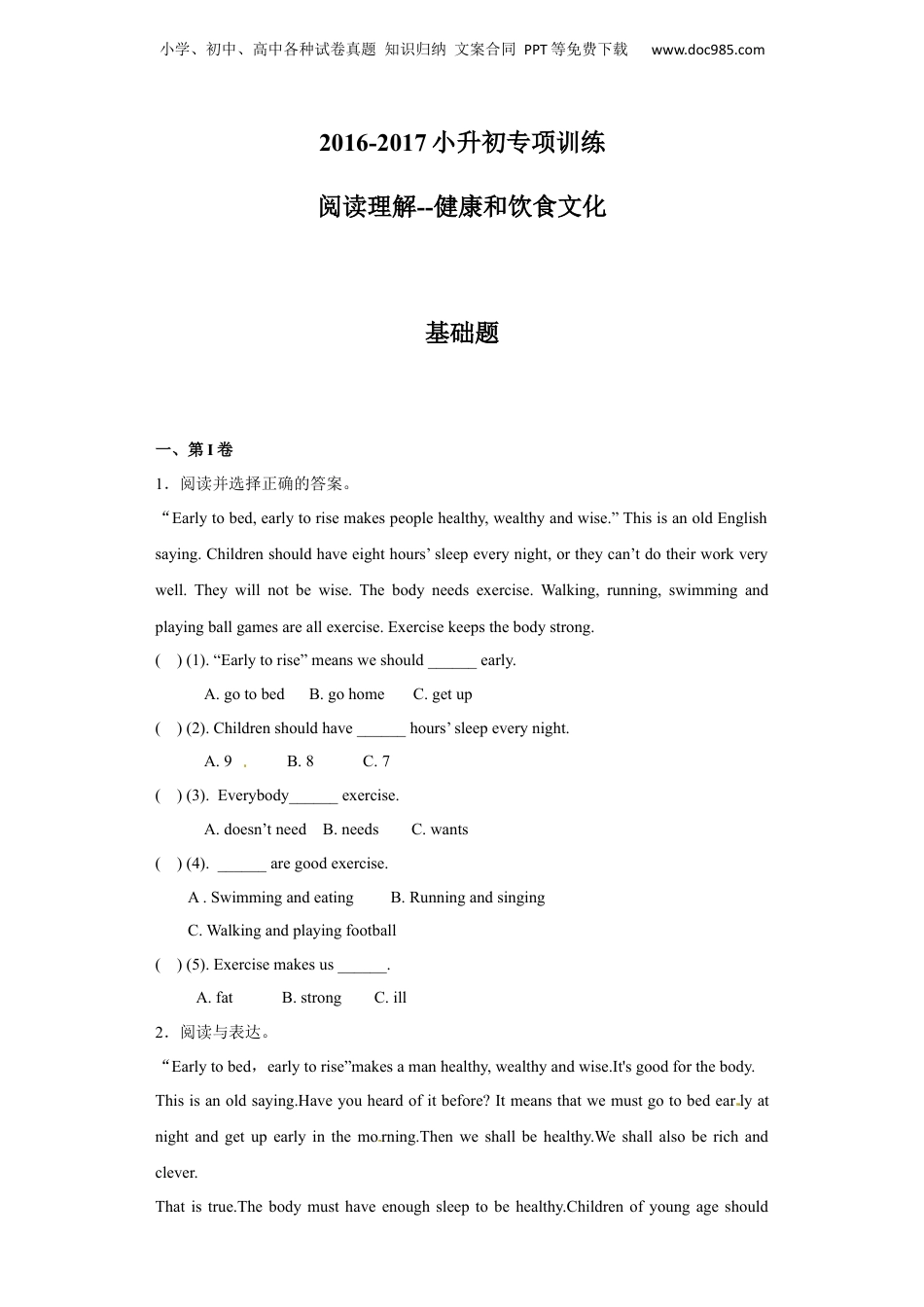 小学、初中、高中各种试卷真题知识归纳文案合同PPT等免费下载www.doc985.com2016-2017小升初专项训练阅读理解--健康和饮食文化基础题一、第I卷1.阅读并选择正确的答案。“Earlytobed,earlytorisemakespeoplehealthy,wealthyandwise.”ThisisanoldEnglishsaying.Childrenshouldhaveeighthours’sleepeverynight,ortheycan’tdotheirworkverywell.Theywillnotbewise.Thebodyneedsexercise.Walking,running,swimmingandplayingballgamesareallexercise.Exercisekeepsthebodystrong.()(1).“Earlytorise”meansweshould______early.A.gotobedB.gohomeC.getup()(2).Childrenshouldhave______hours’sleepeverynight.A.9B.8C.7()(3).Everybody______exercise.A.doesn’tneedB.needsC.wants()(4).______aregoodexercise.A.SwimmingandeatingB.RunningandsingingC.Walkingandplayingfootball()(5).Exercisemakesus______.A.fatB.strongC.ill2.阅读与表达。“Earlytobed,earlytorise”makesamanhealthy,wealthyandwise.It'sgoodforthebody.Thisisanoldsaying.Haveyouheardofitbefore?Itmeansthatwemustgotobedearlyatnightandgetupearlyinthemorning.Thenweshallbehealthy.Weshallalsoberichandclever.Thatistrue.Thebodymusthaveenoughsleeptobehealthy.Childrenofyoungageshould小学、初中、高中各种试卷真题知识归纳文案合同PPT等免费下载www.doc985.comhaveenoughsleep,ortheycan'tdotheirworkverywell.Theywillnotbewiseandtheymaynotbecomewealthy!Thebodyalsoneedsexercise:walking,running,jumping,swimming,playinggamesandallotherexercise.Exercisekeepsthebodystrong.Exercisealsohelpsthebloodtomovearoundinsidethebody.Thisisveryimportant.Ourbloodtakesfoodtoallpartsofourbody.Theheadalsoneedsblood.Exercisehelpsustothinkbetter.根据短文内容,回答问题。(1).Whatdoes“earlytobed.earlytorise”mean?_____________________________________(2).Whatmustthebodyhavetobehealthy?_____________________________________(3).WhatwillhappentoChildrenofyoungagewhodon'thaveenoughsleep?_____________________________________(4).Whatkeepsthebodystrong?_____________________________________(5).Whattakesfoodtoallpartsofourbody?_____________________________________3.RedApplesGymSwimmingMon.~Fri.6:00a.m.~6:00p.m.BasketballMon.~Sun.8:00a.m.~6:00p.m.VolleyballMon.~Sun.8:00a.m.~6:00p.m.AerobicsMon.~Sun.8:00a.m.~9:00p.m.Tel:6589417WelcomeYou!GreenTreesGym(体育馆)SwimmingMon.~Sun.8:00a.m.~8:00p.m.BasketballSat.~Sun.8:00a.m.~6:00p.m.VolleyballMon.~Sat.10:00a.m.~6:00p.m.Aerobics(健身操)Mon.~Sun.6:00a.m.~9:00p.m.Tel:6227225E-mail:greentrees@yahoo.com根据上面广告选择最佳答案。小学、初中、高中各种试卷真题知识归纳文案合同PPT等免费下载www.doc985.com()IwanttogoswimmingonSunday.WherecanIgo?⑴A.GreenTreesGym.B.RedApplesGym.C.BothGreenTreesGymandRedApplesGym.D.Youcan'tgoswimmingonSunday.()IwanttoplaybasketballonMondaymorning.WherecanIgo?⑵A.GreenTreesGym.B.RedApplesGym.C.BothGreenTreesGymandRedApplesGym.D.GreenApplesGym.()Iplayvolleyballat9:00everymorning.Wherecanyoufindme?⑶A.GreenTreesGym.B.RedApplesGym.C.BothGreenTreesGymandRedApplesGym.D.Athome.()Idoaerobicseveryafternoon.Soyoucancallmeat6589417.Doyouknowwhere⑷I'mgoingtobe(将会在)?A.AtGreenBallsGym.B.AtRedApplesGym.C.intheschool.D.Ontheplayground.()Whichgymaccepts(⑸接受)mailfromcomputer?___________.A.GreenBallsGym.B.RedApplesGym.C.GreenTreesGym.D.RedTreesGym.4.根据短文内容,把下列句子补充完整。InChina,moststudentsgotoschoolbybikeorbybus.Iftheschoolisnotfar,theycanwalktoschooleveryday.Fewstudentsarelateforschool.Butthingsaredifferentinothercountries.InmanyWesterncountries,studentslive...
