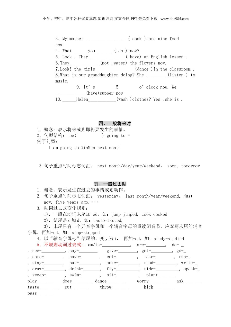 小学、初中、高中各种试卷真题知识归纳文案合同PPT等免费下载www.doc985.com小学英语语法点复习归纳一、名词复数规则1.一般情况下,直接加-s,如:book-books,bag-bags,cat-cats,bed-beds2.以s、x、sh、ch结尾,加-es,如:bus-buses,box-boxes,brush-brushes,watch-watches3.以“辅音字母+y”结尾,变y为i,再加-es,如:family-families,strawberry-strawberries4.以“f或fe”结尾,变f或fe为v,再加-es,如:knife-knives5.不规则名词复数:man-,woman-,policeman-policewoman-,mouse-child-foot-,.tooth-fish-,people-,Chinese-,Japanese-I_________him_________this___________her______watch_______that_______photo________diary______day________foot________book_______dress________tooth_______sheep______box_______strawberry_____thief_______yo-yo______peach______sandwich______tomato______potato_______paper_______juice___________water________milk________rice__________tea__________porkmutton二、一般现在时1.重点:(句子特征;以及第三人称动词的变化原则)2.句子出现的时间标志为:often,usually,everyday,…等词汇)3.动词变化规则:1).一般情况下,直接加-s,如:cook-cooks,milk-milks,climbs,cleans2).以s.x.sh.ch.o结尾,加-es,如:guess-guesses,wash-washes,watch-watches,go-goes3).以“辅音字母+y”结尾,变y为i,再加-es,如:study-studies专项练习:一.写出一下东西的第三人称单数形式:drink________go_______stay________make________look_________have_______pass_______carry____come________watch______plant_______fly________study_______brush________do_________teach_______小学、初中、高中各种试卷真题知识归纳文案合同PPT等免费下载www.doc985.com二.用所给单词的正确形式填空1.Heoften________(have)dinnerathome.2.DanielandTommy_______(be)inClassOne.3.We_______(notwatch)TVonMonday.4.Nick_______(notgo)tothezooonSunday.5.______they________(like)theWorldCup?6.What_______theyoften_______(do)onSaturdays?7._______yourparents_______(read)newspaperseveryday?8.Thegirl_______(teach)usEnglishonSundays.9.SheandI________(take)awalktogethereveryevening.10.There________(be)somewaterinthebottle.11.Mike_______(like)cooking.12.They_______(have)thesamehobby.13.Myaunt_______(look)afterherbabycarefully.14.Youalways_______(do)yourhomeworkwell.15.I_______(be)ill.I’mstayinginbed.16.She_______(go)toschoolfromMondaytoFriday.17.LiuTao_______(do)notlikePE.18.Thechildoften_______(watch)TVintheevening.19.SuHaiandSuYang_______(have)eightlessonsthisterm.20.Whatday_______(be)ittoday?三、现在进行时1.概念:表示正在进行的动作。2重点时间标志词汇:now,look,listen(放句子开头)3.句型结构:be+动词ing.4.动词+ing变化规则:1).一般情况下,直接加ing,如:cook-cooking,playing,watching2).以不发音的e结尾,去e加ing,如:make-making,taste-tasting3).如果末尾是一个元音字母和一个辅音字母,双写末尾的辅音字母,再加ing,如:run-running,stop-stopping,一、写出下列动词的现在分词:play________run__________swim_________make__________go_________like________write_________ski___________read________have_________sing________dance_________put_________see________buy_________love____________live_______take_________come________get_________stop_________sit________begin________shop___________二、用所给的动词的正确形式填空:1.Theboy__________________(draw)apicturenow.2.Listen.Somegirls_______________(sing)intheclassroom.小学、初中、高中各种试卷真题知识归纳文案合同PPT等免费下载www.doc985.com3.Mymother_________________(cook)somenicefoodnow.4.What_____you______(do)now?5.Look.They_______________(hav...
