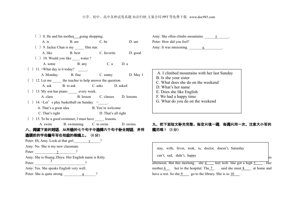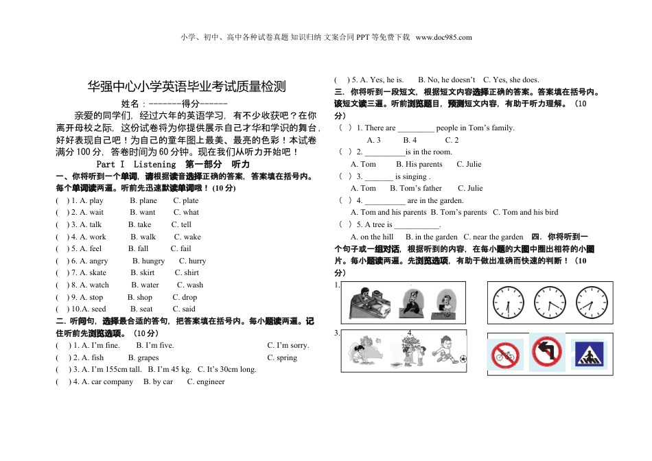 小学、初中、高中各种试卷真题知识归纳文案合同PPT等免费下载www.doc985.com华强中心小学英语毕业考试质量检测姓名:-------得分------的同学,六年的英学,有不少收吧?在你亲爱们经过语习获离开母校之,份卷将你提供展示自己才和学的舞台际这试为华识,好好表自己吧!自己的童年上最美、最亮的色彩!本卷现为图试分满100分,答卷时间为60分。在我从听力开始吧!钟现们PartIListening第一部分听力一、你将听到一个,根据音正确的答案,答案填在括号内。单词请读选择每个两遍。听前先迅速默哦!单词读读单词(10分)()1.A.playB.planeC.plate()2.A.waitB.wantC.what()3.A.talkB.takeC.tell()4.A.workB.walkC.wake()5.A.feelB.fallC.fail()6.A.angryB.hungryC.hurry()7.A.skateB.skirtC.shirt()8.A.watchB.waterC.wash()9.A.stopB.shopC.drop()10.A.seedB.seatC.said二.听句,最合适的答句,把答案填在括号内。每小两遍。问选择题读记住听前先。(浏览选项10分)()1.A.I’mfine.B.I’mfive.C.I’msorry.()2.A.fishB.grapesC.spring()3.A.I’m155cmtall.B.I’m45kg.C.It’s30cmlong.()4.A.carcompanyB.bycarC.engineer()5.A.Yes,heis.B.No,hedoesn’tC.Yes,shedoes.三.你将听到一段短文,根据短文内容正确的答案。答案填在括号内选择。短文三遍。听前目,短文内容,有助于听力理解。(该读浏览题预测10分)()1.Thereare_________peopleinTom’sfamily.A.3B.4C.2()2.__________isintheroom.A.TomB.HisparentsC.Julie()3._______issinging.A.TomB.Tom’sfatherC.Julie()4.__________areinthegarden.A.TomandhisparentsB.Tom’sparentsC.Tomandhisbird()5.Atreeis___________.A.onthehillB.inthegardenC.nearthegarden四.你将听到一个句子或一,根据听到的内容,在每小的大中圈出相符的小组对话题图图片。每小两遍。先,有助于做出准确而快速的判断!(题读浏览选项10分)1.2.3.4.小学、初中、高中各种试卷真题知识归纳文案合同PPT等免费下载www.doc985.com5.5.7.8.9.10.Part2WrittenTestPart第二部分笔试五、按序默写出请顺26个英文字母的大小写(13分)六、根据要求写(单词5分)1.cold(反义词)__________2.big(比较级)__________3.read(ing形式)________4.long(反义词)_________5.book(复数形式)_______七、填空:(单项15分)()1.Wouldyoulike____thefootballmatch?A.towatchB.toseeC.watchD.see()2.ThereisgoingtobeagoodfilmattheA.stadiumB.cinemaC.officeD.school()3.Myfamilyusuallygototheparktogether_____Sunday.A.inB.onC.atD./()4.IwouldliketogotoBeijing_____themorningofMonday.A.inB.onC.atD.for()5_____isthefirstdayoftheweek.A.SaturdayB.SundayC.MondayD.Friday()6.—Wouldyoulikesomethingtodrink?—Yes,_____.A.IwouldlikeB.IwouldliketoC.IwouldD.Ilike小学、初中、高中各种试卷真题知识归纳文案合同PPT等免费下载www.doc985.com()8.Heandhismothergoingshopping.A.isB.areC.beD.am()9.JackieChanismy_____filmstar.A.likeB.bestC.favoriteD.good()10.Wouldyoulike____water?A.someB.anyC.aD.a()11.—Whatdayisittoday?_____.A.MondayB.fineC.sunnyD.May1()12.Letme_____theteachertohelpanswerthequestion.A.askB.toaskC.asksD.asked()13.Mysonhaspiano_____everyweek.A.classB.lessonC.classesD.lessons()14.—Let’splaybasketballonSunday.—_____.A.That’sagreatideaB.You’rewelcomeC.That’srightD.That’sallright()15.Tobeagoodswimmer,Imusthave_____lessons.A.swimB.swimmingC.toswimD.swims八、下面的,从所的七个句子中六个句子全,并将阅读对话给选择补对话前的字母号写在相的横上。(选项编应线6分)Peter:Hi,Amy.Lookatthatgirl.______________?Amy:No.Sheismynewclassmate.Peter:______________________?Amy:SheisHuangZhiyu.HerEnglishnameisKitty.Peter:___________________________?Amy:Yes.ShespeaksEnglishverywell.Peter:Sheisquitestrong._________________?Amy:Sheoftenclimbsmountains.__...