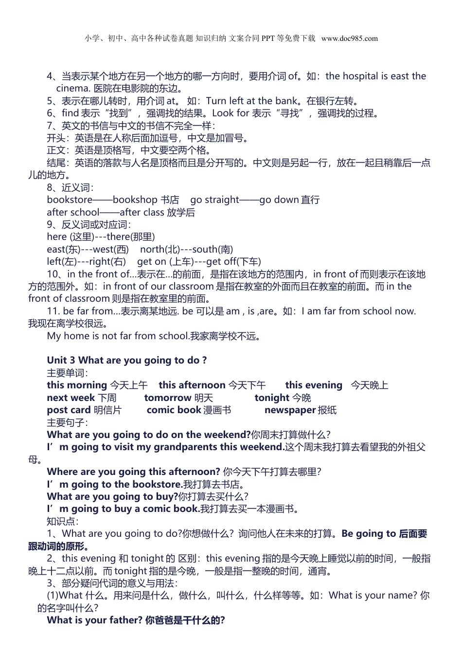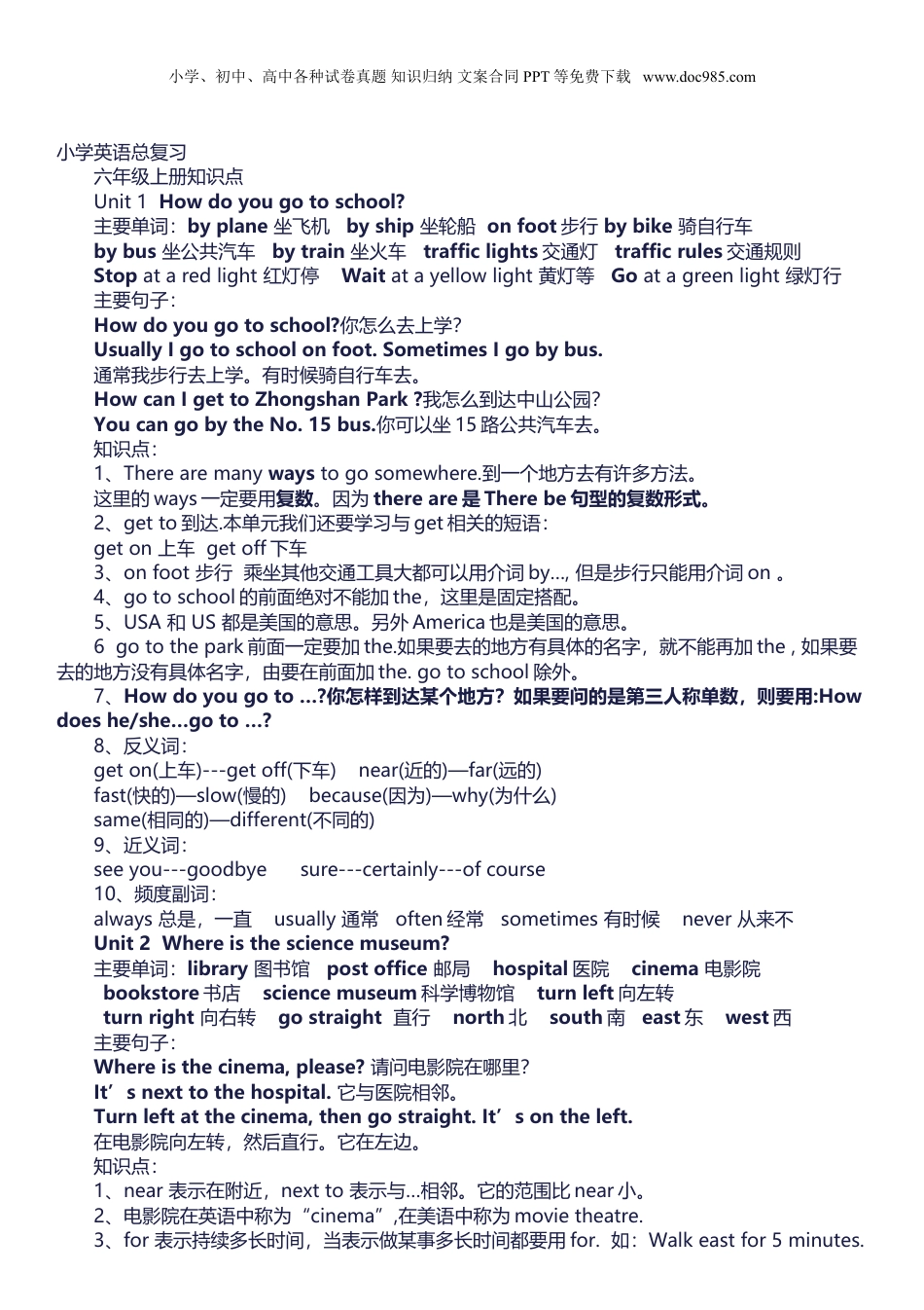 小学、初中、高中各种试卷真题知识归纳文案合同PPT等免费下载www.doc985.com小学英语总复习六年级上册知识点Unit1Howdoyougotoschool?主要单词:byplane坐飞机byship坐轮船onfoot步行bybike骑自行车bybus坐公共汽车bytrain坐火车trafficlights交通灯trafficrules交通规则Stopataredlight红灯停Waitatayellowlight黄灯等Goatagreenlight绿灯行主要句子:Howdoyougotoschool?你怎么去上学?UsuallyIgotoschoolonfoot.SometimesIgobybus.通常我步行去上学。有时候骑自行车去。HowcanIgettoZhongshanPark?我怎么到达中山公园?YoucangobytheNo.15bus.你可以坐15路公共汽车去。知识点:1、Therearemanywaystogosomewhere.到一个地方去有许多方法。这里的ways一定要用复数。因为thereare是Therebe句型的复数形式。2、getto到达.本单元我们还要学习与get相关的短语:geton上车getoff下车3、onfoot步行乘坐其他交通工具大都可以用介词by…,但是步行只能用介词on。4、gotoschool的前面绝对不能加the,这里是固定搭配。5、USA和US都是美国的意思。另外America也是美国的意思。6gotothepark前面一定要加the.如果要去的地方有具体的名字,就不能再加the,如果要去的地方没有具体名字,由要在前面加the.gotoschool除外。7、Howdoyougoto…?你怎样到达某个地方?如果要问的是第三人称单数,则要用:Howdoeshe/she…goto…?8、反义词:geton(上车)---getoff(下车)near(近的)—far(远的)fast(快的)—slow(慢的)because(因为)—why(为什么)same(相同的)—different(不同的)9、近义词:seeyou---goodbyesure---certainly---ofcourse10、频度副词:always总是,一直usually通常often经常sometimes有时候never从来不Unit2Whereisthesciencemuseum?主要单词:library图书馆postoffice邮局hospital医院cinema电影院bookstore书店sciencemuseum科学博物馆turnleft向左转turnright向右转gostraight直行north北south南east东west西主要句子:Whereisthecinema,please?请问电影院在哪里?It’snexttothehospital.它与医院相邻。Turnleftatthecinema,thengostraight.It’sontheleft.在电影院向左转,然后直行。它在左边。知识点:1、near表示在附近,nextto表示与…相邻。它的范围比near小。2、电影院在英语中称为“cinema”,在美语中称为movietheatre.3、for表示持续多长时间,当表示做某事多长时间都要用for.如:Walkeastfor5minutes.小学、初中、高中各种试卷真题知识归纳文案合同PPT等免费下载www.doc985.com4、当表示某个地方在另一个地方的哪一方向时,要用介词of。如:thehospitaliseastthecinema.医院在电影院的东边。5、表示在哪儿转时,用介词at。如:Turnleftatthebank。在银行左转。6、find表示“找到”,强调找的结果。Lookfor表示“寻找”,强调找的过程。7、英文的书信与中文的书信不完全一样:开头:英语是在人称后面加逗号,中文是加冒号。正文:英语是顶格写,中文要空两个格。结尾:英语的落款与人名是顶格而且是分开写的。中文则是另起一行,放在一起且稍靠后一点儿的地方。8、近义词:bookstore——bookshop书店gostraight——godown直行afterschool——afterclass放学后9、反义词或对应词:here(这里)---there(那里)east(东)---west(西)north(北)---south(南)left(左)---right(右)geton(上车)---getoff(下车)10、inthefrontof…表示在…的前面,是指在该地方的范围内,infrontof而则表示在该地方的范围外。如:infrontofourclassroom是指在教室的外面而且在教室的前面。而inthefrontofclassroom则是指在教室里的前面。11.befarfrom…表示离某地远.be可以是am,is,are。如:Iamfarfromschoolnow.我现在离学校很远。Myhomeisnotfarfromschool.我家离学校不远。Unit3Whatareyougoingtodo?主要单词:thismorning今天上午thisafternoon今天下午thisevening今天晚上nextweek下周tomorrow明天tonight今晚postcard明信片comicbook漫画书newspaper报纸主要句子:Whatareyougoingtodoontheweekend?你周末打算做什么?I’mgoingtovisitmygrandparentsthisweekend.这个周末我打算去看望我的外祖父母。Wh...