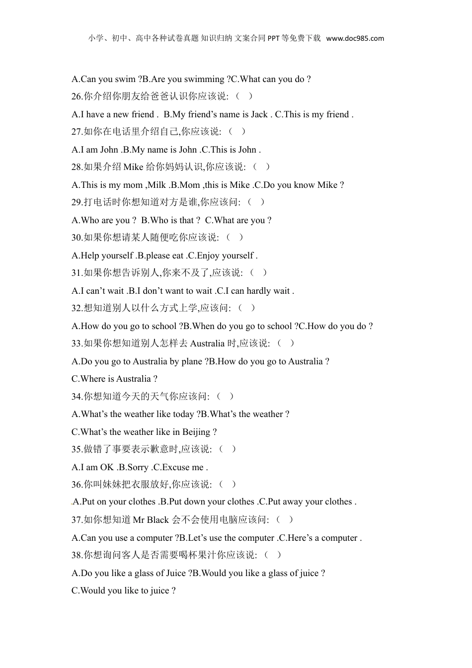 小学、初中、高中各种试卷真题知识归纳文案合同PPT等免费下载www.doc985.com情景交际1.你想知道别人星期日干什么,你应该问:()A.WhatareyougoingtodothisSunday?B.WhatdoyoudoonSundays?C.WhatdoyouhaveonSundays?2.你想知道别人上什么课你应该问:()A.Whatclassesdoyoulike?B.Whatclassareyouin?C.WhatdoyouhaveonSundays?3.你想知道该不该上课了,你应该问:()A.It’stimeforclass.B.Isittimetohaveclass?C.Whendoestheclassbegin?4.如果你想告诉别人,班上新来的男孩很滑稽,你应该说:()A.Theboyisfunny.B.Theboyishappy.C.Theboyisyoung.5.把东西给别人,你应该说:()A.Giveyou.B.Hereyouare.C.Getitdown.6.怎样询问别的长相或性格()A.Whatdoesshelike?B.What’shelike?C.Whatdoessheliketodo?7.别人说:“Let’splaycomputergames.”你回答:()A.Goodidea.B.No,thanks.C.Yes,please.8.询问时间应该说:()A.What’stimeisit?B.Whendoyouknow?C.Doyouhaveawatch?9.初次见面时怎样问好:()A.Hello.Howareyou?B.Nicetomeetyou.C.Nicetomeetyouagain.10.想知道今天几月几日,应该问:()A.Whatdayisittoday?B.whatisthedatetoday?C.Whattimeisitnow?11.当你的朋友建议和你一起去公园时,应该说:()A.Doyoulikethezoo?B.Iwouldliketo.C.Let’sgotothezoo.12.当你想知道别人的卧室怎么样时,你应该问:()A.What’syourbedroomlike?B.Whataboutyourbedroom?C.MayIseeyournewbedroom?小学、初中、高中各种试卷真题知识归纳文案合同PPT等免费下载www.doc985.com13.你想问别人午饭吃什么时,你应该问:()A.Whatdoyouhaveforlunch?B.Whatwouldyoulikeforlunch?C.Whatdoyouhavefordinner?14.你想知道谁的生日在三月,你会问:()A.Whenisyourbirthday?B.IsyourbirthdayinMarch?C.WhohasabirthdayinMarch?15.你想问什么时候去香港,你会问:()A.WhenisthebesttimetoHongkong?B.WhendoyougotoHongkong?C.WhenisthebesttimetoMacao?16.当你需要考虑下回答时,你会说:()A.Let’shavealook.B.Letmesee.C.Let’sgotoschool.17.如果你是超市工作人员,看到顾客进来,你应该说:()A.Welcome!Howareyou?B.CanIhelpyou?C.Seeyoulater.18.如何表达你想尝试做一件事情:()A.Ilikeitverymuch.B.Iwouldliketohaveatry.C.It’sgood.19.你想知道新来的老师是谁,你应该问:()A.What’syournewteacher?B.Who’syournewteacher?C.What’syounewteacher?20.你想知道别人最喜欢的季节,你应该问:()A.Whatdoyoulike?B.Whichseasondoyoulikebest?C.What’syourfavouritesport?21.你想知道Rabbit的房间有什么,你应该问:()A.What’stherabbitroomlike?B.Whatcanyouseeinrabbit’sroom?C.What’sintherabbit’sroom?22.别人不小心撞到你,你应该说:()A.Youareright.B.Itdoesn’tmatter.C.Iamangry.23.你想了解别人爸爸身体怎样你应该说:()A.Howisyourfather?B.What’syourfatherdoing?C.What’syourfather?24.过马路,你叫别人小心,你应该说:()A.Watchout.B.Lookatme.C.Don’tgo.25.你想知道别人是否会游泳,你应该说:()小学、初中、高中各种试卷真题知识归纳文案合同PPT等免费下载www.doc985.comA.Canyouswim?B.Areyouswimming?C.Whatcanyoudo?26.你介绍你朋友给爸爸认识你应该说:()A.Ihaveanewfriend.B.Myfriend’snameisJack.C.Thisismyfriend.27.如你在电话里介绍自己,你应该说:()A.IamJohn.B.MynameisJohn.C.ThisisJohn.28.如果介绍Mike给你妈妈认识,你应该说:()A.Thisismymom,Milk.B.Mom,thisisMike.C.DoyouknowMike?29.打电话时你想知道对方是谁,你应该问:()A.Whoareyou?B.Whoisthat?C.Whatareyou?30.如果你想请某人随便吃你应该说:()A.Helpyourself.B.pleaseeat.C.Enjoyyourself.31.如果你想告诉别人,你来不及了,应该说:()A.Ican’twait.B.Idon’twanttowait.C.Icanhardlywait.32.想知道别人以什么方式上学,应该问:()A.Howdoyougotoschool?B.Whendoyougotoschool?C.Howdoyoudo?33.如果你想知道别人怎样去Australia时,应该说:()A.DoyougotoAustraliabyplane?B.HowdoyougotoAust...