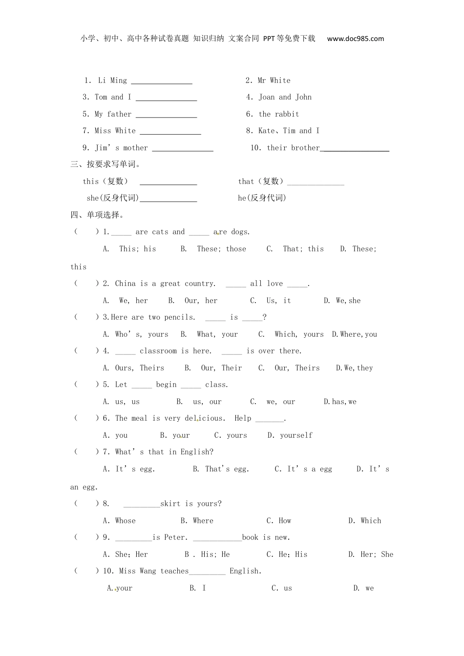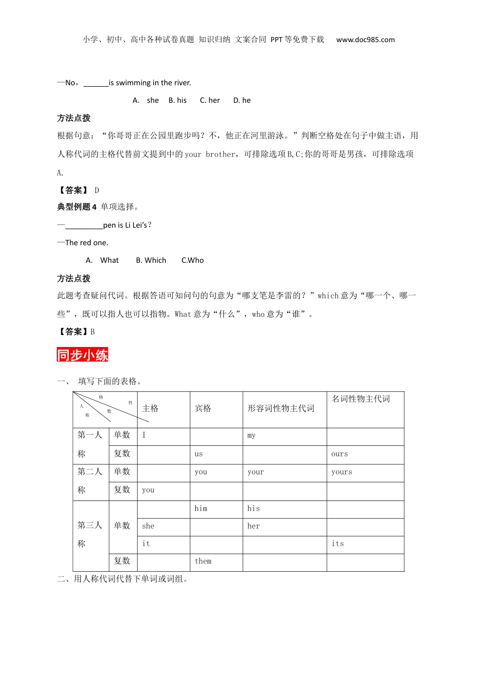 小学、初中、高中各种试卷真题知识归纳文案合同PPT等免费下载www.doc985.com小升初英语精讲精练专题二代词(二)经典例题详解典型例题1选择所给单词的适当形式填空。Myschoolisheavierthan_________(your、yours)方法点拨此题主要考查形容词性物主代词和名词性物主代词的区别。形容词性物主代词后面跟名词,名词性物主代词具有名词性质。从句意可以得知后面要填一个名词,your指的是“你;你们”是形容词性物主代词,而yours是你的……,是名词性物主代词。【答案】yours典型例题2选出每组中表达正确的句子,并在它后面的括号里写“T”1.A.Thereissomebreadinthefridge.()B.Thereisanybreadinthefridge.()2.A.AllofTom’sparentsareteachers.()B.BothofTom’sparentsareteachers.()方法点拨此题考查词义相近的不定代词的辨析。第1题中不相同的两个词是some和any,some通常用于肯定句中,any用于疑问句和否定句中,而这个句子是肯定句;第2题是辨析all和both的用法,all表示“三者或三者以上都”,both表示“两者都”,Tom的父母是两个人。【答案】1.A(T)2.B(T)典型例题3单项选择。()—Isyourbrotherrunninginthepark?小学、初中、高中各种试卷真题知识归纳文案合同PPT等免费下载www.doc985.com—No,______isswimmingintheriver.A.sheB.hisC.herD.he方法点拨根据句意:“你哥哥正在公园里跑步吗?不,他正在河里游泳。”判断空格处在句子中做主语,用人称代词的主格代替前文提到中的yourbrother,可排除选项B,C;你的哥哥是男孩,可排除选项A.【答案】D典型例题4单项选择。—_________penisLiLei’s?—Theredone.A.WhatB.WhichC.Who方法点拨此题考查疑问代词。根据答语可知问句的句意为“哪支笔是李雷的?”which意为“哪一个、哪一些”,既可以指人也可以指物。What意为“什么”,who意为“谁”。【答案】B同步小练一、填写下面的表格。主格宾格形容词性物主代词名词性物主代词[来源:学&科&网]第一人称单数Imy复数usours第二人称单数you[来源:学|科|网]youryours复数you第三人称单数himhissheheritits复数them二、用人称代词代替下单词或词组。格性数人称小学、初中、高中各种试卷真题知识归纳文案合同PPT等免费下载www.doc985.com1.LiMing2.MrWhite3.TomandI4.JoanandJohn5.Myfather6.therabbit7.MissWhite8.Kate、TimandI9.Jim’smother10.theirbrother________________三、按要求写单词。this(复数)that(复数)______________she(反身代词)he(反身代词)四、单项选择。()1._____arecatsand_____aredogs.[来源:学&科&网]A.This;hisB.These;thoseC.That;thisD.These;this()2.Chinaisagreatcountry._____alllove_____.A.We,herB.Our,herC.Us,itD.We,she()3.Herearetwopencils._____is_____?A.Who’s,yoursB.What,yourC.Which,yoursD.Where,you()4._____classroomishere._____isoverthere.A.Ours,TheirsB.Our,TheirC.Our,TheirsD.We,they()5.Let_____begin_____class.A.us,usB.us,ourC.we,ourD.has,we()6.Themealisverydelicious.Help_______.A.youB.yourC.yoursD.yourself()7.What’sthatinEnglish?A.It’segg.B.That'segg.C.It’saeggD.It’sanegg.()8._________skirtisyours?A.WhoseB.WhereC.HowD.Which()9._________isPeter.____________bookisnew.A.She;HerB.His;HeC.He;HisD.Her;She()10.MissWangteaches_________English.A.yourB.IC.usD.we小学、初中、高中各种试卷真题知识归纳文案合同PPT等免费下载www.doc985.com()11.Issheyouraunt?Yes,__________.A.she’sB.herisC.sheisD.heis()12.—Are__________coatsyours?—Yes,theyare.A.theyB.theseC.thisD.there()13.—Isthat___uncle?—No,heisn’t.A.heB.sheC.herD.hers()14._____coatisred.A.Myteacher’sB.myteachers’C.Ourteachers’D.myteacher’s()15.Thereisadog._________isrunningafteracat.A.HeB.ItC.ItsD.They()16.Ilikeplayingwith_________.A.theyB.hisC.themD.she()17.一Excuse___________.WhereisLucy??—__________is...