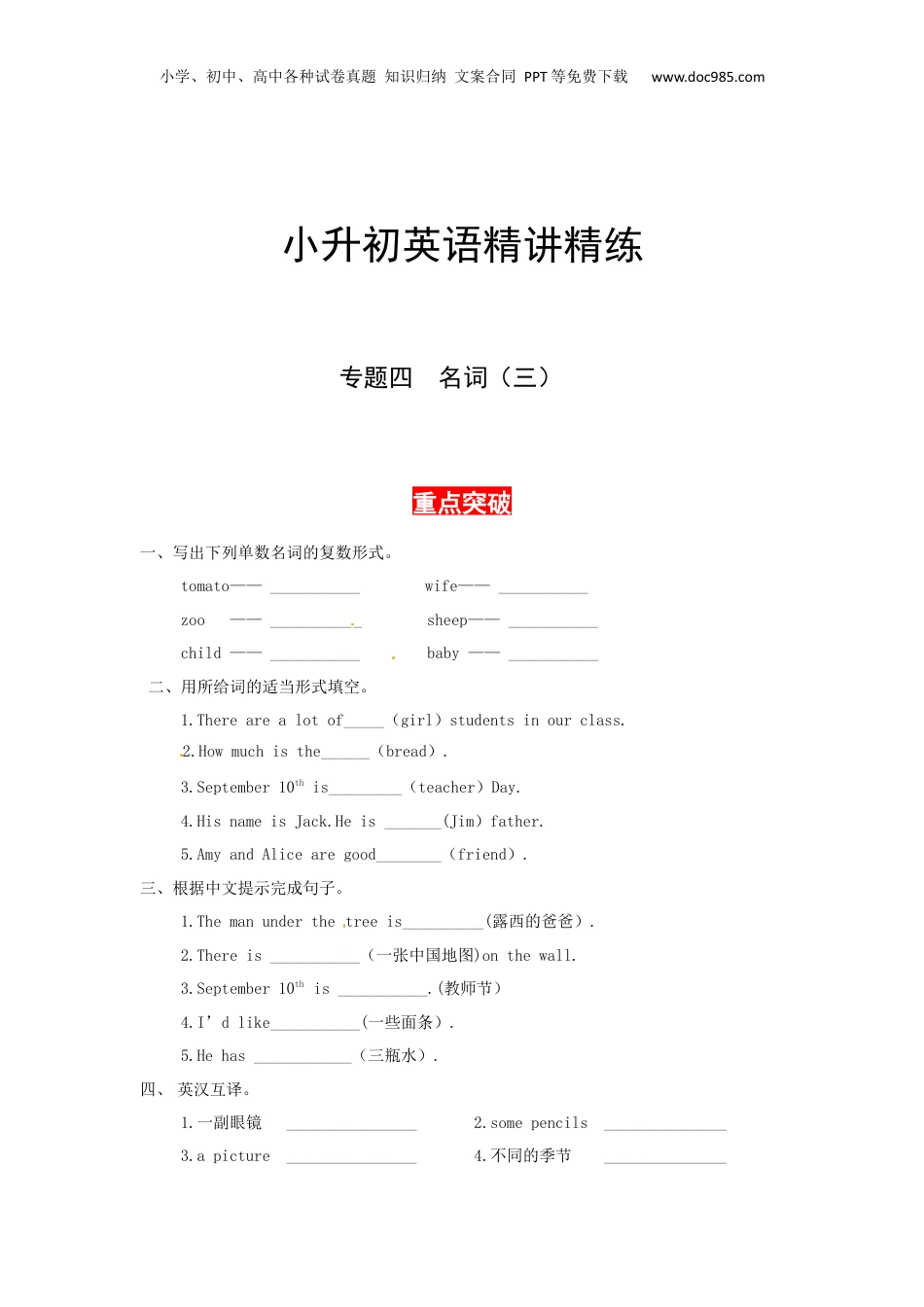 小学、初中、高中各种试卷真题知识归纳文案合同PPT等免费下载www.doc985.com小升初英语精讲精练专题四名词(三)[来源:Zxxk.Com]重点突破一、写出下列单数名词的复数形式。tomato——___________wife——___________zoo——___________sheep——___________child——___________baby——___________二、用所给词的适当形式填空。1.Therearealotof_____(girl)studentsinourclass.2.Howmuchisthe______(bread).3.September10this_________(teacher)Day.4.HisnameisJack.Heis_______(Jim)father.5.AmyandAlicearegood________(friend).三、根据中文提示完成句子。1.Themanunderthetreeis__________(露西的爸爸).2.Thereis___________(一张中国地图)onthewall.3.September10this___________.(教师节)4.I’dlike___________(一些面条).5.Hehas____________(三瓶水).四、英汉互译。1.一副眼镜________________2.somepencils_______________3.apicture________________4.不同的季节_______________小学、初中、高中各种试卷真题知识归纳文案合同PPT等免费下载www.doc985.com5.六个土豆________________6.五分钟路程_______________[来源:学科网ZXXK]真题在线一、写出下列名词的复数形式。boat——_____________boy——_____________tooth——_____________noodle——____________woman——_____________child——_____________二、给英文单词找出对应的中文。()1.librarya.花()2.cinemab.图书馆()3.parkc.月亮()4.clockd.电影院()5.dresse.卧室()6.snowmanf.钟表()7.Fridayg.星期五()8.bedroomh.连衣裙()9.mooni.雪人()10.flowerj.公园三、看图片写出相应的单词。h__seicecr____ms_mm_____c__n__m__Ch____dren’sDayp__stc_____dd__mpl__ngb__sk__tb__ll四、单项选择题。[来源:学。科。网]小学、初中、高中各种试卷真题知识归纳文案合同PPT等免费下载www.doc985.com()1.Theycomefromdifferent______.A.countryB.countriesC.acountryD.countrys()2.Howmany______doyouseeinthepicture?A.tomatosB.tomatoesC.tomatoD.thetomato()3.Theyare______.A.womanteachersB.womenteachersC.womenteacherD.womanteacher()4.Wouldyoulike_______,please?A.twoglassofwaterB.twoglassesofwaterC.twoglassofwatersD.twoglassesofwaters()5.Mostof______livein_______.A.Germans;GermanB.German;GermenC.Germen;GermanyD.Germans;Germany()6.Therearesome___inthese__.A.knifespencil-boxesB.knivespencils-boxC.knivespencil-boxD.knivespencils-boxes()7.______like______byair.A.Greens;travellingB.TheGreen;travelingC.TheGreens;travelD.TheGreens;traveling()8.Iwonderwhy______areinterestedinactionfilms(武打片).A.thepeopleB.peopleC.peoplesD.thepeoples()9.Thereisno______intheplate.A.applesB.orangesC.riceD.eggs()10.Myunclehasthree_______.A.childB.childsC.childrenD.childrens[来源:Z+xx+k.Com]小学、初中、高中各种试卷真题知识归纳文案合同PPT等免费下载www.doc985.com参考答案重点突破一、tomatoes;wives;zoos;sheep;children;babies二、girls;bread;Teachers’;Jim’s;friends三、Lucy’sfather;amapofChina;Teachers’Day;somenoodles;threebottlesofwater[来源:学科网]四、apairofglass;一些铅笔;一幅画;differentseasons;sixpotatoes;fiveminuteminuteswalk真题在线一、boats;boys;teeth;noodles;woman;children;二、bdjfhigeca三、ou;ea;uer;Iea;ild;oar;ui;aea四、BBABCCBADC