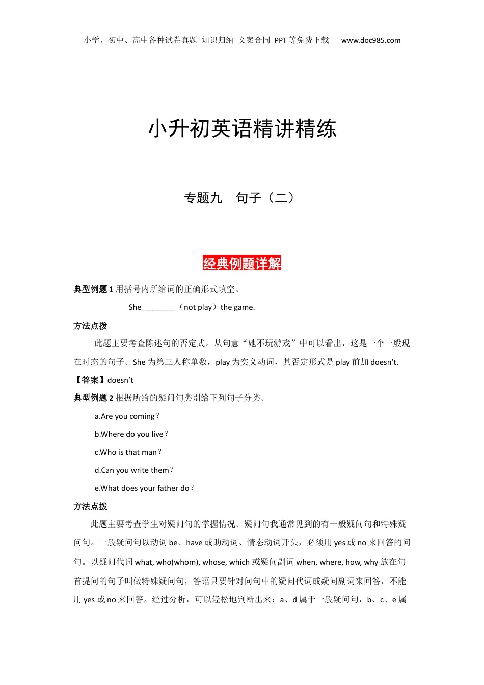 小学、初中、高中各种试卷真题知识归纳文案合同PPT等免费下载www.doc985.com小升初英语精讲精练专题九句子(二)经典例题详解典型例题1用括号内所给词的正确形式填空。She________(notplay)thegame.方法点拨此题主要考查陈述句的否定式。从句意“她不玩游戏”中可以看出,这是一个一般现在时态的句子。She为第三人称单数,play为实义动词,其否定形式是play前加doesn’t.【答案】doesn’t典型例题2根据所给的疑问句类别给下列句子分类。a.Areyoucoming?b.Wheredoyoulive?c.Whoisthatman?d.Canyouwritethem?e.Whatdoesyourfatherdo?方法点拨此题主要考查学生对疑问句的掌握情况。疑问句我通常见到的有一般疑问句和特殊疑问句。一般疑问句以动词be、have或助动词、情态动词开头,必须用yes或no来回答的问句。以疑问代词what,who(whom),whose,which或疑问副词when,where,how,why放在句首提问的句子叫做特殊疑问句,答语只要针对问句中的疑问代词或疑问副词来回答,不能用yes或no来回答。经过分析,可以轻松地判断出来:a、d属于一般疑问句,b、c、e属小学、初中、高中各种试卷真题知识归纳文案合同PPT等免费下载www.doc985.com于特殊疑问句。【答案】一般疑问句:a、d特殊疑问句:b、c、e典型例题3单项选择_____walkonthegrass.A.Don’tB.NotC.NoD.Aren’t方法点拨此题考查的是祈使句的否定形式。否定祈使句一般在句首加Don’t.【答案】A典型例题4选词填空thereistherearearethereistheretherewastherewere1.______notanypandasintheforest.2.______somethinginterestinginthebook?3.______anorangeonthetree.[来源:Z&xx&k.Com]4.______ameetingyesterday.方法点拨此题主要考Therebe结构中be动词的单复数和时态,又考查Therebe结构的肯定式、否定式和疑问式这三种形式。第1题从句意“森林里没有一些熊猫”和标点符号“.”可以判断这是肯定句,pandas可判断是复数;第2题从标点可以判断这是一般疑问句,又从somethinginteresting可判断要用单数;第3题标点可判断这是肯定句,anorange可判断是单顺;第4题从标点判断是肯定句,a可判断是单数,时间状语可判断是过去式。【答案】1.Thereare2.Isthere3.Thereis4.Therewas典型例题5选出句中错误并改正。()Therearen’tsomepicturesonthewall.___________ABC方法点拨此题主要考Therebe句型。从pictures可以看出这是复数,因此选项A没问题;在therebe结构中,肯定句中用some,否定句和一般疑问句用any,因此B选项是错的;on小学、初中、高中各种试卷真题知识归纳文案合同PPT等免费下载www.doc985.comthewall在墙上为固定短语。【答案】Bsome改为any同步小练一、写出下列单词的缩写形式。doesnot=___________didnot=___________willnot=___________werenot=___________wasnot=___________cannot=___________二、读句子,找出与句子相符的图片,将序号填在句子前面的括号里。()1.Igotobedat9:30.()2.Ihaveanewtoyar.()3.Myhobbyiscollectingmaps.()4.Thisismypencil.()5.Hehasanapple..()6.It’s9:00.()7.It’ssunnytoday.()8.Hedoeshishomeworkeveryday.()9.Theballisonthedesk.()10.Nancyisplayingping-pong.A.B.C.D.E.F.G.H.I.J.三、看图片,读句子,回答问题。小学、初中、高中各种试卷真题知识归纳文案合同PPT等免费下载www.doc985.com1.——Issheateacher?——______________2.——Whereistheball?——______________.3.——Howmanyapplesarethereinthebasketball?——______________________4.——What’stheweatherliketoday?——______________________[来源:Zxxk.Com]5.——Whattimeisit?——_______________________四、给句子选择正确的答语。()1.What’syourname?a.Heismybrother.()2.Issheplayingtheviolin?b.BecauseIwanttobuya小学、初中、高中各种试卷真题知识归纳文案合同PPT等免费下载www.doc985.compen.()3.Whenisyourbirthday?c.Itis14yuan.()4.Whatishelike?d.Ididmyhomeworkathome.()5.Howareyou?e.MynameisTom.()6.Doessheteachmaths?f.No,sheisn’t.()7.What...