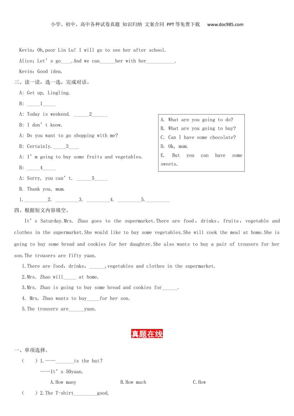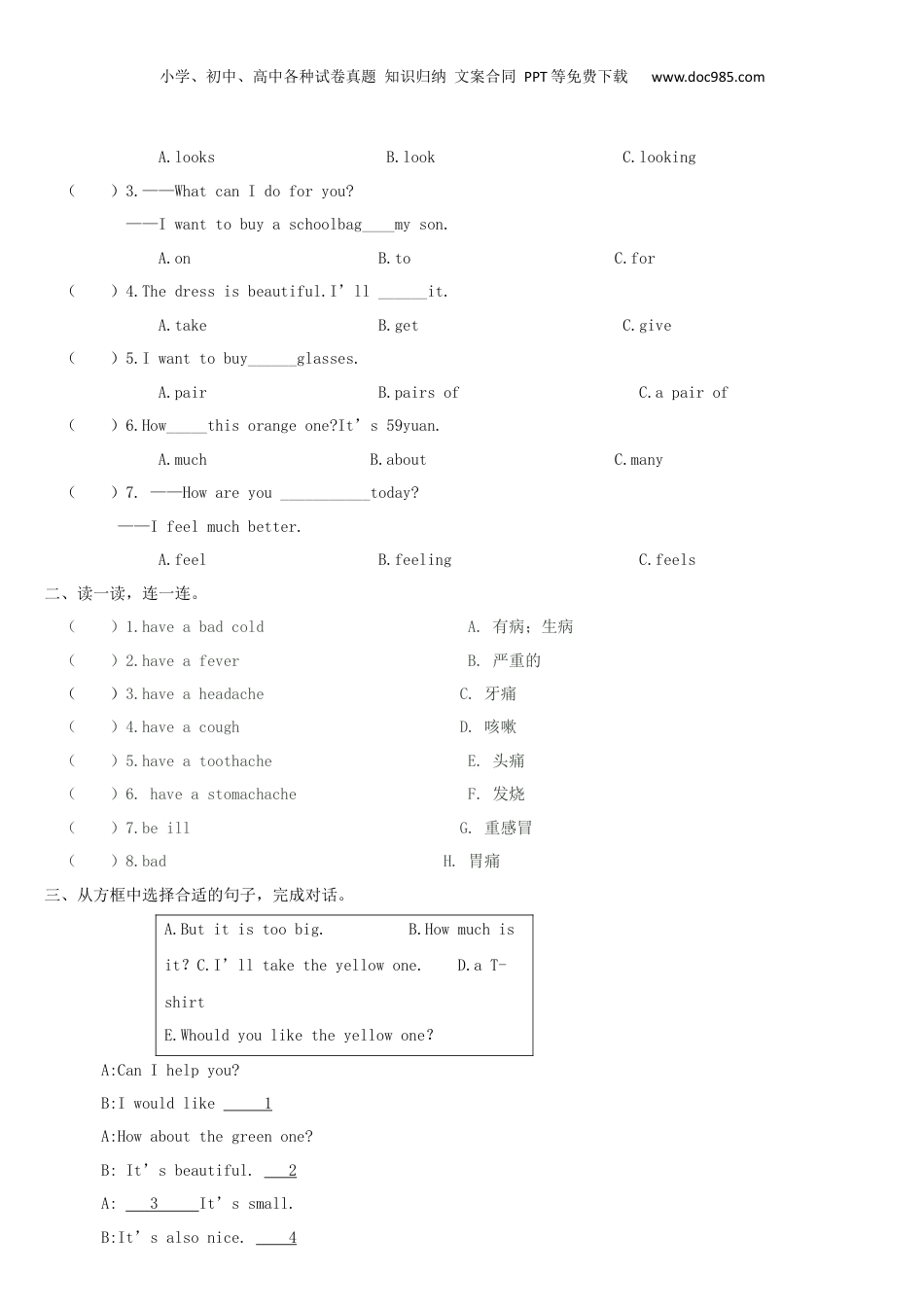 小学、初中、高中各种试卷真题知识归纳文案合同PPT等免费下载www.doc985.com小升初英语精讲精练专题十三购物与看病(三)重点突破一、找出错误并改正。1.Iwanttobuyahattomysister._________改为______________A.B.C.2.Howmanyisthegreenshirt?_________改为______________A.BC3.Iwouldliketwopairofsocks._________改为______________ABC4.Howaboutthisredones?_________改为______________A.BC5.Ifeelmuchgood._________改为______________ABC二、选词,补全对话。A.feverB.togetherC.helpD.wrongE.lessonsKevin:WhereisLinLu?Alice:Sheasksforasickleave.Soshestaysathometoday.Kevin:What’s_____withher?Alice:Shehasahigh______.小学、初中、高中各种试卷真题知识归纳文案合同PPT等免费下载www.doc985.comKevin:Oh,poorLinLu!Iwillgotoseeherafterschool.Alice:Let’sgo____.Andwecan______herwithher___________.Kevin:Goodidea.三、读一读,选一选,完成对话。A:Getup,Lingling.B:_____1_____A:Todayisweekend.______2______B:Idon’tknow.A:Doyouwanttogoshoppingwithme?B:Certainly._____3____A:I’mgoingtobuysomefruitsandvegetables.B:_____4_____A:Sorry,youcan’t.______5_____B.Thankyou,mum.1._________2._________3._________4._________5._________四、根据短文内容填空。It’sSaturday.Mrs.Zhaogoestothesupermarket.Therearefood,drinks,fruits,vegetableandclothesinthesupermarket.Shewouldliketobuysomevegetables.Shewillcookthemealathome.Sheisgoingtobuysomebreadandcookiesforherdaughter.Shealsowantstobuyapairoftrousersforherson.Thetrousersarefiftyyuan.1.Therearefood,drinks,______,vegetablesandclothesinthesupermarket.2.Mrs.Zhaowill_____athome.3.Mrs.Zhaoisgoingtobuysomebreadandcookiesfor______.4.Mrs.Zhaowantstobuy_____forherson.5.Thetrousersare______yuan.真题在线一、单项选择。()1.——_______isthehat?——It’s50yuan.A.HowmanyB.HowmuchC.How()2.TheT-shirt_________good.A.Whatareyougoingtodo?B.Whatareyougoingtobuy?C.CanIhavesomechocolate?D.Ok,mum.E.Butyoucanhavesomesweets.小学、初中、高中各种试卷真题知识归纳文案合同PPT等免费下载www.doc985.comA.looksB.lookC.looking()3.——WhatcanIdoforyou?——Iwanttobuyaschoolbag____myson.A.onB.toC.for()4.Thedressisbeautiful.I’ll______it.A.takeB.getC.give()5.Iwanttobuy______glasses.A.pairB.pairsofC.apairof()6.How_____thisorangeone?It’s59yuan.A.muchB.aboutC.many()7.——Howareyou___________today?——Ifeelmuchbetter.A.feelB.feelingC.feels二、读一读,连一连。()1.haveabadcoldA.有病;生病()2.haveafeverB.严重的()3.haveaheadacheC.牙痛()4.haveacoughD.咳嗽()5.haveatoothacheE.头痛()6.haveastomachacheF.发烧()7.beillG.重感冒()8.badH.胃痛三、从方框中选择合适的句子,完成对话。A.Butitistoobig.B.Howmuchisit?C.I’lltaketheyellowone.D.aT-shirtE.Whouldyouliketheyellowone?A:CanIhelpyou?B:Iwouldlike1A:Howaboutthegreenone?B:It’sbeautiful.2A:3It’ssmall.B:It’salsonice.4小学、初中、高中各种试卷真题知识归纳文案合同PPT等免费下载www.doc985.comA:It’s41yuan.B:That’sOK.5小学、初中、高中各种试卷真题知识归纳文案合同PPT等免费下载www.doc985.com参考答案重点突破一、1.Cfor2.Amuch3.Bpairs4.Cone5.Cbetter二、DABCE三、DABCE四、fruits;cookthemeal;herdaughter;apairoftrousers;fifty真题在线一、BACACAB二、GFEDCHAB三、DAEBC