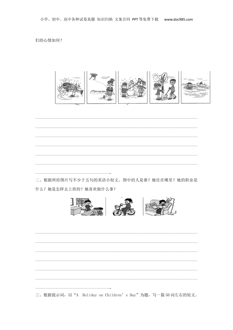 小学、初中、高中各种试卷真题知识归纳文案合同PPT等免费下载www.doc985.com小升初英语精讲精练专题十六看图作文、根据提示词写作文(三)重点突破一、仔细观察图画,现在是星期天。看,他们正在做什么?他们的心情如何?你能写一段不少于5句话的短文描述一下吗?MyfriendsMyfatherMymotherMysisterMybrother_____________________________________________________________________________________________________________________________________________________________________________________________________________________________________________________________________________________________________________________________________________________________________________________________________________________________________________________________________________________________________________________________二、根据所给图片写不少于五句的英语小短文。请以书信的方式跟你远方的朋友说说你出外郊游时的见闻。请说明你跟谁一起去。他们都做了些什么事。大家的心情如何?小学、初中、高中各种试卷真题知识归纳文案合同PPT等免费下载www.doc985.com______________________________________________________________________________________________________________________________________________________________________________________________________________________________________________________________________________________________________________________________________________________________________________________________________________________________________________________________________________________________________________________________三、根据给出的材料,写一写Mike这个周末的活动计划,50词左右。SaturdaySundayreadamagazinegotothezoobuyabooklearnKungfuwatchTV______________________________________________________________________________________________________________________________________________________________________________________________________________________________________________________________________________________________________________________________________________________________________________________________________________________________________________________________________________________________________________________________真题在线一、根据所给图片写不少于五句的英语小短文。请描述他们一年四季都喜欢做哪些事?他小学、初中、高中各种试卷真题知识归纳文案合同PPT等免费下载www.doc985.com们的心情如何?______________________________________________________________________________________________________________________________________________________________________________________________________________________________________________________________________________________________________________________________________________________________________________________________________________________________________________________________________________________________________________________________二、根据所给图片写不少于五句的英语小短文。图中的人是谁?她住在哪里?她的职业是什么?她是怎样去上班的?她喜欢做什么事?_____________________________________________________________________________________________________________________________________________________________________________________________________________________________________________________________________________________________________________________________________________________________________________________...