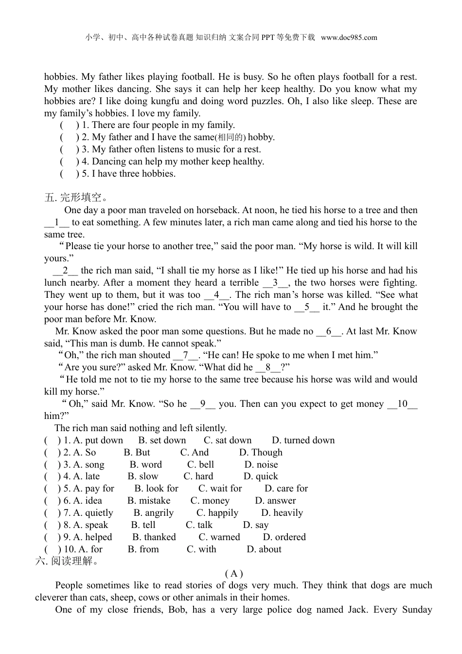 小学、初中、高中各种试卷真题知识归纳文案合同PPT等免费下载www.doc985.com英语—第十课时一.找出每组单词中与其他三个发音不同的一个,将其编号填入括号里。1.()A.visitorB.sisterC.answerD.different2.()A.fatherB.heroC.rulerD.teacher3.()A.firstB.turtleC.birthdayD.tired4.()A.cornerB.wormC.forD.short5.()A.morningB.mirrorC.sportD.horn6.()A.flyB.easyC.angryD.busy7.()A.tryB.typeC.libraryD.cycle8.()A.candyB.yearC.familyD.party二.照例子写单词。例:talk-talking-talks1.sing_________________2.dance__________________3.play_________________4.have__________________5.go__________________6.cook__________________7.do__________________8.live___________________9.read__________________10.study___________________三.单项选择。()1.What______yourhobbies?Ilikesinginganddoingkungfu.A.isB.areC.doD.does()2.Comeand________mynewpenpal.A.lookB.seeC.watchD.know()3.Doyouwantto_________?A.cookB.cookingC.cooksD.cooked()4.Iwriteane-mail______Mikeeveryweek..A.toB.fromC.forD.with()5.Hishobbiesare________.A.toreadstoriesB.readstoriesC.readsstoriesD.readingstories()6.Doeshe_________ontheSouthIsland?A.livesB.liveC.livingD.tolive()7.Helives_________afarm.A.inB.atC.onD.for()8.Ihaveafriend.She______afriend,too.A.haveB.hasC.hadD.having()9.CanIalso______hispenpal?A.areB.isC.amD.be()10.She______English.A.studyB.studiesC.studyingD.tostudy四.阅读短文判断正(T)误(F)。Therearethreepeopleinmyfamily:myfather,mymotherandI.Wehavedifferent小学、初中、高中各种试卷真题知识归纳文案合同PPT等免费下载www.doc985.comhobbies.Myfatherlikesplayingfootball.Heisbusy.Soheoftenplaysfootballforarest.Mymotherlikesdancing.Shesaysitcanhelpherkeephealthy.Doyouknowwhatmyhobbiesare?Ilikedoingkungfuanddoingwordpuzzles.Oh,Ialsolikesleep.Thesearemyfamily’shobbies.Ilovemyfamily.()1.Therearefourpeopleinmyfamily.()2.MyfatherandIhavethesame(相同的)hobby.()3.Myfatheroftenlistenstomusicforarest.()4.Dancingcanhelpmymotherkeephealthy.()5.Ihavethreehobbies.五.完形填空。Onedayapoormantraveledonhorseback.Atnoon,hetiedhishorsetoatreeandthen__1__toeatsomething.Afewminuteslater,arichmancamealongandtiedhishorsetothesametree.“Pleasetieyourhorsetoanothertree,”saidthepoorman.“Myhorseiswild.Itwillkillyours.”__2__therichmansaid,“IshalltiemyhorseasIlike!”Hetieduphishorseandhadhislunchnearby.Afteramomenttheyheardaterrible__3__,thetwohorseswerefighting.Theywentuptothem,butitwastoo__4__.Therichman’shorsewaskilled.“Seewhatyourhorsehasdone!”criedtherichman.“Youwillhaveto__5__it.”AndhebroughtthepoormanbeforeMr.Know.Mr.Knowaskedthepoormansomequestions.Buthemadeno__6__.AtlastMr.Knowsaid,“Thismanisdumb.Hecannotspeak.”“Oh,”therichmanshouted__7__.“Hecan!HespoketomewhenImethim.”“Areyousure?”askedMr.Know.“Whatdidhe__8__?”“Hetoldmenottotiemyhorsetothesametreebecausehishorsewaswildandwouldkillmyhorse.”“Oh,”saidMr.Know.“Sohe__9__you.Thencanyouexpecttogetmoney__10__him?”Therichmansaidnothingandleftsilently.()1.A.putdownB.setdownC.satdownD.turneddown()2.A.SoB.ButC.AndD.Though()3.A.songB.wordC.bellD.noise()4.A.lateB.slowC.hardD.quick()5.A.payforB.lookforC.waitforD.carefor()6.A.ideaB.mistakeC.moneyD.answer()7.A.quietlyB.angrilyC.happilyD.heavily()8.A.speakB.tellC.talkD.say()9.A.helpedB.thankedC.warnedD.ordered()10.A.forB.fromC.withD.about六.阅读理解。(A)Peoplesometimesliketoreadstoriesofdogsverymuch.Theythinkthatdogsaremuchclevererthancats,sheep,cowsoroth...