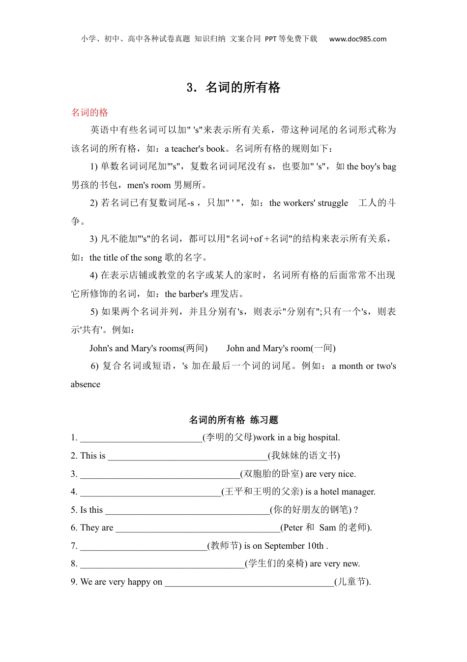 小学、初中、高中各种试卷真题知识归纳文案合同PPT等免费下载www.doc985.com3.名词的所有格名词的格英语中有些名词可以加"'s"来表示所有关系,带这种词尾的名词形式称为该名词的所有格,如:ateacher'sbook。名词所有格的规则如下:1)单数名词词尾加"'s",复数名词词尾没有s,也要加"'s",如theboy'sbag男孩的书包,men'sroom男厕所。2)若名词已有复数词尾-s,只加"'",如:theworkers'struggle工人的斗争。3)凡不能加"'s"的名词,都可以用"名词+of+名词"的结构来表示所有关系,如:thetitleofthesong歌的名字。4)在表示店铺或教堂的名字或某人的家时,名词所有格的后面常常不出现它所修饰的名词,如:thebarber's理发店。5)如果两个名词并列,并且分别有's,则表示"分别有";只有一个's,则表示'共有'。例如:John'sandMary'srooms(两间)JohnandMary'sroom(一间)6)复合名词或短语,'s加在最后一个词的词尾。例如:amonthortwo'sabsence名词的所有格练习题1.__________________________(李明的父母)workinabighospital.2.Thisis__________________________________(我妹妹的语文书)3.__________________________________(双胞胎的卧室)areverynice.4.______________________________(王平和王明的父亲)isahotelmanager.5.Isthis___________________________________(你的好朋友的钢笔)?6.Theyare___________________________________(Peter和Sam的老师).7.___________________________(教师节)isonSeptember10th.8.___________________________________(学生们的桌椅)areverynew.9.Weareveryhappyon____________________________________(儿童节).小学、初中、高中各种试卷真题知识归纳文案合同PPT等免费下载www.doc985.com10.Heisin_________________________________(老师的办公室)now.11.Pleaseopen______________________________________(教室的门).12.____________________________(赵敏的鞋)arewhite.13._________________________________(林红和张蔚的学校)isbigandnew.14.________________________________(John和Sally的母亲)areAmerican.15._____________________________(刘伟的妻子的朋友)isfromGuangzhou.15.______________________________(Tony哥哥的电脑)isbroken.16.It’s_____________________________(妇女节)onMarch8th.17.Arethese________________________________________(男生们的书包)?18.Thatis_______________________________________(Tom和李雷的教室).19.______________________________________(我父亲的和她父亲的朋友)arefromBeijing.20._________________________________(我父亲的和她父亲的朋友)arefromBeijing.用所给词的适当形式填空:1.March8this__________Day.(woman).2.twenty__________(分钟)exerciseeverydayisgoodforyourhealth.3.shopsells____________(妇女)handbags.4.inwesterncountrieshavea__________(三个月的)holidayinayear.5.I’llgivemyEnglishteacheracardfor____________Day.(teacher)6.It’sonlyten__________walkfromthestationtothehotel.(minute)7.It’san__________(hour)ridefromheretothemuseum.选择填空:1.----How’sJoy’sskirt?----Herskirtismorebeautifulthan________.A.sister’sandKateB.sisterandKateC.sisterandKate’sD.sister’sandKate’s小学、初中、高中各种试卷真题知识归纳文案合同PPT等免费下载www.doc985.com2.Thisis_______room.Thetwinsisterslikeitverymuch.A.Lucy’sandLily’sB.Lucy’sandLilyC.LucyandLily’s3.In______time,thosemountainswillbecoveredwithtrees,too.A.fewyearsB.afewyears’C.afewyearD.afewyear’s4.Wewillhavea___________holidayaftertheexam.A.twomonthB.two–monthC.twomonth’sD.two–month’s5.Didyouhearthe___________report?A.policemenB.policemen’sC.policemens’D.two-months6.It’sabout__________walkfrommyhome.A.tenminuteB.tenminutes’C.tenminute’sD.policemens7.Thisismydress.Thatoneis______________.A.MaryB.Mary’sC.sisterD....