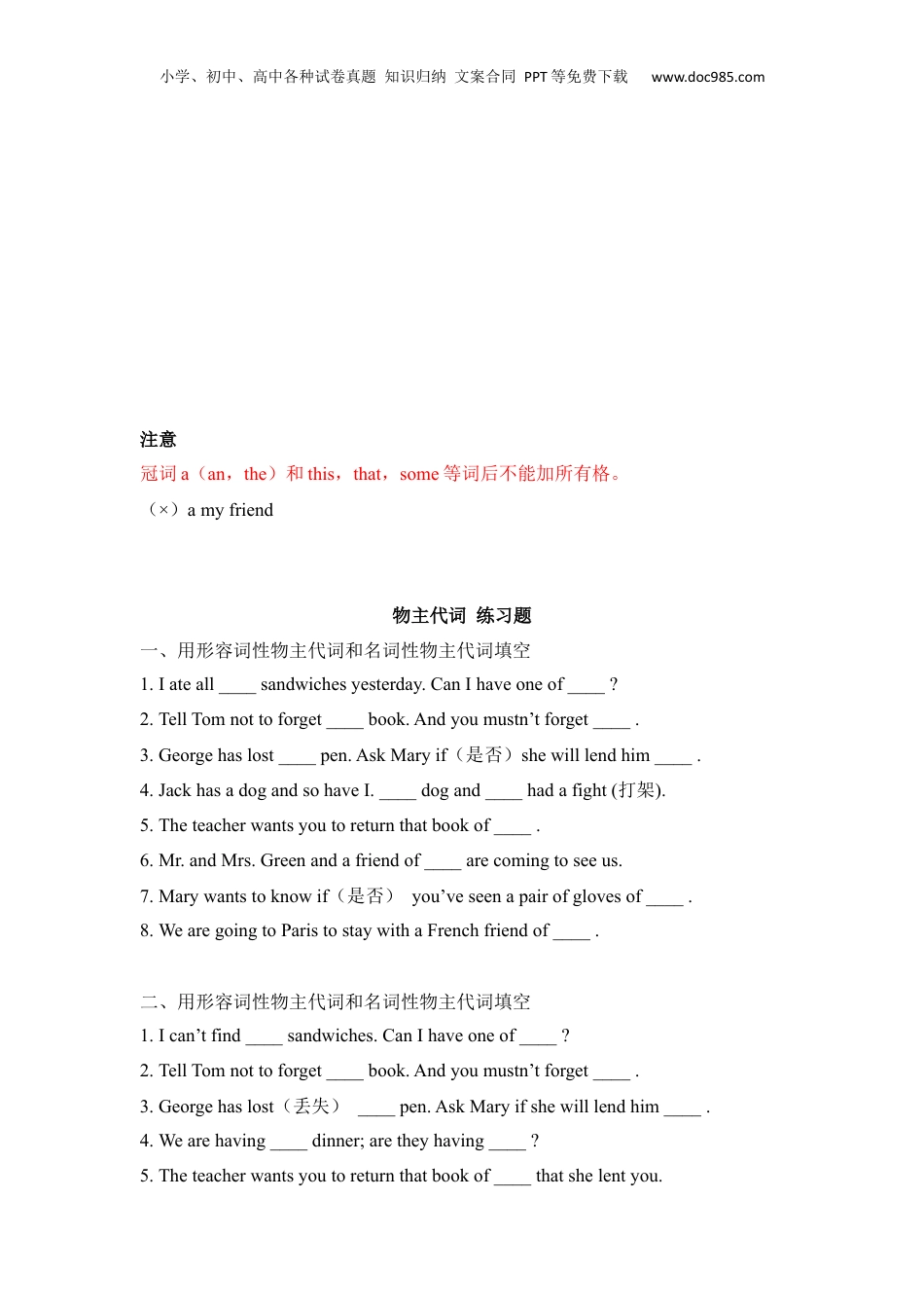小学、初中、高中各种试卷真题知识归纳文案合同PPT等免费下载www.doc985.com2.物主代词表示所有关系的代词叫做物主代词,也可叫做代词所有格。物主代词分形容词性物主代词和名词性物主代词二种,其人称和数的变化见下表。种类人称数单数复数第一人称第二人称第三人称第一人称第二人称第三人称形容词性物主代词myyourhis,her,itsouryourtheir名词性物主代词mimeyourshis,hers,itsoursyourstheirs形容词性物主代词(my/your/his/her/its/our/their)+名词,而名词性物主代词(mine/yours/his/hers/its/ours/theirs则相单于形容词性物主代词+名词,故其后不必加名词。如:Isthisyourbook?No,,itisn’t,it’shers(herbook)Jim’s,Tom’s,Maria’s1.物主代词的用法Thisismyfather.这是我父亲。Isthatbikeyours?Yes,it'smine.那辆自行车是你的吗?是的,那是我的。1.形容词性物主代词是形容词作用在句中只能作定语,换句话说,形容词性物主代词后面一定要跟上一个名词。Ilikehiscar.我喜欢他的小汽车。2.名词性物主代词可作主语Ourschoolishere,andtheirsisthere.我们的学校在这儿,他们的在那儿。3.名词性物主代词可作表语小学、初中、高中各种试卷真题知识归纳文案合同PPT等免费下载www.doc985.comWhosebikeisthis?It'shers.(=herbike)这是谁的自行车?是她的。Isthatcaryours?Yes,it'smine.那辆车是你的吗?是的,它是我的。4.名词性物主代词可作宾语Let'scleantheirroomfirstandours(=ourroom)later.咱们先打扫他们的房间,然后再打扫我们的。Ihavelostmydictionary.Pleaselendmeyours.我的字典丢了,请把你的借我好吗?afriendofmine的用法句型:a(an,this,that,some,no)等+名词+of+名词性所有格。按此句型“我的朋友之一”应译为afriend(名词)ofmine(名词性所有格)。Afriendofoursiscomingsoon.我们的一个朋友马上就来。Thatwatchofhersisbeautiful.她的表很漂亮。(暗示她有许多表)Thisisnofaultofyours.这不是你的错。比较名词性所有格(物主代词)与形容词性所有格(物主代词)的区别:Thisismybook.这是我的书本。形容词性代词名词(my后面必须加名词)Thisbookismine.这本书是我的。名词名词性代词(mine后面决不可加名词)小学、初中、高中各种试卷真题知识归纳文案合同PPT等免费下载www.doc985.com注意冠词a(an,the)和this,that,some等词后不能加所有格。(×)amyfriend物主代词练习题一、用形容词性物主代词和名词性物主代词填空1.Iateall____sandwichesyesterday.CanIhaveoneof____?2.TellTomnottoforget____book.Andyoumustn’tforget____.3.Georgehaslost____pen.AskMaryif(是否)shewilllendhim____.4.JackhasadogandsohaveI.____dogand____hadafight(打架).5.Theteacherwantsyoutoreturnthatbookof____.6.Mr.andMrs.Greenandafriendof____arecomingtoseeus.7.Marywantstoknowif(是否)you’veseenapairofglovesof____.8.WearegoingtoParistostaywithaFrenchfriendof____.二、用形容词性物主代词和名词性物主代词填空1.Ican’tfind____sandwiches.CanIhaveoneof____?2.TellTomnottoforget____book.Andyoumustn’tforget____.3.Georgehaslost(丢失)____pen.AskMaryifshewilllendhim____.4.Wearehaving____dinner;aretheyhaving____?5.Theteacherwantsyoutoreturnthatbookof____thatshelentyou.小学、初中、高中各种试卷真题知识归纳文案合同PPT等免费下载www.doc985.com6.Mr.andMrs.Greenandafriendof____arecomingtoseeus.7.WearegoingtoParistostaywithaFrenchfriendof____三、用适当的人称代词和物主代词填空A.从括号内选择正确的代词填空1.Yourclothesareonthedesk.Pleaseput_________(they,them,their,theirs)away.2.(We,Us,Our,Ours)_________EnglishteacherisMrs.Green.Wealllike_________(she,her,hers).3.(I,Me,My,Mine)_________can'tgetmykite.Couldyouhelp_________(I,me,my,mine)?4.Tomcan'tgetdownfromthetree.Canyouhelp_________(he,him,his)?5.Herkiteisbroken.Can_________(you,your,yours)mendit...