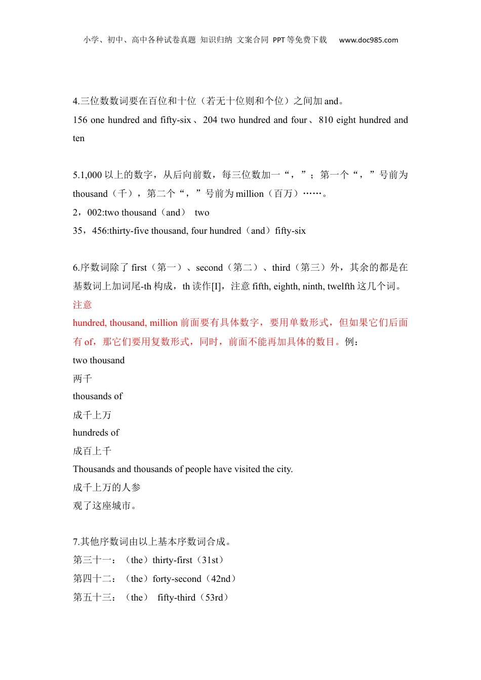 小学、初中、高中各种试卷真题知识归纳文案合同PPT等免费下载www.doc985.com2.数词表示数目多少或顺序的词叫数词。数词分为基数词和序数词。表示数目多少的数词叫基数词,one,two……表示顺序次第的数词叫序数词,thefirst(第一)、thesecond(第二)……1)数词的词形基数序数1onefirst2twosecond3threethird4fourfourth5.fivefifth6sixsixth7sevenseventh8eighteighth9nineninth10tententh11eleveneleventh12twelvetwelfth13thirteenthirteenth20twentytwentieth1.13~19的基数词,在个位数上加后缀-teen构成,并有两个重音。thirteen、fifteen、eighteen2.20~90各整十位数都以ty结尾。twenty、thirty、fifty3.20~100之间各数词要在十位和个位之间加连字符号“-”。21twenty-one、44forty-four、98ninety-eight小学、初中、高中各种试卷真题知识归纳文案合同PPT等免费下载www.doc985.com4.三位数数词要在百位和十位(若无十位则和个位)之间加and。156onehundredandfifty-six、204twohundredandfour、810eighthundredandten5.1,000以上的数字,从后向前数,每三位数加一“,”;第一个“,”号前为thousand(千),第二个“,”号前为million(百万)……。2,002:twothousand(and)two35,456:thirty-fivethousand,fourhundred(and)fifty-six6.序数词除了first(第一)、second(第二)、third(第三)外,其余的都是在基数词上加词尾-th构成,th读作[I],注意fifth,eighth,ninth,twelfth这几个词。注意hundred,thousand,million前面要有具体数字,要用单数形式,但如果它们后面有of,那它们要用复数形式,同时,前面不能再加具体的数目。例:twothousand两千thousandsof成千上万hundredsof成百上千Thousandsandthousandsofpeoplehavevisitedthecity.成千上万的人参观了这座城市。7.其他序数词由以上基本序数词合成。第三十一:(the)thirty-first(31st)第四十二:(the)forty-second(42nd)第五十三:(the)fifty-third(53rd)小学、初中、高中各种试卷真题知识归纳文案合同PPT等免费下载www.doc985.com第九十九:(the)ninety-ninth(99th)第一百零一:(the)onehundred(and)first(101st)2)数词的用法Therearefivebikes.Thethirdismine.那里有五辆自行车,第三辆是我的。1.作主语ThirtyofthemarePartymembers.他们之中的三十人是党员。2.作宾语pleasepassmethesecond.请递给我第二个。3.作定语ThenineboysarefromTianJin.这九个男孩子是天津人。TheninthboyisfromTianjin.第九个男孩是天津人。4.作表语Sixplusfouristen.六加四等于十。5.作同位语(只限基数词)Wefourwillgowithyou.我们四个人将和你一起去。3)数词的表示法及读法1.章节、页数的读法第一章:theFirstChapter;ChapterOne第二节:theSecondSection;SectionTwo第三课:theThirdLesson;LessonThree第463页:pagefoursixthree第507页:pagefiveo[+(](零)seven小学、初中、高中各种试卷真题知识归纳文案合同PPT等免费下载www.doc985.com第2564页:pagetwofivesixfour或twenty-fivesixty-four注意如果页码的数字较长,通常用基数词。2.房间、门牌、电话号码的读法第305房间:Roomthree0(零)five长安街76号:seventy-sixChanganStreet电话号码:204-2244:telephonenumbertwoo(零)fourtwotwo(doubletwo)fourfour十一路公共汽车:Bus(No.)eleven3.年代、日期、时刻的读法a.年代是四位数字时,各分成二位来读,公元1995年:1995(=nineteenninety-five)b.日期使用一般的序数词来读取5月10日:May10th(=Maytenth)c.时刻通常用基数词来读8点45分:845∶(=eightforty-five)数词练习题1.Whichnumberiswrong?_______.()A.NinetyB.NinteenC.NinthD.Nineteenth2.-Howoldisyourdaughter?()-_________.Wehadaspecialpartyforher_________birthdaylastweek.A.Ninth;ninthB.Nine;nineC.Ninth;nineD.Nine;ninth小学、初中、高中各种试卷真题知识归纳文案合同PPT等免费下载www.doc985.com3.Thereare____studentsinourschool.()A.four—hundredandforty—fiveB.fourhundredandforty—fiveC.fo...