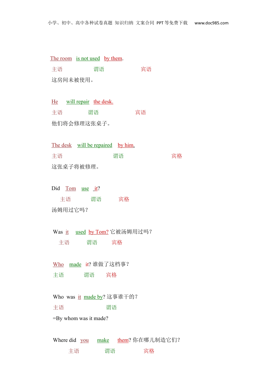 小学、初中、高中各种试卷真题知识归纳文案合同PPT等免费下载www.doc985.com2.主动语态变为被动语态把主动语态的句子变为被动语态的方法很简单:①把原句中的宾语变为主语;②动词改为被动形式,即be+过去分词;③原来的主语,如果需要的话放在by后面以指明做事的人或物。如果没必要,可以省略。1变换方法主动句:Thehunterkilledatiger.猎人打死一只老虎。主语谓语宾语被动句:Atigerwaskilledbythehunter.一只老虎被打死。宾语变主语be动词+过去分词主动语态变为被动语态的步骤如下:步骤1.以主动句的宾语为主语。步骤2.将动词改为《be+过去分词》的被动语态构成。这一步是关键,特别要注意be动词要以新的主语的人称、数来变化,同时时态不变,主动语态是什么时态,被动语态仍保持什么时态。步骤3.将主动语态的主语改为by…形式放在句尾,注意如果是代词,则由主格改为宾格。Theyvisitedthecitytwoyearsago.主语谓语宾语状语他们两年前访问该城市。Thecitywasvisitedbythemtwoyearsago.主语谓语宾格状语该城市两年前被他们访问过。Theydon'tusetheroom.主语谓语宾语他们未使用该房间。小学、初中、高中各种试卷真题知识归纳文案合同PPT等免费下载www.doc985.comTheroomisnotusedbythem.主语谓语宾语这房间未被使用。Hewillrepairthedesk.主语谓语宾语他们将会修理这张桌子。Thedeskwillberepairedbyhim.主语谓语宾格这张桌子将被修理。DidTomuseit?主语谓语宾格汤姆用过它吗?WasitusedbyTom?它被汤姆用过吗?主语谓语宾格Whomadeit?谁做了这档事?主语谓语宾格Whowasitmadeby?这事谁干的?主语谓语=Bywhomwasitmade?Wheredidyoumakethem?你在哪儿制造它们?主语谓语宾格小学、初中、高中各种试卷真题知识归纳文案合同PPT等免费下载www.doc985.comWhereweretheymade(byyou)?主语谓语宾格它们是在哪儿制造的?主动语态变为被动语态练习题一、用括号中被动语态的适当时态填空1.Thenovel______(translate)intomanylanguagessinceitwaspublished.2.Thatclock____(call)BigBen.3.Lastweek,whenI______(ask)aboutEnglishculture,Icouldn'tansweritwell.4.Whatlanguage______(speak)inyourcountry?5.Schoolfootballgames_____often___(hold)onFridayevenings.6.Thefilm_____(show)againsometimenextweek.小学、初中、高中各种试卷真题知识归纳文案合同PPT等免费下载www.doc985.com【答案】1.hasbeentranslated2.iscalled3.wasasked4.isspoken5.are,held6.willbeshown