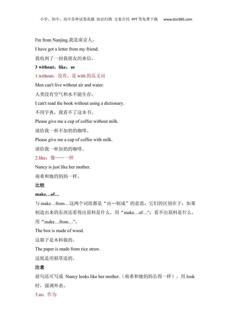 小学、初中、高中各种试卷真题知识归纳文案合同PPT等免费下载www.doc985.com4.其他介词介词除了表示“时间”、“场所”以外,也表示“手段”、“材料”……等1表示手段和材料的介词用with,in,by1.with:a.和……在一起比较in和with用in,with表工具或方法时,在译成中文时区别不大,但在英语上的用法却不大相同。a.用“with”时,后面的名词要加上冠词或代词。withmyear用我的耳朵withapencil用一支铅笔b.用in时,后面加物质名词,不能加冠词。inink用墨水inpencil用铅笔Willyoupleasegowithme?你和我一起去好吗?b.具有、带有Hewasahandsomeboywithlargebrighteyes.他是有着一双大眼睛的英俊男孩子。c.用某工具或方法LiLicutherhandwithaknife.莉莉用刀把手弄破了。Iseewithmyeyes.我用眼睛看。Hewrotetheletterwithanewpen.他用一支新钢笔写这封信。2.in:表示用什么材料(例如用墨水、铅笔)等,或用什么语言,或者表示衣着、声调特点时,不用with,而用in。Shewrotealetterinblackink.小学、初中、高中各种试卷真题知识归纳文案合同PPT等免费下载www.doc985.com她用黑色的墨水写信。Don'twriteitinpencilbutinink.别用铅笔写,用钢笔(水)写。3.by:通过……方法、手段Hegoestoschoolbybicycle.他骑自行车上学。必背!《by+交通工具》的词组bybicycle骑自行车byplane坐飞机bycar坐小汽车(=byair)bybus坐公共汽车bytrain坐火车bytaxi坐出租车byship坐船比较搭乘交通工具用by来表示搭乘交通工具方式、手段时,名词前不加冠词。bytrain坐火车Youcangothereinmycar.你可以坐我的车去那儿。用in表示时,后面要用冠词或代词。同样坐公共汽车可以说:takethe(a)bus2of,from1.of:(属于)……的;表示……的数量或种类ThisisamapofChina.这是一幅中国地图。Willyoupleasegivemeacupoftea?请您给我一杯茶好吗?2.from:来自(某地、某人);以……起始(时间或地点)小学、初中、高中各种试卷真题知识归纳文案合同PPT等免费下载www.doc985.comI'mfromNanjing.我是南京人。Ihavegotaletterfrommyfriend.我收到了一封我朋友的来信。3without,like,as1.without:没有,是with的反义词Mencan'tlivewithoutairandwater.人类没有空气和水不能生存。Ican'treadthebookwithoutusingadictionary.不用字典,我看不了这本书。Pleasegivemeacupofcoffeewithoutmilk.请给我一杯不加奶的咖啡。Pleasegivemeacupofcoffeewithmilk.请给我一杯加奶的咖啡。2.like:像……一样Nancyisjustlikehermother.南希和她的妈妈一样。比较make…of…与make…from…这两个词组都是“由…制成”的意思,它们的区别在于:如果制造出来的东西还看得出原料是什么,用“make…of…”;看不出原料是什么,用“make…from…”。Theboxismadeofwood.这箱子是木料做的。Thepaperismadefromricestraw.这纸是用稻草造的。注意前句还可写成Nancylookslikehermother.(南希和她妈妈长得一样)。用look时,强调外表。3.as:作为小学、初中、高中各种试卷真题知识归纳文案合同PPT等免费下载www.doc985.comHeisfamousasascientisthere.他在此地作为一个科学家而闻名。4against,about1.against:反对;靠着Heisagainsttheplan.(LiMing)他反对这个计划。(他反对李明)。Theteacherisstandingagainsttheblackboard.老师正靠着黑板站着。2.about:a.关于;各处;身旁Tellmesomethingaboutyourlife.告诉我你的生活情况。Helookedabouthimself.他向四处张望。Ihavenomoneyabout(=with)me.我身上没带钱。b.询问某人某物的情况或提出建议Whataboutyoursister?你姐姐情况如何?Howaboutgoingtothepark?去公园怎么样?注意Whatabout…?与Howabout…?的用法没有区别。必背!各种介词短语使用工具withapencil交通工具bybus用某语言inFrench用电视(学英语)learnEnglishonTV付多少钱fortwodollars小学、初中、高中各种试卷真题知识归纳文案合同PPT等免费下载www.doc985.com其他介词练习题1.Sallyisveryhappy.Thereisabigsmileherface.A.onB.toC.inD.a2.—It'sveryimportant.—Yes.Youmusttrytomakeitcarefully.A.ofB.for...
