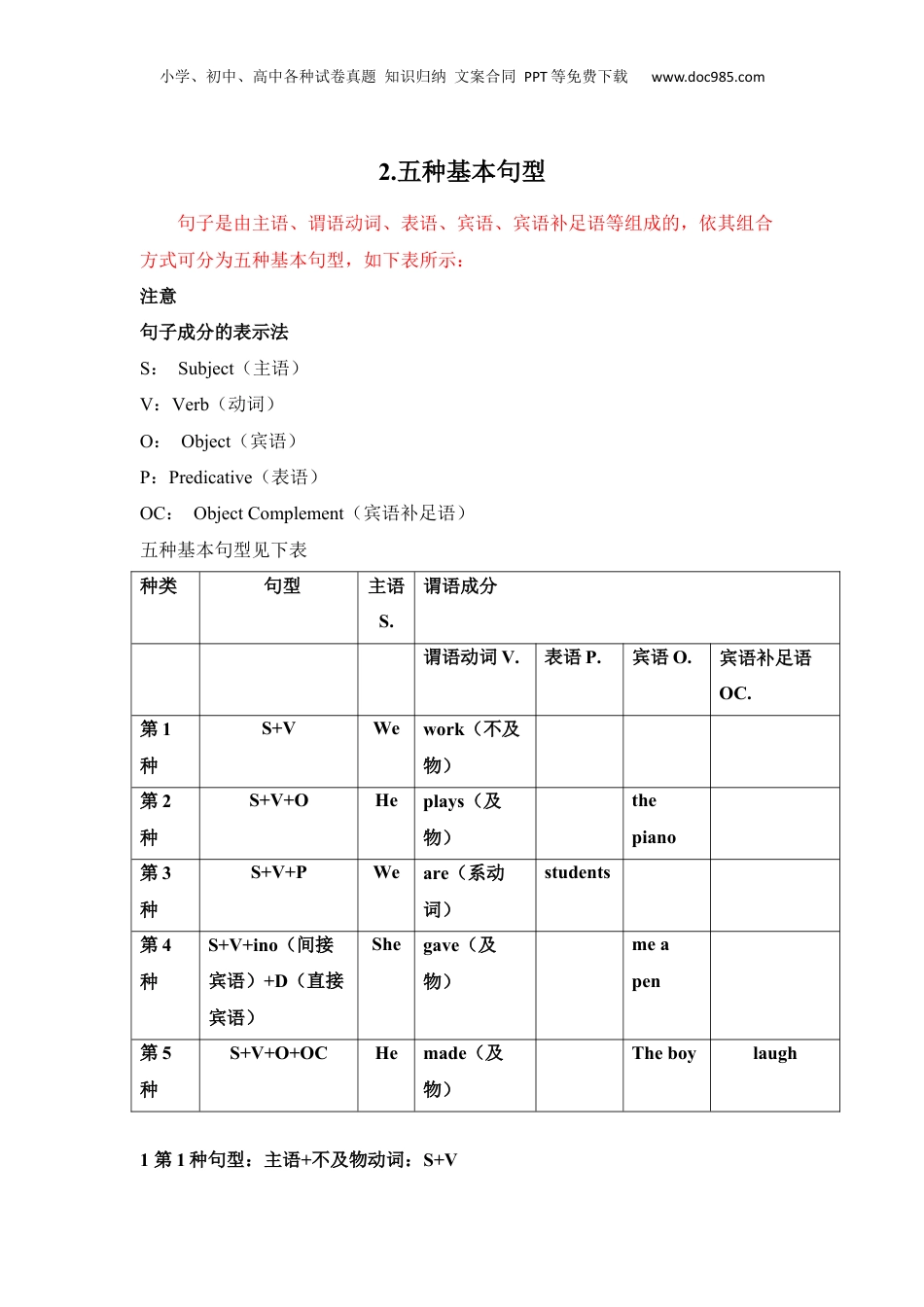 小学、初中、高中各种试卷真题知识归纳文案合同PPT等免费下载www.doc985.com2.五种基本句型句子是由主语、谓语动词、表语、宾语、宾语补足语等组成的,依其组合方式可分为五种基本句型,如下表所示:注意句子成分的表示法S:Subject(主语)V:Verb(动词)O:Object(宾语)P:Predicative(表语)OC:ObjectComplement(宾语补足语)五种基本句型见下表种类句型主语S.谓语成分谓语动词V.表语P.宾语O.宾语补足语OC.第1种S+VWework(不及物)第2种S+V+OHeplays(及物)thepiano第3种S+V+PWeare(系动词)students第4种S+V+ino(间接宾语)+D(直接宾语)Shegave(及物)meapen第5种S+V+O+OCHemade(及物)Theboylaugh1第1种句型:主语+不及物动词:S+V小学、初中、高中各种试卷真题知识归纳文案合同PPT等免费下载www.doc985.comBirdsfly.鸟飞。主语谓语(不及物动词)Herunsinthepark.他在公园里跑。主语谓语地点状语(不及物动词)此句型是《主语+不及物动词》构成句子的主体部分。因为是不及物动词,后面当然不能带宾语了,但是可以有状语来修饰。例如上面例句中的inthepark,是地点状语。Classbegins.(begin在句中是不及物动词)开始上课。比较webeginOurclassateight.我们八点钟开始上课。该句属于第2种句型,begin在句中是及物动词,由此可见有些动词既可作及物动词也可以作不及物动词。必背!只能当不及物动词的词sleep睡觉walk步行swim游泳happen(takeplace)发生go去come来work工作laugh笑stay呆在……arrive到达2第2种句型:主语+及物动词+宾语:S+V+O小学、初中、高中各种试卷真题知识归纳文案合同PPT等免费下载www.doc985.comMyfatherreadthebook.我父亲读过那本书。主语谓语(及物动词)宾语注意有些不及物动词后面加上介词就可把它看成一个及物动词,后面就可以加宾语了。Youmustlistentome.你必须听我的。(Listen是不及物动词。但加上to之后,Listento可以看成一个及物动词)有宾语的动词是及物动词,可当宾语者有名词和名词的相当语(如代词、不定式、动名词……)。ShelikesEnglish.(名词作宾语)她喜欢英语。Iknowhimverywell.(代词作宾语)(同第一种句型一样,本句型可以有状语、定语修饰)我非常了解他。Theywanttogo.(不定式作宾语)他们想走。Hestoppedwriting.(动名词作宾语)他停下笔。3第3种句型:主语+系动词+表语:S+V+PHebecameascientist.他成为一个科学家了。主语谓语(系动词)表语be动词和become是英语中常见的系动词,后面必须接表语,才能用来说明主语,表示“……是……”,“……变成……”等意思。表语通常是名词或形容词等。Theyarehonest.他们是诚实的。Hebecameascientist.小学、初中、高中各种试卷真题知识归纳文案合同PPT等免费下载www.doc985.com他成为了一个科学家。Hisfacegoesred.他的脸变红了。Itgrewdark.天变黑了。注意在英语中,除了be动词和become属于系动词外,还有一些实义动词,当表示状态存在或表示状态变化时也可以作系动词。这些词有:keep保持look看起来fell觉得smell闻起来sound听起来taste尝起来grow,get,go,turn变得4第4种句型:主语+及物动词+间接宾语+直接宾语HegaveTomapresent.他给汤姆一件礼物。主谓(及物)宾(间接)宾(直接)Giveittome.把它给我。谓(及物)宾(直接)宾(间接)1.及物动词作谓语时,后面要跟宾语,宾语分直接宾语和间接宾语。直接宾语是及物动词的直接对象(参见第2种句型)。但有些动词,除了直接宾语外,还要求一个间接宾语,这个间接宾语通常是及物动词的动作所及的人或物,也可以说是间接宾语表示动作是对谁做的,或是为谁做的,所以只能是名词或宾格代词担当。Wesentthematelegram.我们给他们发了一封电报。主谓宾(间接)宾(直接)小学、初中、高中各种试卷真题知识归纳文案合同PPT等免费下载www.doc985.com必背!常带双宾语(直接宾语和间接宾语)的动词(分为A、B两类)A:动词后加togive给show给……看send寄,打电报bring带……read读……pass递给……lend借给……leave留给……hand交给……tell告诉……return把……还给…write给……写信throw扔……promise答应...