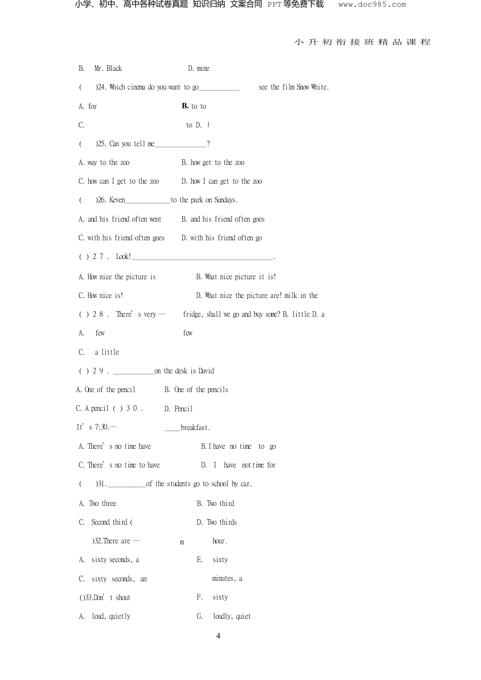 小学、初中、高中各种试卷真题知识归纳文案合同PPT等免费下载www.doc985.com()1.A.palaceB.magicC.ManyD.parent()2.A.cerealB.messyC.reuseD.Protect()3.A.ApnlB.medicmeC.fmallyD.fooUsh()4.A.don,tB.prajectC.welcomeD.honey()5.A.JuneB.JulyC.cutD.minus()6.A.cowB.outC.downD.cloud()7.A.breadB.weatherC.reallyD.healthy()8.A.birthdavB.davC.saysD.again()9.A.wormB.worldC.dwaysD.small()lO.A.dangerB.eveningC.EnglishD.finger小升初衔接班精品课程目录2016学大教育暑期课程入学测评(初一.........................................2第一讲音标元音、辅音................................................................9第二讲词性的讲解一冠词..........................................................23第三讲词性的讲解一形容词、副词.........................................29第四讲词性的讲解一代词.........................................................41.第五讲小学时态的讲解............................................................47第六讲句型的用法(一)..........................................................53第七讲句型的用法(二)..........................................................632016学大教育暑期课程期中测试(初一)....................................69第八讲7AU1Thisisme!知识点讲解.......................................74第九讲一般现在时讲解............................................................81第十讲U2Let’splaysports知识点讲解...................................86第十一一般现在时深度讲解......................................................90第十二讲U3Welcometoourschool讲解.....................................101第十三讲人称代词讲解................................................................111第十四讲U4Myday知识点讲解.....................................................119第十五讲介词的深入讲解........................................................124第十六讲结课总复习.................................................................1322016学大教育暑期课程结课测评(初一)..................................142参考答案...........................................................................................1501小升初衔接班精品课程2016学大教育暑期课程入学测评(初-)英语试题考试时间:80分钟PartOne-SoundTime(10%)Judgethenumberofthedifferentpronunciations.(A.lB.2C.3D.4)PartTwo-Vocabulary&GrammarTime(60%)1.Choosethebestanswer()11.Timdidn’tflythekitehighyesterday,_________________?A.washe?B.couldhe?C.didhe?D.doeshe?()12.There’s_______“h”and_________“n”intheword“hand”.A.a,anB.a,aC.an,aD.an,an()13.Comeandshowmetheanswer____________________thequestion.A.toB.ofC.forD.with()14.-What?sAlicelike?A.DancingB.Shelikesmusic2小学、初中、高中各种试卷真题知识归纳文案合同PPT等免费下载www.doc985.com小升初衔接班精品课程C.SheislikemusicD.Sheisnice()15.---_________isthatbrownshirt?---It’s115yuan.A.HowmuchB.HowmanyC.HowaboutD.Howmoney()16.1don’tlikethat_________book.Ifeel___________.A.bored,boredB.boring,boringC.boring,boredD.bored,boring()17.Whoseisthisnicebedroom?-it’s________________.A.Tim’sandJim’sB.TimandJimC.Tim’sandJimD.TimandJim’s()18.Thesupermarketisn’t________________before9:30onweekdays.A.openB.closingC.openingD.close()19.__________everybody_____________atthebirthdayparty?A.Are,haveagoodtimeB.Does,haveagoodtimeC.Do,havefunD.Will,havingfun()20.There________afootballmatchthisweekend.A.willhaveB.isgoingtohaveC.willbeD.isgoingto()21.Let’splaygames,_________first,and________second.A.Lucy...