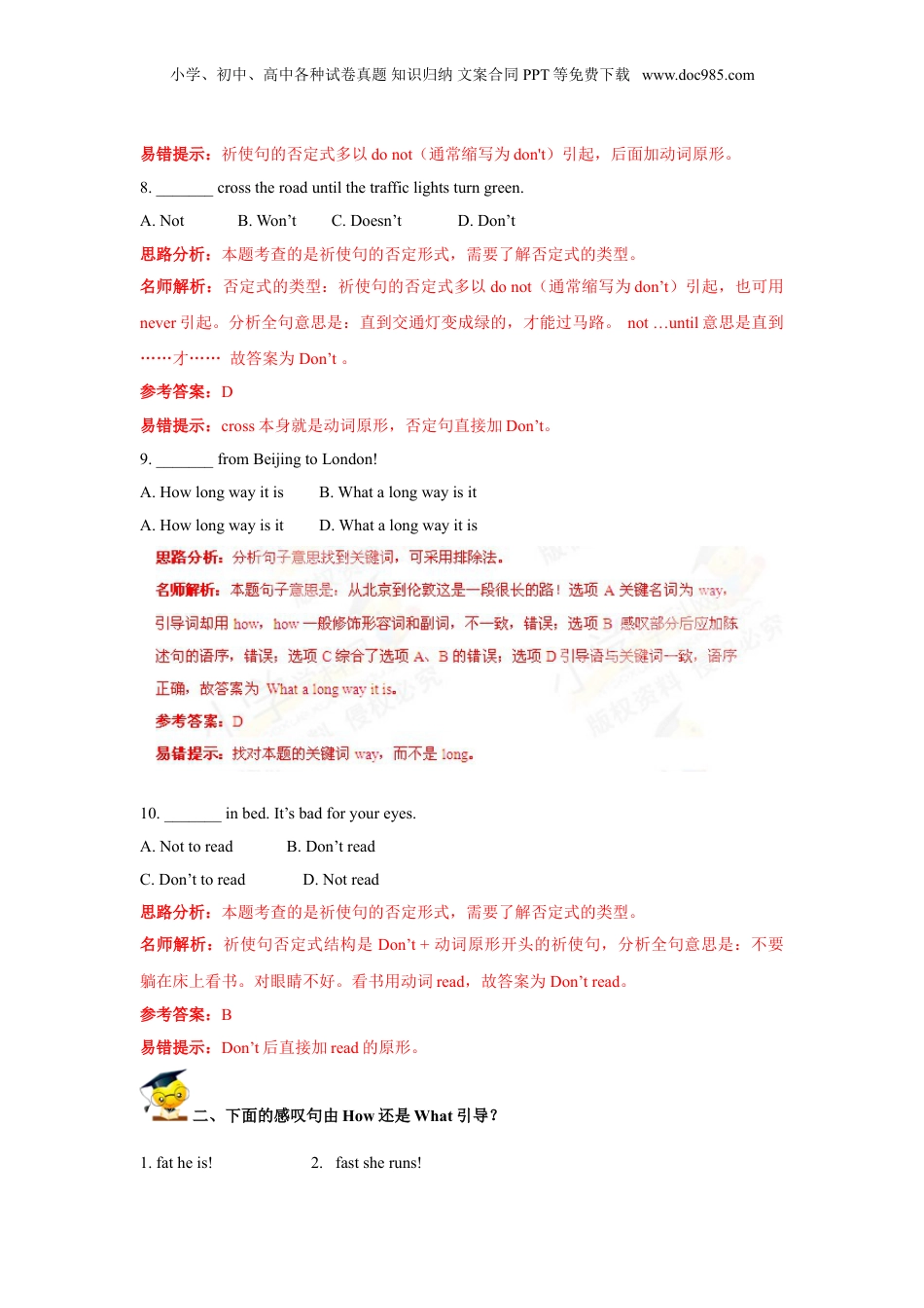 小学、初中、高中各种试卷真题知识归纳文案合同PPT等免费下载www.doc985.com2016小升初英语高频考点过关演练7感叹句和祈使句(解析版)一、选择正确答案填空。1._______tallbuildingitis!A.HowB.WhatC.WhataD.Howa思路分析:本题考查的是感叹句的构成,需要通过分析句子选择正确的引导词。名师解析:本题句子意思是:多高的楼房啊!需要修饰的词为tallbuilding意思是:高楼,building为可数名词单数形式,应在tall前加定冠词a。what修饰名词,how修饰形容词,副词或动词,因此答案为Whata。参考答案:C易错提示:本题的关键词是building,而不是tall。2._______fasttherabbitsrun!A.WhatB.WhataC.HowD.Howa思路分析:本题的关键词是fast,how修饰副词。名师解析:本题句子意思是:兔子们跑得真快啊!需要修饰的词为fast,意思是:快的,为副词,引导词为how,因此答案为How。参考答案:C易错提示:找对本题关键词fast。3._______saltytheeggis!A.HowB.HowaC.WhataD.What思路分析:本题的关键词是salty,how修饰形容词。名师解析:本题句子意思是:鸡蛋真咸啊!需要修饰的词为salty意思是:咸的,为形容词。引导词为how,因此答案为How。参考答案:A易错提示:找对本题关键词salty。小学、初中、高中各种试卷真题知识归纳文案合同PPT等免费下载www.doc985.com4._______fullbasketitis!A.WhatB.WhataC.HowD.Howa思路分析:本题的关键词是basket,what修饰名词。名师解析:本题句子意思是:这么满的篮子!需要修饰的词为fullbasket意思是:满满的篮子,basket为可数名词单数形式,应在full前加定冠词a,引导词为what,因此答案为Whata。参考答案:B易错提示:本题的关键词是basket,而不是full。5.Nice_______you!A.tomeetB.meetingC.metD.tomeeting思路分析:本题考查的是日常生活中的常用语。要做对此题,需要判断清楚to的用法。名师解析:Nice后再加动词的话需要用to连接,并且to后的动词用原形。因此答案为tomeet.参考答案:A易错提示:to后的动词用原形,不能用meeting形式。6._______theradio,please.Thebabyissleepingnow.A.NotturnonB.Don’tturnonB.NotturndownD.Don’tturndown7._______lateagain,Bill!A.Don’ttobeB.Don’tbeCNotbeD.Benot思路分析:本题考查的是祈使句的否定形式,需要了解否定式的类型。名师解析:belate意思是迟到,分析本句意思是Bill别迟到了,在be前应加Don’t,故答案为Don’tbe。参考答案:B小学、初中、高中各种试卷真题知识归纳文案合同PPT等免费下载www.doc985.com易错提示:祈使句的否定式多以donot(通常缩写为don't)引起,后面加动词原形。8._______crosstheroaduntilthetrafficlightsturngreen.A.NotB.Won’tC.Doesn’tD.Don’t思路分析:本题考查的是祈使句的否定形式,需要了解否定式的类型。名师解析:否定式的类型:祈使句的否定式多以donot(通常缩写为don’t)引起,也可用never引起。分析全句意思是:直到交通灯变成绿的,才能过马路。not…until意思是直到……才……故答案为Don’t。参考答案:D易错提示:cross本身就是动词原形,否定句直接加Don’t。9._______fromBeijingtoLondon!A.HowlongwayitisB.WhatalongwayisitA.HowlongwayisitD.Whatalongwayitis10._______inbed.It’sbadforyoureyes.A.NottoreadB.Don’treadC.Don’ttoreadD.Notread思路分析:本题考查的是祈使句的否定形式,需要了解否定式的类型。名师解析:祈使句否定式结构是Don’t+动词原形开头的祈使句,分析全句意思是:不要躺在床上看书。对眼睛不好。看书用动词read,故答案为Don’tread。参考答案:B易错提示:Don’t后直接加read的原形。二、下面的感叹句由How还是What引导?1.fatheis!2.fastsheruns!小学、初中、高中各种试卷真题知识归纳文案合同PPT等免费下载www.doc985.com3.alovelydog!4.aninterestingfilm!5.nicethefoodis!6.agoodboy!7.kindhismotheris!8.anicecameraitis!9.cleverstudentstheyare!10.slowlytherabbitsrun!思路分析:通过分析关键词词性,选择how或what。名师解析:1.本题句子意思是:他真胖!需要修饰的词为fat意思是:胖的,为形...