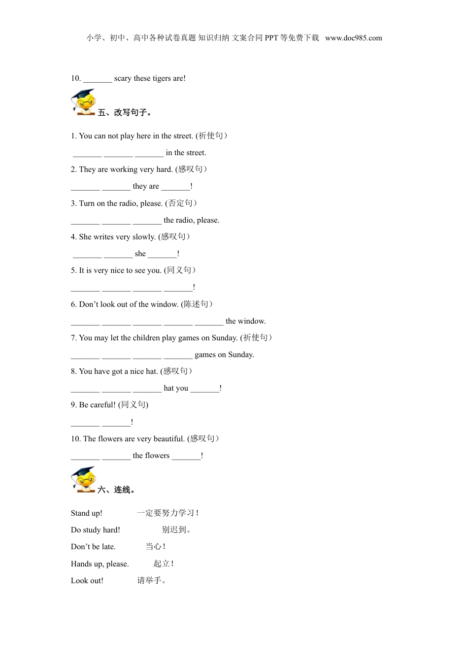 小学、初中、高中各种试卷真题知识归纳文案合同PPT等免费下载www.doc985.com2016小升初英语高频考点过关演练7感叹句和祈使句(原卷)一、选择正确答案填空。1._______tallbuildingitis!A.HowB.WhatC.WhataD.Howa2._______fasttherabbitsrun!A.WhatB.WhataC.HowD.Howa3._______saltytheeggis!A.HowB.HowaC.WhataD.What4._______fullbasketitis!A.WhatB.WhataC.HowD.Howa5.Nice_______you!A.tomeetB.meetingC.metD.tomeeting6._______theradio,please.Thebabyissleepingnow.A.NotturnonB.Don’tturnonB.NotturndownD.Don’tturndown7._______lateagain,Bill!A.Don’ttobeB.Don’tbeCNotbeD.Benot8._______crosstheroaduntilthetrafficlightsturngreen.A.NotB.Won’tC.Doesn’tD.Don’t9._______fromBeijingtoLondon!A.HowlongwayitisB.WhatalongwayisitA.HowlongwayisitD.Whatalongwayitis10._______inbed.It’sbadforyoureyes.A.NottoreadB.Don’tread小学、初中、高中各种试卷真题知识归纳文案合同PPT等免费下载www.doc985.comC.Don’ttoreadD.Notread二、下面的感叹句由How还是What引导?1.fatheis!2.fastsheruns!3.alovelydog!4.aninterestingfilm!5.nicethefoodis!6.agoodboy!7.kindhismotheris!8.anicecameraitis!9.cleverstudentstheyare!10.slowlytherabbitsrun!三、用祈使句写出以下标志的含义。1._______2._______3._______4._______5._______6._______7._______8._______9._______10._______四、填入适当的词完成下列感叹句。1._______difficulthomeworkwehadyesterday!2._______cutedogitis!3._______interestingthestoryis!4._______badtheweatherinEnglandis!5._______honestboyTomis!6._______tastysmellthecakegaveoff!7._______goodtimewehadonthebeachyesterday!8._______excitingnewsyou’vebroughtus!9._______coolyournewcaris!小学、初中、高中各种试卷真题知识归纳文案合同PPT等免费下载www.doc985.com10._______scarythesetigersare!五、改写句子。1.Youcannotplayhereinthestreet.(祈使句)_____________________inthestreet.2.Theyareworkingveryhard.(感叹句)______________theyare_______!3.Turnontheradio,please.(否定句)_____________________theradio,please.4.Shewritesveryslowly.(感叹句)______________she_______!5.Itisverynicetoseeyou.(同义句)____________________________!6.Don’tlookoutofthewindow.(陈述句)___________________________________thewindow.7.YoumayletthechildrenplaygamesonSunday.(祈使句)____________________________gamesonSunday.8.Youhavegotanicehat.(感叹句)_____________________hatyou_______!9.Becareful!(同义句)______________!10.Theflowersareverybeautiful.(感叹句)______________theflowers_______!六、连线。Standup!一定要努力学习!Dostudyhard!别迟到。Don’tbelate.当心!Handsup,please.起立!Lookout!请举手。小学、初中、高中各种试卷真题知识归纳文案合同PPT等免费下载www.doc985.com七、将下列汉语翻译成英语。1.不要这么吵。_______________________________________________________________________2.请照看好您的包。_______________________________________________________________________3.不要把书放这儿。_______________________________________________________________________4.不要浪费你的时间。_______________________________________________________________________5.务必请坐。_______________________________________________________________________八、将以下祈使句改为否定式。1.Comehereearly._______________________________________________________________________2.Askhim._______________________________________________________________________3.Pleasewaitforher._______________________________________________________________________4.Readthebookcarefully._______________________________________________________________________5.Situnderthetree,please._______________________________________________________________________6.Let’sgotheretogether._______________________________________________________________________小学、初中、高中各种试卷真题知识归纳文案合同PPT等免费下载www.doc985.com参考答案:一、l.C2.C3.A4.B5.A6.B7.B8.D9.D10.B二、1.How2.How3.What4.What5.How6.What7.How8.What9.What10.How三、1.Nolyingdown.2.Nopet.3.Nofishing.4.Noentry.5.Noswimming.6.Nophotos.7.Nolitter.8.Bequiet.9.Nosmoking.10.Noparking.四、1.What2.Whata3.How4.How5.Whatan6.Whata7.Whata8.What9.How10.How五、六、七、八、1.Don’tcomehereearly.2.Don’taskhim.3.Pleasedon’twaitforher.1.Don’tplayhereinthestreet.3.Don’tturnontheradio,please.5.Nicetoseeyou!7.LetthechildrenplaygamesonSunday.9.Lookout!2.Howhardtheyareworking!4.Howslowlyshewrites!6.Youmustn’tlookoutofthewindow.8.Whatanicehatyouhave!10.Howbeautifultheflowersare!小学、初中、高中各种试卷真题知识归纳文案合同PPT等免费下载www.doc985.com4.Don’treadthebookcarefully.5.Don’tsitunderthetree,please.6.Let’snotgotheretogether.