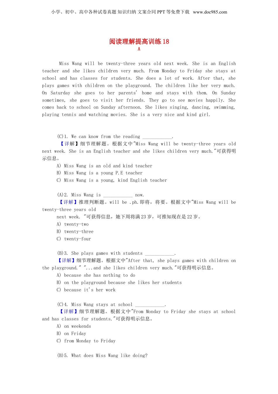 小学、初中、高中各种试卷真题知识归纳文案合同PPT等免费下载www.doc985.com阅读理解提高训练18AMissWangwillbetwenty-threeyearsoldnextweek.SheisanEnglishteacherandshelikeschildrenverymuch.FromMondaytoFridayshestaysatschoolandhasclassesforstudents.Shedoesalotofwork.Afterthat,sheplaysgameswithchildrenontheplayground.Thechildrenlikeherverymuch.OnSaturdayshegoestoherparents'homeandstayswiththem.OnSundaysometimes,shegoestovisitherfriends.Theygotoseemovieshappily.ShecomesbacktoschoolonSundayafternoon.Shelikessinging,dancing,swimming,playingtennisandwatchingmovies.Sheisaveryniceandkindgirl.21世纪教育网版权所有(C)1.Wecanknowfromthereading____________.21·cn·jy·com【详解】细节理解题。根据文中"MissWangwillbetwenty-threeyearsoldnextweek.SheisanEnglishteacherandshelikeschildrenverymuch."可获得明示信息。A)MissWangisanoldandkindteacherB)MissWangisayoungP.EteacherC)MissWangisayoung,kindEnglishteacher2·1·c·n·j·y(A)2.MissWangis____________now.【详解】推理判断题。willbe.ph.即将,将要。根据文中"MissWangwillbetwenty-threeyearsold【来源:21·世纪·教育·网】nextweek."可获得信息,她下周将满23岁,可推知现在是22岁。A)twenty-twoB)twenty-threeC)twenty-four(B)3.Sheplaysgameswithstudents____________.21·世纪*教育网【详解】细节理解题。根据文中"Afterthat,sheplaysgameswithchildrenontheplayground.""...andshelikeschildrenverymuch."可获得明示信息。A)becauseshehasnothingtodoB)ontheplaygroundbecauseshelikesherstudentswww-2-1-cnjy-comC)becauseit'sherwork(C)4.MissWangstaysatschool____________.21*cnjy*com【详解】细节理解题。根据文中"FromMondaytoFridayshestaysatschoolandhasclassesforstudents."可获得明示信息。【来源:21cnj*y.co*m】A)onweekendsB)onFridayC)fromMondaytoFriday(B)5.WhatdoesMissWanglikedoing?小学、初中、高中各种试卷真题知识归纳文案合同PPT等免费下载www.doc985.com【详解】细节理解题。根据文中"Shelikessinging,dancing,swimming,playingtennisandwatchingmovies."可获得明示信息。【出处:21教育名师】A)Shelikesplayingcomputergames.B)Shelikesplayingtennisandswimming.C)Shelikeseatingvegetables.BDoyoulikechildren?Areyoufreeintheafternooneverydayonweekdays?Weneedababysitterforourdaughter.Sheisonlyfiveyearsold.Hoursfrom2:00p.m.to6:00p.m.Payis$5anhour.Forthejob,youhavetowatchmydaughtercarefully,readpicturebooksforherandplaygameswithher.Youhavetoworkatourhouse.WeliveonYouyiAvenue,acrosstheShoppingMall.PleasecallMr.Liat18971132567.21教育网(C)1.____________iswantedinthead(广告).【详解】细节理解题。根据文中"Weneedababysitterforourdaughter."可获得明示信息。2-1-c-n-j-yA)AteacherB)AworkerC)Ababysitter(C)2.WhatdoestheunderlinedwordmeaninChinese?www.21-cn-jy.com【详解】猜测词义题。句意:薪水为每小时五美元。A)工作.B)价格.C)薪水.(C)3.Thebabysitterworksfor____________hoursaweek.【详解】推理判断题。weekdays.n.工作日、周一至周五。根据文中"Areyoufreeintheafternooneverydayonweekdays?""Hoursfrom2:00p.m.to6:00p.m."获得信息,每周工作5天(周一至周五),每天工作4小时(下午2点至6点),经过计算推知,每周工作时间为20小时。21cnjy.comA)fifteenB)thirtyC)twenty(A)4.Ifyougetthejob,youwillgetatleast____________amonth.【详解】推理判断题。根据文中"Payis5$anhour."可获得信息,每小时薪水5美元,一周工作20小时,即一个月工作80小时,经过计算推知,每个月薪水为400美元。A)400dollars小学、初中、高中各种试卷真题知识归纳文案合同PPT等免费下载www.doc985.comB)300dollarsC)200dollars(A)5.Whatjobsdoesn'tthebabysitterdo?【详解】细节理解题。根据文中"Forthejob,youhavetowatchmydaughtercarefully,readpicturebooksforherandplaygameswithher."可获得信息。A)Cookingdinnerforthegirl.B)Readingbooksforthegirl.C)Playingwiththegirl.