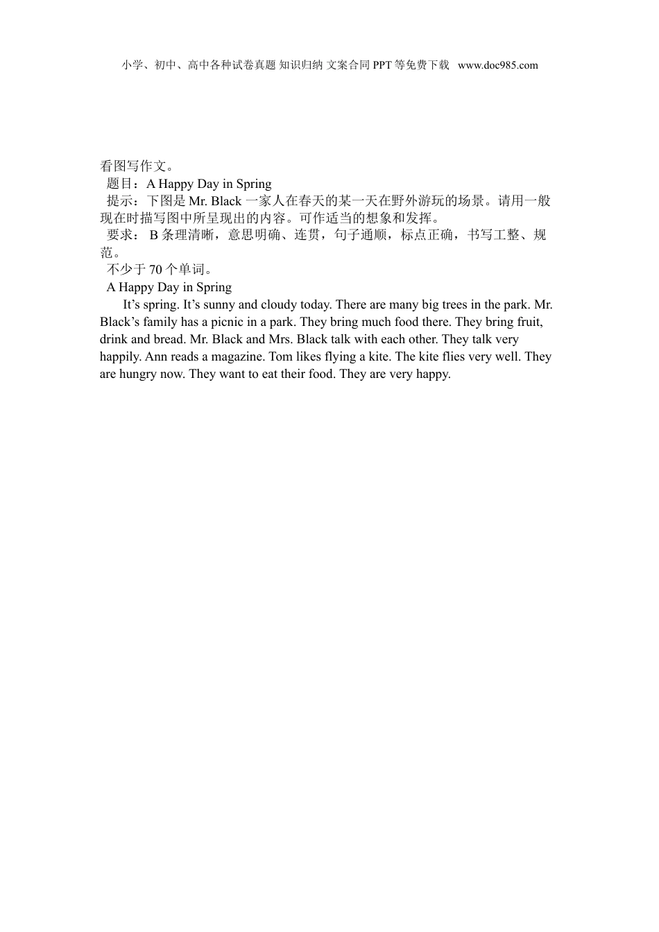小学、初中、高中各种试卷真题知识归纳文案合同PPT等免费下载www.doc985.com看图写作文。题目:AHappyDayinSpring提示:下图是Mr.Black一家人在春天的某一天在野外游玩的场景。请用一般现在时描写图中所呈现出的内容。可作适当的想象和发挥。要求:B条理清晰,意思明确、连贯,句子通顺,标点正确,书写工整、规范。不少于70个单词。AHappyDayinSpringIt’sspring.It’ssunnyandcloudytoday.Therearemanybigtreesinthepark.Mr.Black’sfamilyhasapicnicinapark.Theybringmuchfoodthere.Theybringfruit,drinkandbread.Mr.BlackandMrs.Blacktalkwitheachother.Theytalkveryhappily.Annreadsamagazine.Tomlikesflyingakite.Thekitefliesverywell.Theyarehungrynow.Theywanttoeattheirfood.Theyareveryhappy.