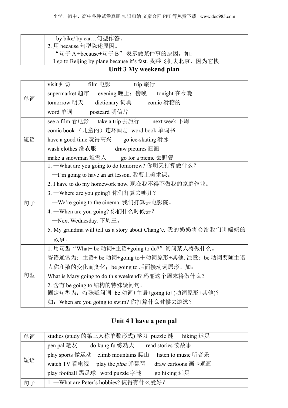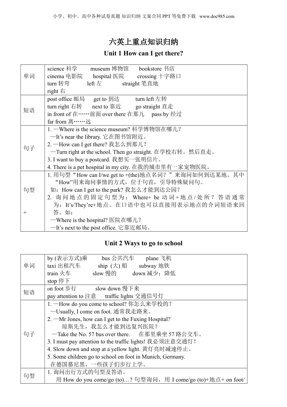 小学、初中、高中各种试卷真题知识归纳文案合同PPT等免费下载www.doc985.com六英上重点知识归纳Unit1HowcanIgetthere?单词science科学museum博物馆bookstore书店cinema电影院hospital医院crossing十字路口turn转弯left左straight笔直地right右短语postoffice邮局getto到达turnleft左转turnright右转nextto靠近gostraight直走infrontof在……前面overthere在那儿passby经过farfrom离……远句子1.—Whereisthesciencemuseum?科学博物馆在哪儿?—It’snearthelibrary.它在图书馆附近。2.—HowcanIgetthere?我怎么到那儿?—Turnrightattheschool.Thengostraight.在学校右转。然后直走。3.Iwanttobuyapostcard.我想买一张明信片。4.Thereisapethospitalinmycity.在我的城市里有一家宠物医院。句型+1.用句型“HowcanI/wegetto+(the)地点名词?”来询问如何到达某地。其中“How”用来询问事情的方式,位于句首,引导特殊疑问句。如:HowcanIgettothepark?我怎么才能到达公园?2.询问地点的固定句型为:Where+be动词+地点/处所?答语通常为:It’s/They’re+地点。在口语中也可以直接用表示地点的介词短语来回答。如:—Whereisthehospital?医院在哪儿?—It’snexttothepostoffice.它靠近邮局。Unit2Waystogotoschool单词by(表示方式)乘bus公共汽车plane飞机taxi出租汽车ship(大)船subway地铁train火车slow慢的down减少;降低stop停下短语onfoot步行slowdown慢下来payattentionto注意trafficlights交通信号灯句子1.—Howdoyoucometoschool?你怎么来学校的?—Usually,Icomeonfoot.通常我走路来。2.—MrJones,howcanIgettotheFuxingHospital?琼斯先生,我怎么才能到达复兴医院?—TaketheNo.57busoverthere.在那里乘坐57路公交车。3.Imustpayattentiontothetrafficlights!我必须注意交通灯!4.Slowdownandstopatayellowlight.黄灯亮时减速停止。5.SomechildrengotoschoolonfootinMunich,Germany.在德国慕尼黑,一些孩子们步行上学。句型1.询问出行方式的句型及答语。用Howdoyoucome/go(to)…?句型询问,用Icome/go(to)+地点+onfoot/小学、初中、高中各种试卷真题知识归纳文案合同PPT等免费下载www.doc985.combybike/bycar…句型作答。2.用because句型陈述原因。“句子A+because+句子B”表示做某件事的原因。如:IgotoBeijingbyplanebecauseit’sfast.我乘飞机去北京,因为它快。Unit3Myweekendplan单词visit拜访film电影trip旅行supermarket超市evening晚上;傍晚tonight在今晚tomorrow明天dictionary词典comic滑稽的word单词postcard明信片短语seeafilm看电影takeatrip去旅行nextweek下周comicbook(儿童的)连环画册wordbook单词书haveagoodtime玩得高兴goice-skating滑冰washclothes洗衣服drawpictures画画makeasnowman堆雪人goforapicnic去野餐句子1.—Whatareyougoingtodotomorrow?你明天打算做什么?—I’mgoingtohaveanartlesson.我要上美术课。2.Ihavetodomyhomeworknow.现在我不得不做我的家庭作业。3.—Whereareyougoing?你们打算去哪儿?—We’regoingtothecinema.我们打算去电影院。4.—Whenareyougoing?你们什么时候去?—NextWednesday.下周三。5.MygrandmawilltellusastoryaboutChang’e.我的奶奶将会给我们讲嫦娥的故事。句型1.用句型“What+be动词+主语+goingtodo?”询问某人将做什么。答语通常为:主语+be动词+goingto+动词原形+其他.注意:be动词要随主语人称和数的变化而变化;begoingto后面接动词原形。如:WhatisMarygoingtodothisweekend?玛丽这个周末将做什么?2.含有begoingto结构的特殊疑问句。固定句型为:特殊疑问词+be动词+主语+goingto+(动词原形+其他)?如:Whenareyougoingtoswim?你打算什么时候去游泳?Unit4Ihaveapenpal单词studies(study的第三人称单数形式)学习puzzle谜hiking远足短语penpal笔友dokungfu练功夫readstories读故事playsports做运动climbmountains爬山listentomusic听音乐watchTV看电视playthepipa弹琵琶drawcartoons画卡通画playfootball踢足球wordpuzzle字谜gohiking远足句子1.—WhatarePeter’shobbies?彼得有什么爱好?小学、初中...