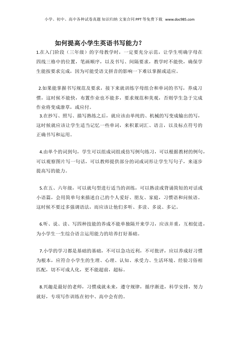 小学、初中、高中各种试卷真题知识归纳文案合同PPT等免费下载www.doc985.com如何提高小学生英语书写能力?1.在入门阶段(三年级)的字母教学时,一定要充分示范,让学生明确字母在四线三格中的位置,笔画顺序,以及书写、间隔要求,教学时不能快,确保学生能按要求完成,因为可能受语文拼音的影响一下难以掌握或适应。2.如果能掌握书写规范及要求,接下来就训练字母组合和单词的书写,养成习惯,这时候不能快,布置作业也不能多,要求规范和美观,否则学生急于完成作业将变成潦草,或应付。3.在抄写、照写、描写熟练之后,就应该由单纯的、机械的写变成输出的写,这时候就应该让学生适当记忆一些单词,来积累词汇、语言,以及标点符号的正确书写和运用。4.由单个的词到句,学生可以组成词组或仿写例句练习,可以根据教材的例句,可以观察图片写一句话,可以教师提供部分的词或词形让学生写句子,来逐步提高写的能力。5.在五、六年级,可以就句型进行适当的训练,可以熟读或背诵简短的对话或小语篇,会用简单句来描述自己的个人爱好、朋友、家庭,习惯语和问候语。这时候不要过多强调语法,而应该让他们多听、多读、多说、多记。6.听、说、读、写四种技能的养成不能单独隔开来学习,应该并重,互相促进,为小学生一生综合语言运用能力的培养打好基础。7.小学的学习都是基础的基础,不可以急功近利,不可批评,应以养成好习惯为根本,应符合小学生的生理、心理、认知、承受力、生活环境、经验习俗相匹配,切不可成人化,更不能超前,超标。8.兴趣是最好的老师,习惯成就未来,遵守规律,循序渐进,科学安排,努力就好,专项写作训练在初中、高中会有的。