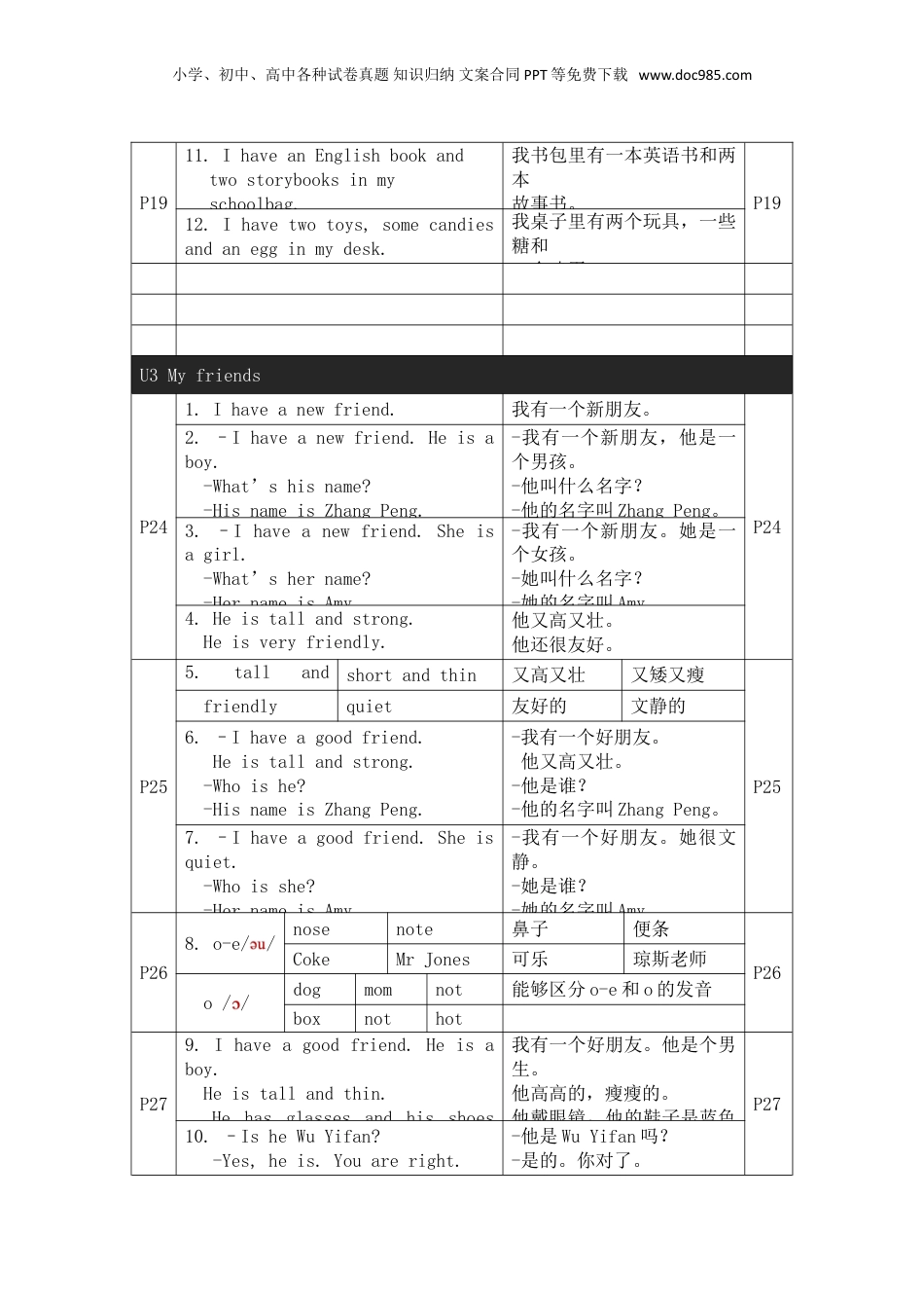 小学、初中、高中各种试卷真题知识归纳文案合同PPT等免费下载www.doc985.com四年级上册重点知识重点句子U1MyclassroomP41.Hey,ZhangPeng.Wehaveanewclassroom.嗨,ZhangPeng,我们有一个新教室。P42.Really?Let’sgoandsee.真的吗?一起去看看。3.–What’sintheclassroom?-OneTV,manydesksandchairs.-教室里有什么?-一台电视机,许多桌子椅子。4.–Whereisyourpicture?-It’snearthewindow.-你的画在哪里?-在窗户旁边。P55.classroomwindowdoor教室窗户门P5blackboardpicturelight黑板图画灯6.Openthedoor.Turnonthelight.Closethewindow.Putupthepicture.Cleantheblackboard.开门。开灯。关窗户。挂图片。擦黑板。P67.a-e/ei/cakefacenamemakea-e蛋糕脸名字制作P6a//capmapdadcata帽子地图爸爸猫P78.-Let’scleantheclassroom.–OK.-我们一起来打扫教室吧。-好的。P79.Letmecleantheteacher’sdesk.我来擦讲台桌。10.Letmecleanthewindows.我来擦窗户。11.–Letmehelpyou.–Thankyou.-我来帮你。-谢谢。P812.teacher’sdeskcomputer讲台电脑P8fanwallfloor电风扇墙壁地板13.Thisismynewclassroom.这是我的新教室。14.Thedoorisorange.Thewindowsarewhite.门(一扇)是橘红色的。窗户(佷多扇)是白色的。15.Thefloorisgreen.Thewallsareblue.地板是绿色的。四周的墙是蓝色的。P916.–Whereisthegreenbook?-Itisundertheteacher’sdesk.-绿色的书在哪里?-在讲台下面。P9小学、初中、高中各种试卷真题知识归纳文案合同PPT等免费下载www.doc985.com17.–Whereisthekite?-Itisnearthewindow.-风筝在哪里?-在窗户旁边。18.Thepictureisnearthekite.图画在风筝旁边。19.Thebluepencilisonthefloor.蓝色的铅笔在地板上。U2MyschoolbagP141.-Ihaveanewschoolbag.-Really?-我有一个新书包。-真的吗?P142.–What’sinyourschoolbag?-AnEnglishbook,amathsbook,threestorybooksand…-It’safatpanda.-你书包里有什么?-一本英语书,一本数学书,三本故事书…-它是一只胖熊猫。P153.aschoolbagtwoschoolbags一个书包两个书包P15amathsbooktwomathsbooks一本数学书两本数学书anEnglishbooktwoEnglishbooks一本英语书两本英语书aChinesebooktwoChinesebooks一本语文书两本语文书astorybooktwostorybooks一本故事书两本故事书P164.i-e/ai/likekitei-e/ai/喜欢风筝P16fiveninerice五九米饭i/i/bigpigsixi/i/大的猪六P175.Excuseme.Ilostmyschoolbag.打扰一下,我书包丢了。P176.–Whatcolourisyourschoolbag?-It’sblueandwhite.-你的书包什么颜色的?-蓝色和白色的。7.–What’sinyourschoolbag?-AnEnglishbook,twotoysandanotebook.-你的书包里有什么?-一本英语书,两个玩具和一本笔记本。8.–Hereitis.–Thankyousomuch!-在这里。-非常感谢!P189.anotebooksomenotebooks一本笔记本一些笔记本P18atoysometoys一个玩具一些玩具akeysomekeys一把钥匙一些钥匙acandysomecandies一块糖一些糖10.–What’sinyourschoolbag?-Threekeys,twotoysandanEnglishbook.-你的书包里有什么?-三把钥匙,两个玩具和一本英语书。小学、初中、高中各种试卷真题知识归纳文案合同PPT等免费下载www.doc985.comP1911.IhaveanEnglishbookandtwostorybooksinmyschoolbag.我书包里有一本英语书和两本故事书。P1912.Ihavetwotoys,somecandiesandanegginmydesk.我桌子里有两个玩具,一些糖和一个鸡蛋。U3MyfriendsP241.Ihaveanewfriend.我有一个新朋友。P242.–Ihaveanewfriend.Heisaboy.-What’shisname?-HisnameisZhangPeng.-我有一个新朋友,他是一个男孩。-他叫什么名字?-他的名字叫ZhangPeng。3.–Ihaveanewfriend.Sheisagirl.-What’shername?-HernameisAmy.-我有一个新朋友。她是一个女孩。-她叫什么名字?-她的名字叫Amy。4.Heistallandstrong.Heisveryfriendly.他又高又壮。他还很友好。P255.tallandstrongshortandthin又高又壮又矮又瘦P25friendlyquiet友好的文静的6.–Ihaveagoodfriend.Heistallandstrong.-Whoishe?-HisnameisZhangPeng.-我有一个好朋友。他又高又壮。-他是谁?-他的名字叫ZhangPeng。7.–I...
